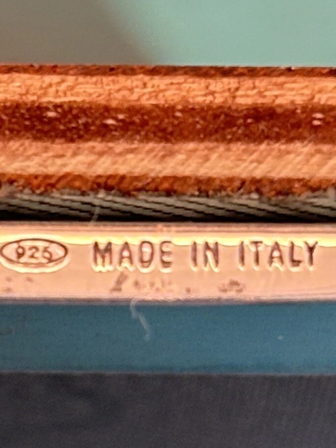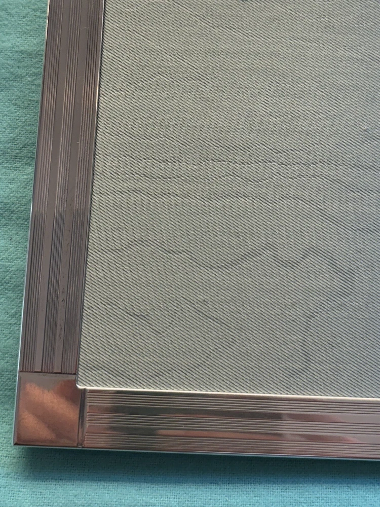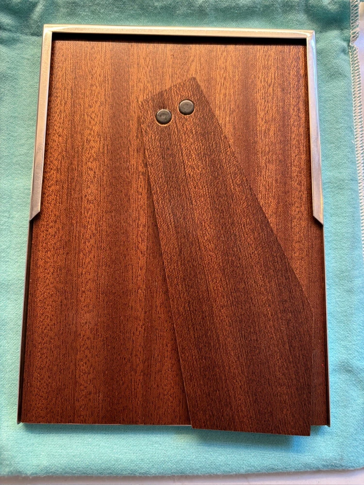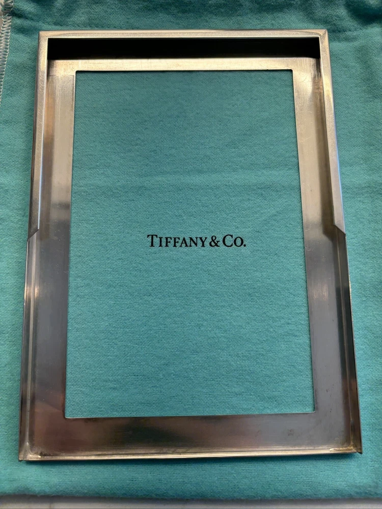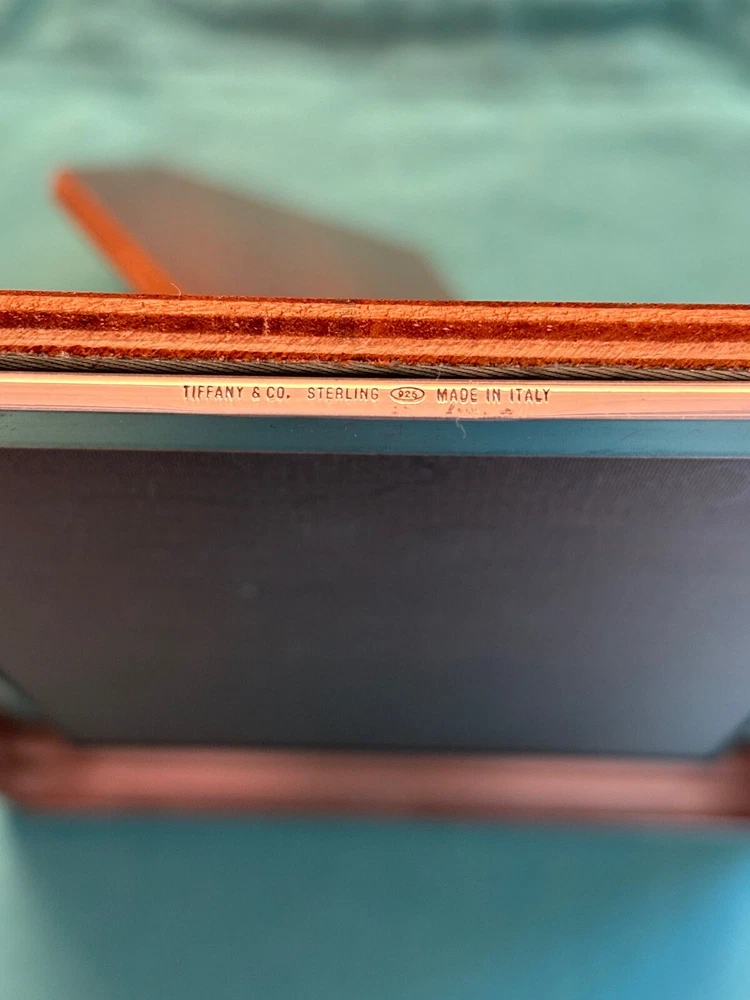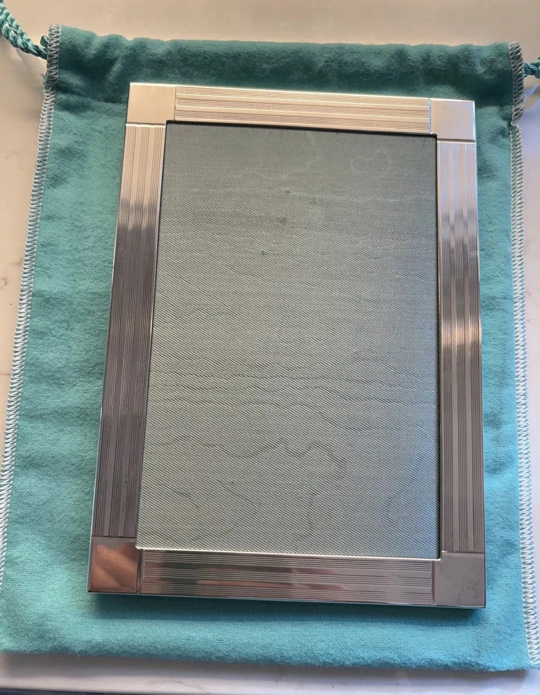 Tiffany & Co. Sterling Silver Engine-Turned Picture Frame 5x7" Vintage 1990s very good pre-owned condition. Art Deco style Engine-turned frame design features square corners and parallel lines. Reverse side and easel back fabricated from lacquered wood. Signed "Tiffany & Co Sterling .925 Made in Italy.” Frame holds a 5x7" photo with a 4x6" window. Interior fabric backing liner shows signs of wear visible when photo is not in place. See close-up photo for markings. This classic frame will fit in with any traditional or modern décor and can be displayed vertically or horizontally. Frame will be delivered packaged in original Tiffany Blue ® tarnish protection flannel bag. PLEASE NOTE: Frame will be shipped without original glass glazing unless specified by the buyer. Original glass is chipped at corners - see last two photos. If buyer specifies original glass to maintain integrity of the item, it will be packaged separately but seller takes no responsibility for condition. Sorry no international shipping.
