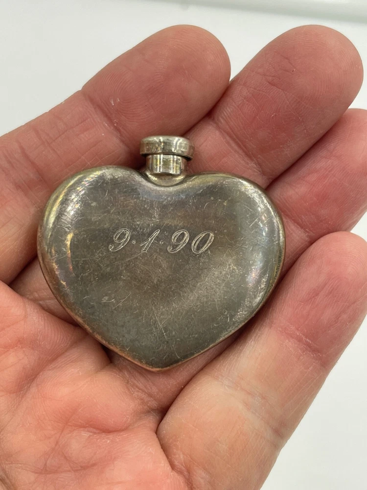 Mid Century Tiffany & Co. Heart shape perfume bottle flask with heavy patina throughout. It's monogrammed shown in the pictures, has light scrathces unpolished. We don't polish any of our vintage items we leave this up to the discretion of the buyer. It measures 1 3/4" by 1", weighing 16.7 grams. Monograms can be easily removed if desired. We are jewelers all of our items are professionally inspected and tested, we guarantee all of our items to be as described. We have many other hard to find items listed so please take a look, you never know what you might find. Thank you and happy shopping.