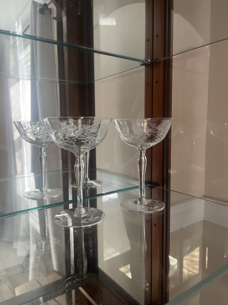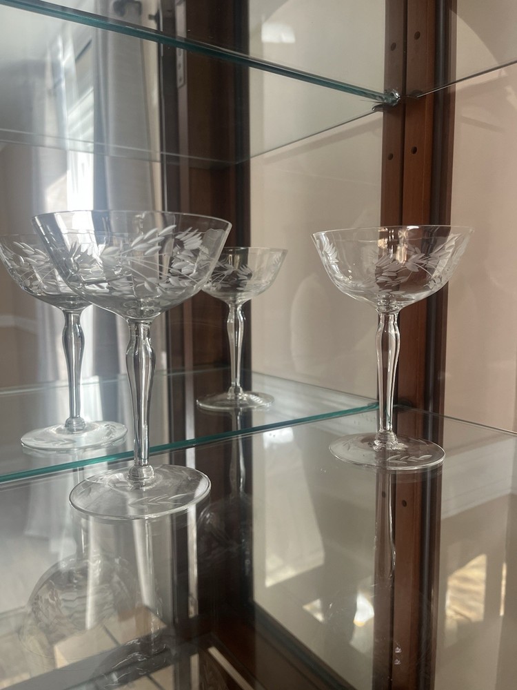 The item in the image is a Tiffin Franciscan "Forever Yours" champagne flute, featuring an etched design of wheat stalks or leaves around the rim. Tiffin-Franciscan Glass company, known for its elegant glassware, produced the "Forever Yours" line, which is recognizable by its delicate etchings. The flute is made of clear glass with a slender stem and a shallow bowl, ideal for serving champagne or other sparkling wines. The etched design adds a touch of sophistication, making it a popular choice for formal occasion