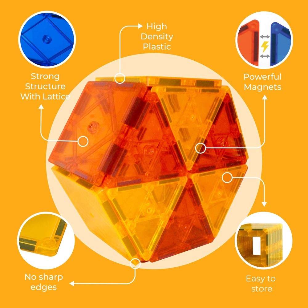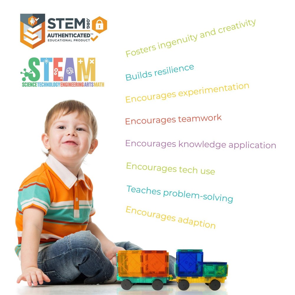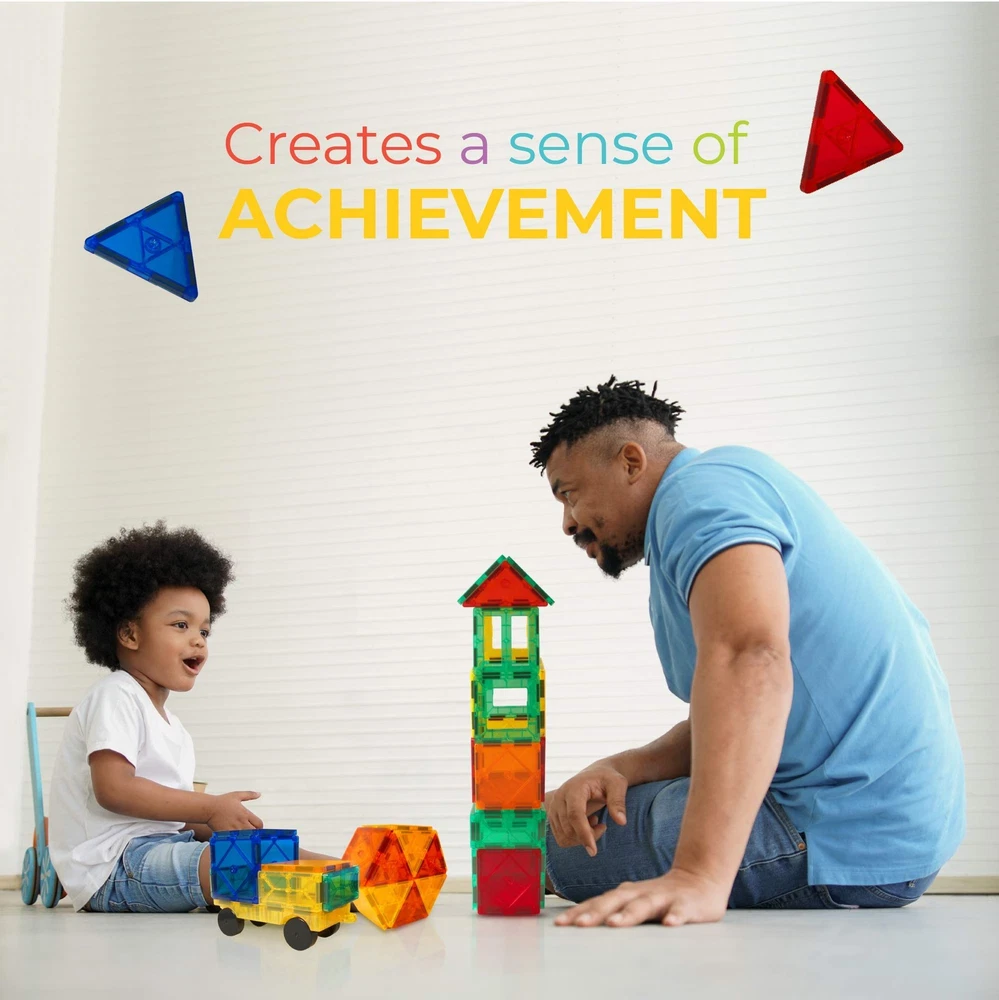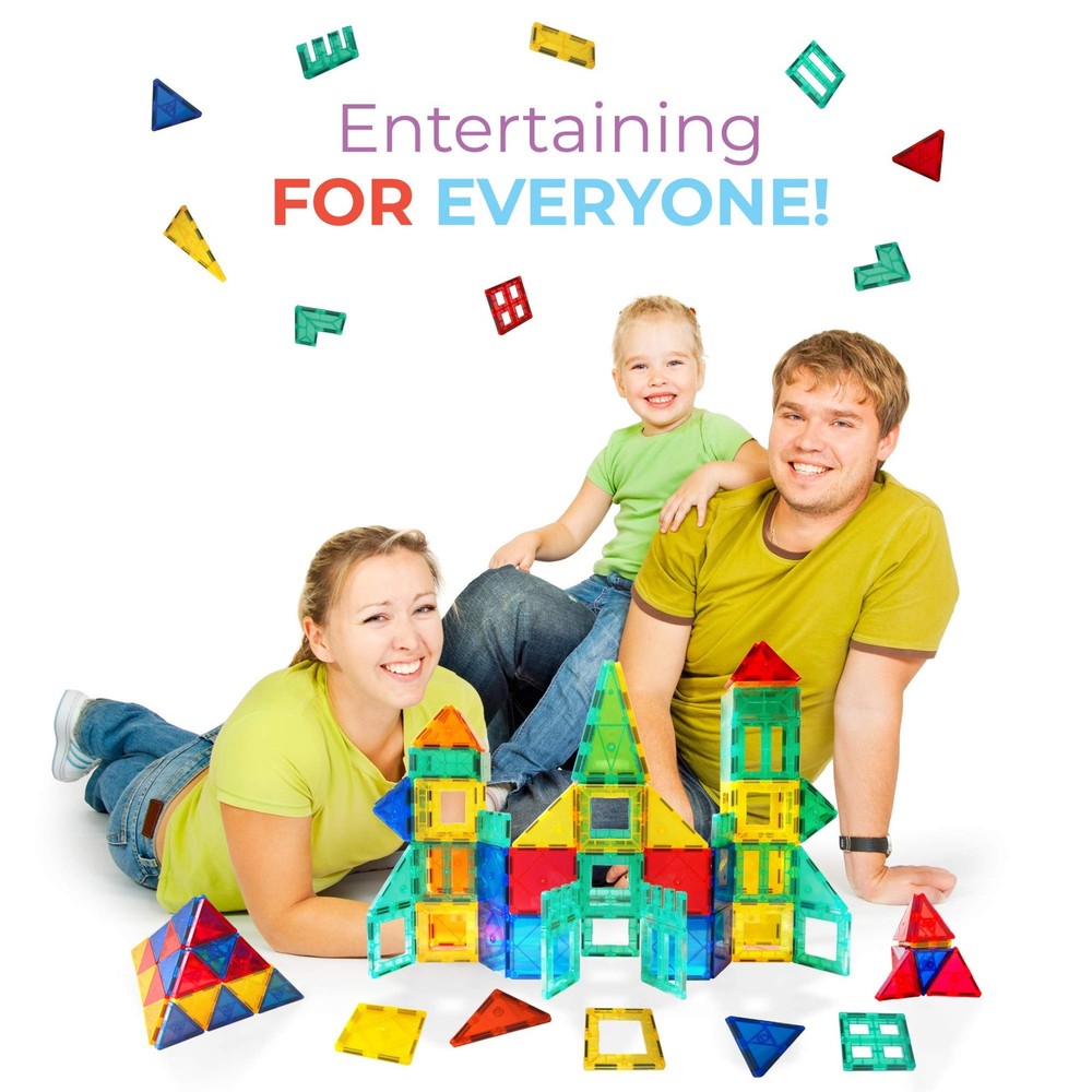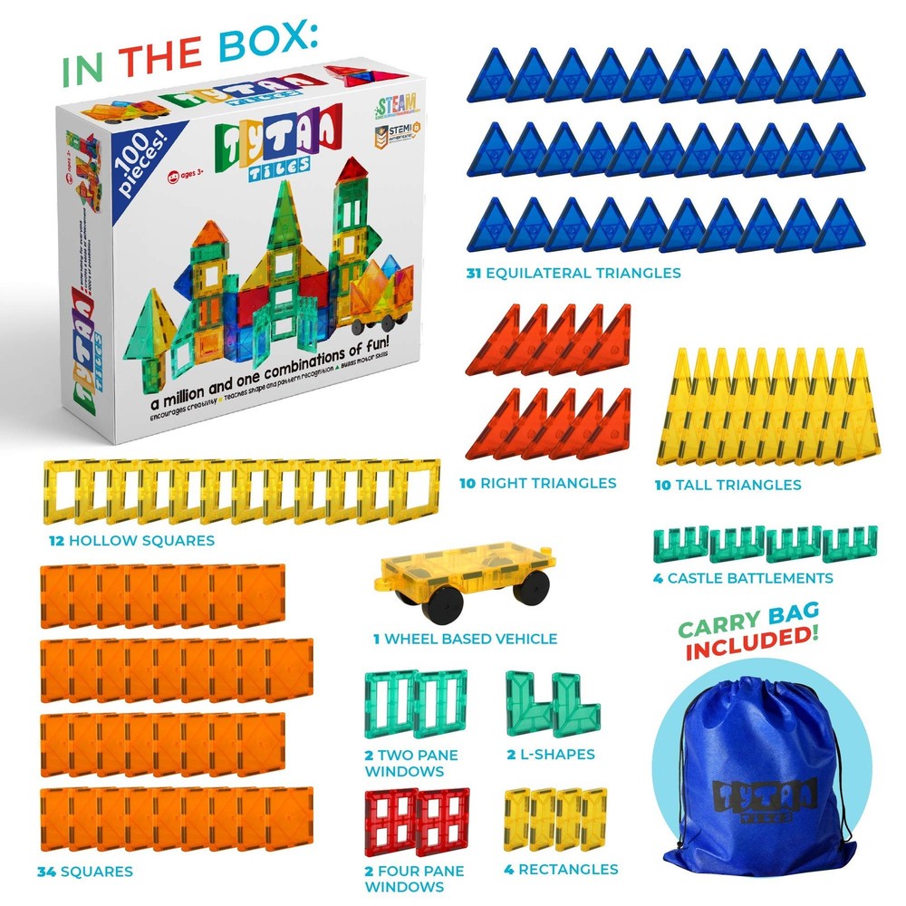 With 100 tiles of various shapes and sizes, kids can build anything their mind imagines through innovative play. With a simple click, these magnetic learning tiles can bring to life 1000s of different creations and dreams. ’s bright, colorful tiles can be crafted into castles, race cars, rocket ships, and so much more. Children will get to explore their imagination and fine-tune their motor skills without sitting in front of a screen. This award-winning set is certified by STEM.org as an educational tool to help develop STEM (Science, Technology, Engineering, and Mathematics) skills. Kids will get work with shapes, pattern recognition, magnetic principles, and architectural building. The 100-piece kit from Tiles is made from environmentally friendly materials, is parent-tested, and has the highest level of CPSA child safety certifications. INCLUDES: 1 Tiles 100-Piece Magnetic Building Set, rolling stand, and carrying bag for portability and stress-free storage. The included WHEELED BASE also makes it possible for the blocks to turn into moveable 3D vehicular structures. Kids can build a car, race across a room, and feel rewarded by their own creativity! BEST VALUE: 100 TILES FOR 1000s OF CREATIONS – With 100 tiles of various shapes and sizes, kids can build anything their mind imagines through innovative play. With a simple click, these magnetic learning tiles can bring to life 1000s of different creations and dreams. CASTLES, RACE CARS, ROCKET SHIPS, & DREAMS – ’s bright, colorful tiles can be crafted into castles, race cars, rocket ships, and so much more. Children will get to explore their imagination and fine-tune their motor skills without sitting in front of a screen. EDUCATIONAL STEM FUN – This award-winning set is certified by STEM.org as an educational tool to help develop STEM (Science, Technology, Engineering, and Mathematics) skills. Kids will get work with shapes, pattern recognition, magnetic principles, and architectural building. HIGHEST LEVEL OF SAFETY CERTIFICATIONS – The 100-piece kit from Tiles is made from environmentally friendly materials, is parent-tested, and has the highest level of CPSA child safety certifications. INCLUDES – 1 Tiles 100-Piece Magnetic Building Set, rolling stand, and carrying bag for portability and stress-free storage. The included WHEELED BASE also makes it possible for the blocks to turn into moveable 3D vehicular structures. Kids can build a car, race across a room, and feel rewarded by their own creativity!