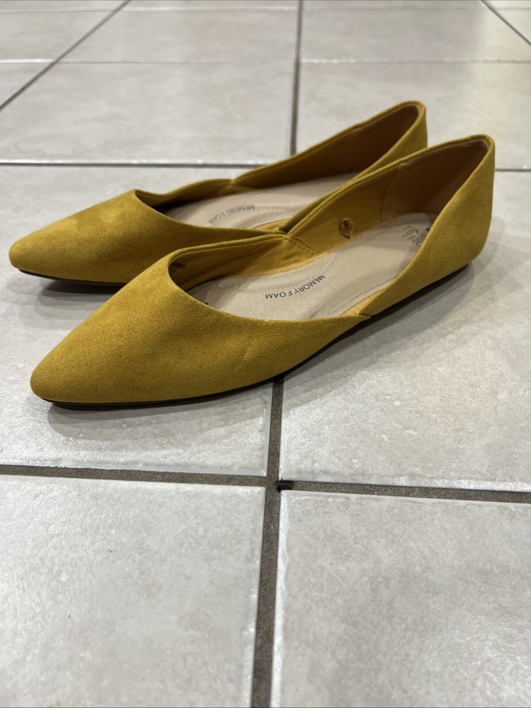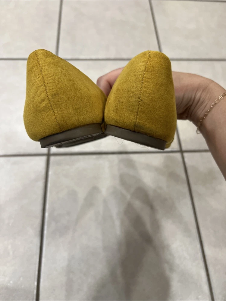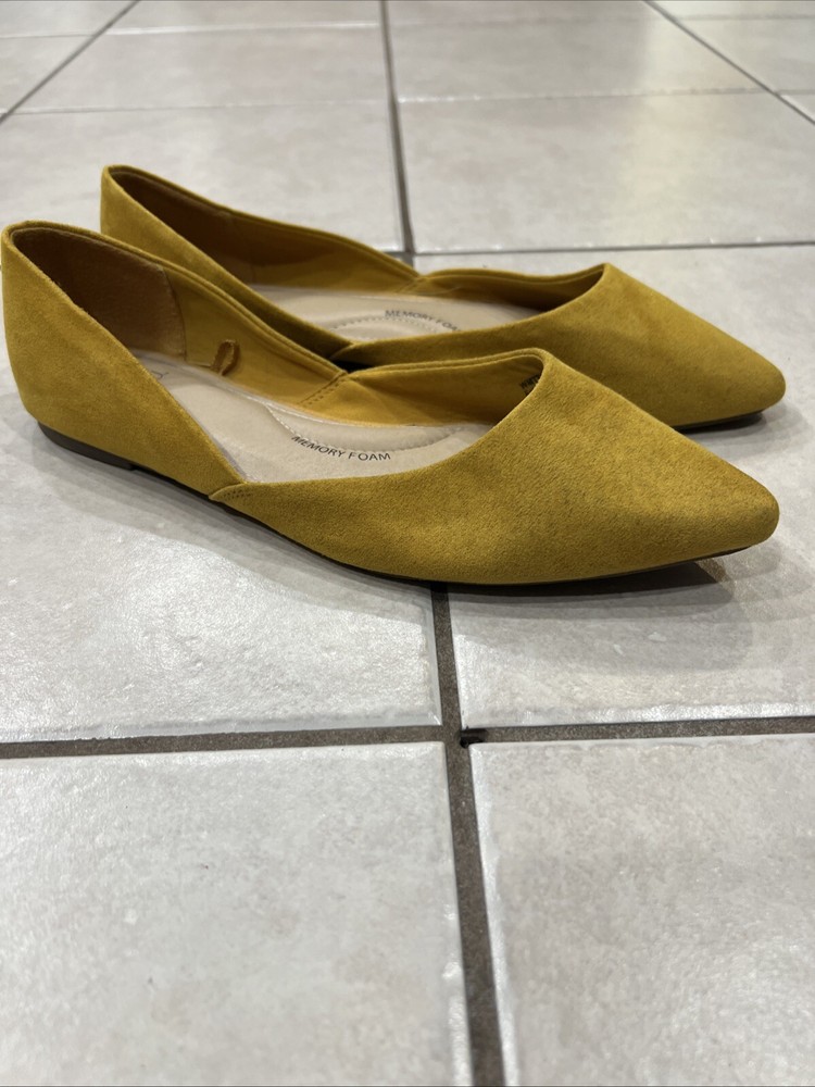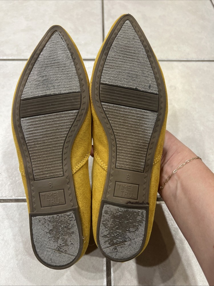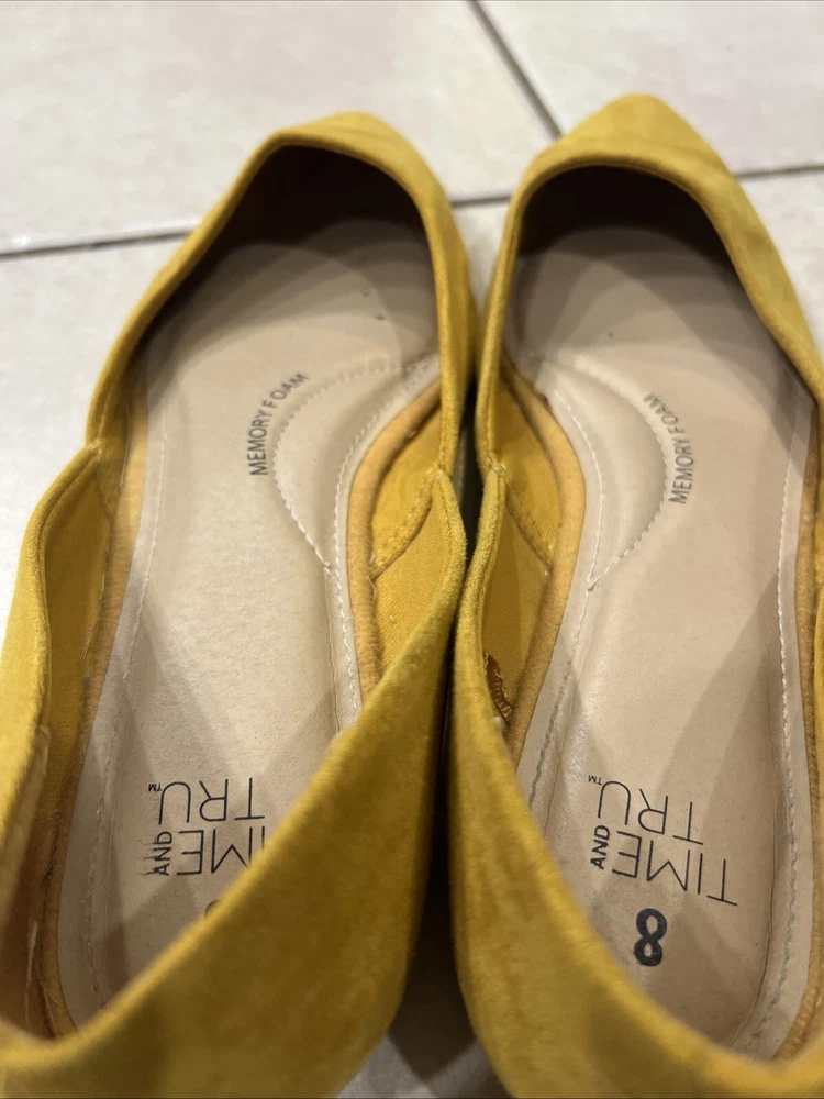Add a pop of color to your shoe collection with these Time And Tru yellow moleskin flats. The fabric upper material is soft and comfortable, perfect for all-day wear. The flat sole provides support and stability, making them a great choice for any casual occasion. These shoes are a size 8 and have never been worn, with tags still attached. Enjoy the stylish and functional design of these flats, perfect for any woman looking for a comfortable and fashionable shoe option.