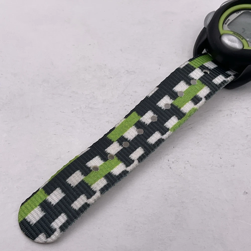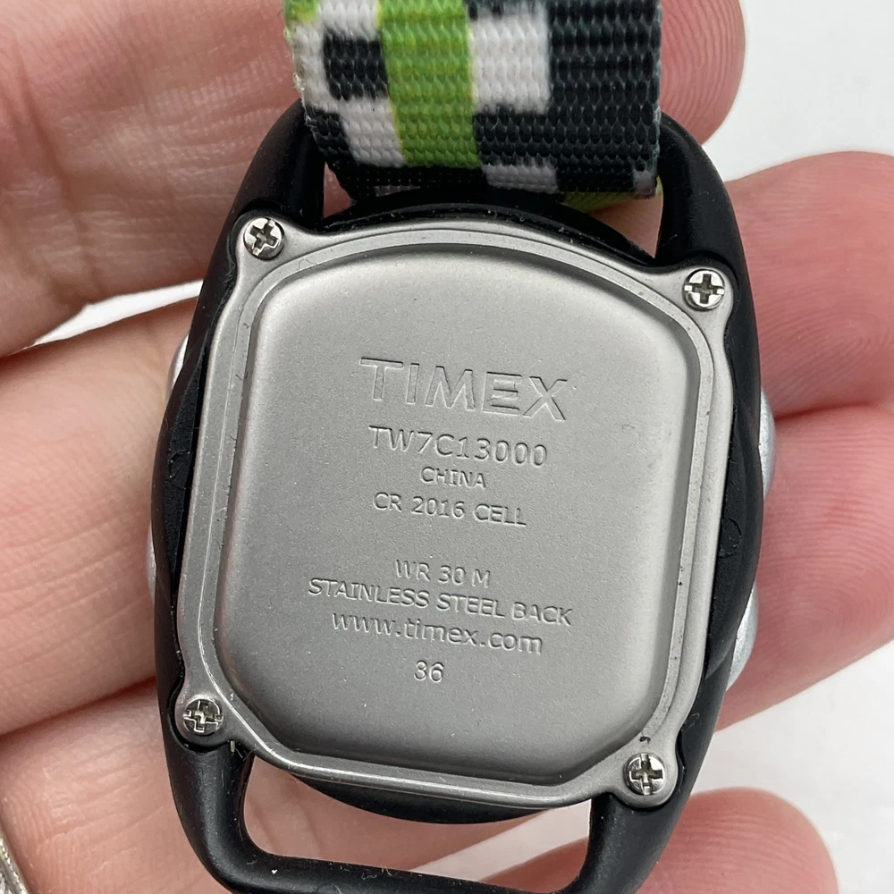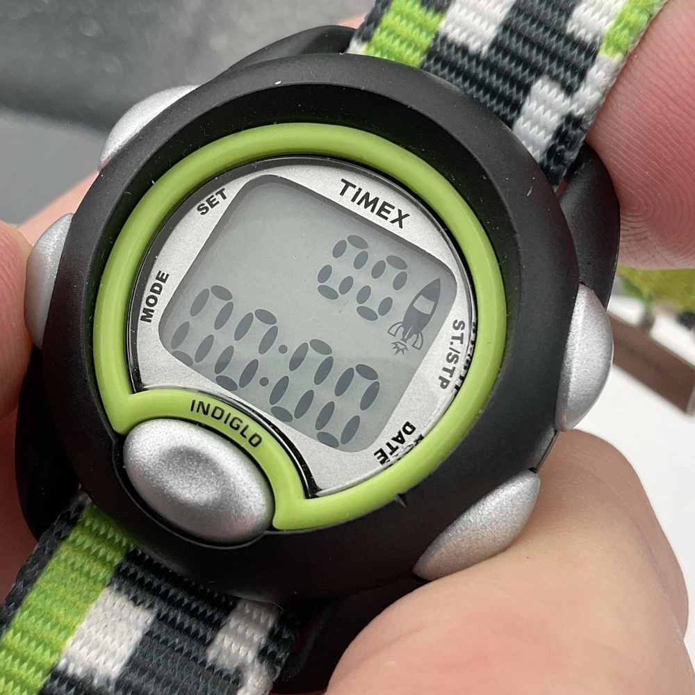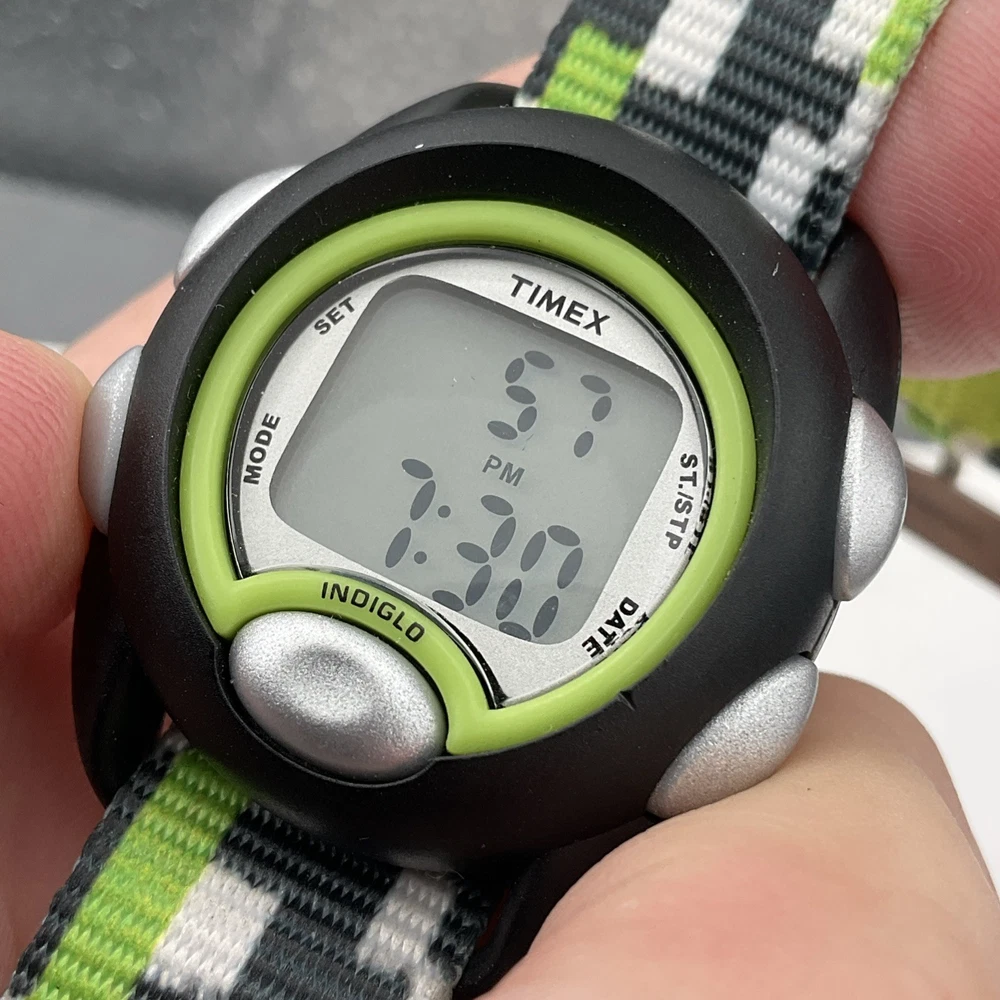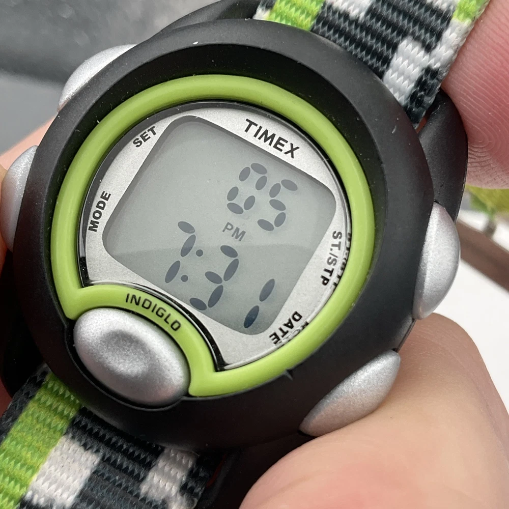 The Timex Time Machines Children's Digital Watch Indiglo is a stylish and durable wristwatch designed for unisex kids. With a canvas strap in white or green, this watch features a buckle closure and a 33mm case size. The silver or black case colour, along with a grey or green dial, gives it a sporty and trendy look. Water-resistant up to 30m, this quartz movement watch is both practical and versatile for everyday wear. The standout feature is the Indiglo display, making it easy to read time in low light conditions. Perfect for young timekeepers, this Timex watch is both functional and fun. THE WATCH IS NEW WITHOUT TAG BOX AND PAPERS SEE PICTURES OF THE ACTUAL WATCH FOR SALE THANKS FOR LOOKING