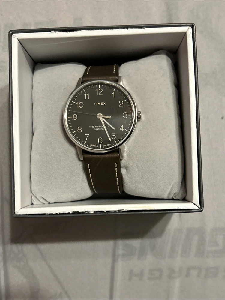 This Timex Waterbury Classic Watch is a stylish and functional timepiece suitable for both men and women. It features a quartz movement, buckle closure, and a silver case color with a brown band color. The watch was manufactured in 2020 or later and is part of the modern age group (2000-present). The Timex Waterbury watch has a mineral crystal display and comes with its original box/packaging. It is a unisex watch, with a left-handedness option, and is perfect for any occasion. The watch is categorized under Jewelry & Watches, Watches, Parts & Accessories, and Wristwatches. Get your hands on this classic watch today!