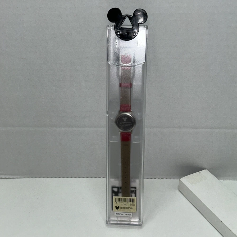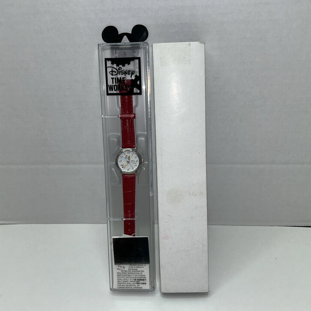 This is a Tinkerbell Walt Disney Time Works watch with a red band, still in its original factory case. The watch is made of imitation leather and was manufactured in Japan. It is a part of the Disney franchise and features the Tinkerbell character. The watch has not been modified and is in excellent condition. Perfect for collectors of contemporary Disneyana and timepieces.