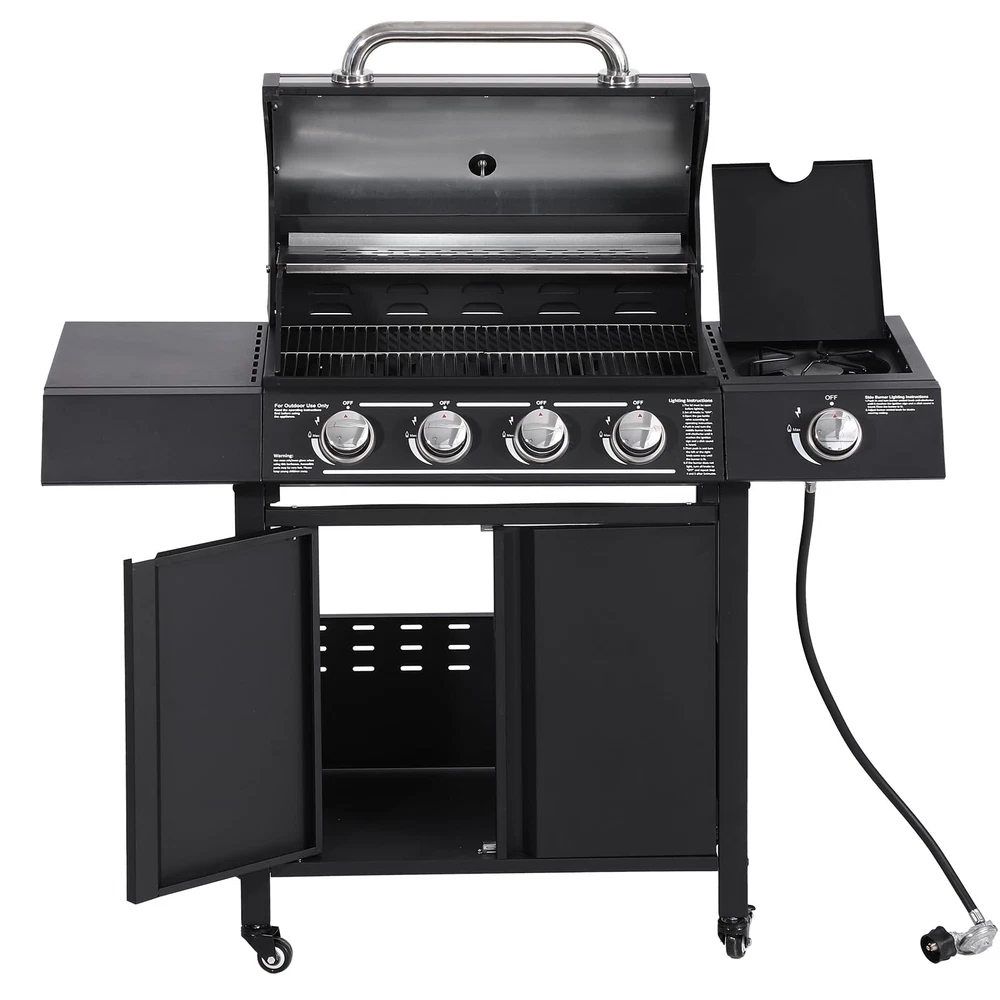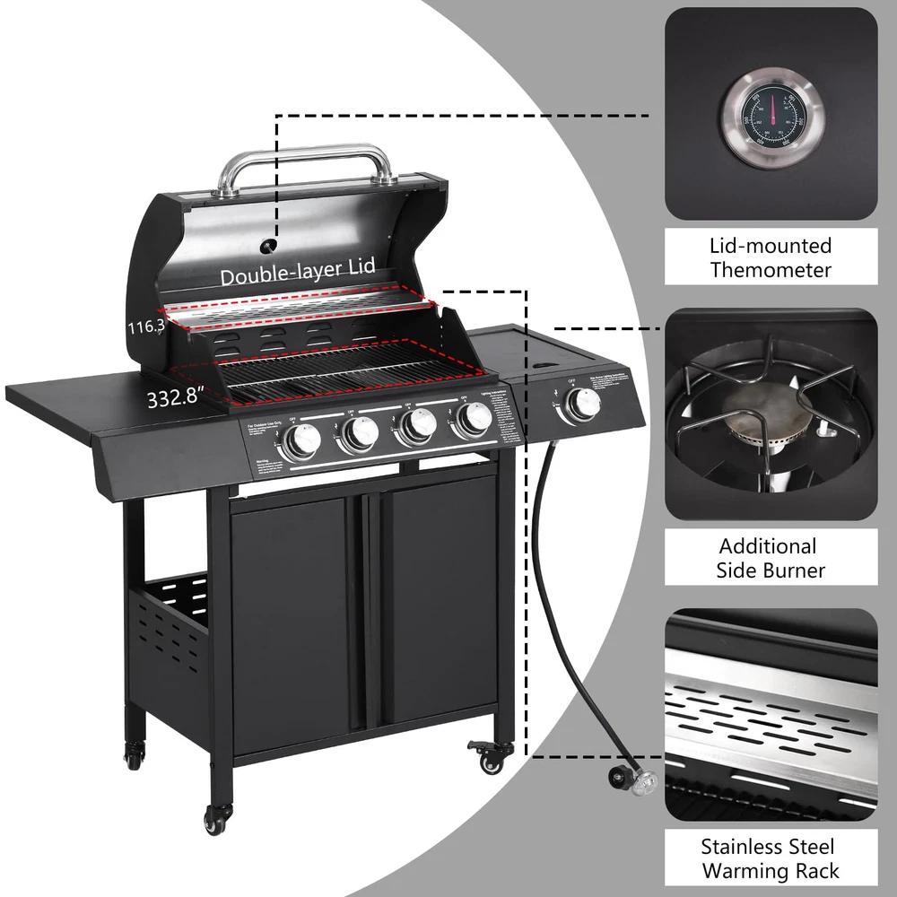 【Stainless Steel BBQ Grill】Cooking grates are made of durable, easy-to-clean stainless steel material which helps prevent rusting and cracking. The stainless steel flame tamers distribute even heat to every inch of cooking grates so that you can sear steak very well. 【50,000 BTUS Cooking Power】4 burners and side burner for ideal heat control with convenient ignite system, quick start up with the push & turn of a control knob. Gas grill provide a total 50,000 BTU of cooking power including 40,000BTU main cooking space and 10,000 BUT side burner. 【Spacious Cooking Area】474 sq.in. cooking area is very suitable for family use. Among them, the stainless steel grilling area is 360 sq. inch and the warming area is 114 sq inch, which is suitable for family/friends gatherings on weekends. 【Additional Prep Space】One side table is durable and offer more work and preparation space for seasonings and grilling tools to keep them within arm's reach. At the same time, the kettle can be placed on the side burner, to ensure that there is always hot water available to drink. 【Dimension & Warranty】Outdoor grill dimensions -14.9"D x 47"W x 42.5"H | Primary cooking area - 24.2"L x 14.9"W | Warming rack area -24.2"L x 4.7"W | The height of the cooking space(from grill to top of closed lid) - 14.9".