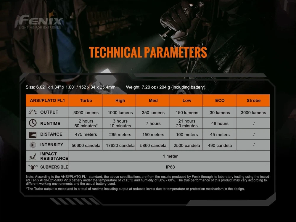 Item Package Quantity: 1 Batteries Required?: Yes Special Feature: Rechargeable Light Path Distance: 1558 Feet Number of Batteries: 1 Lithium Ion batteries required. (included) Batteries Included?: Yes Battery Description: LED Specification Met: IP68 water resistance Power Source: Battery Powered Warranty Type: Limited Warranty Battery Cell Composition: Lithium Ion Package Dimensions: 9.96 x 5.79 x 1.81 inches Color: Black Light Source Type: LED Finish types: Aluminum Batteries: 1 Lithium Ion batteries required. (included) Item model number: EDB-FEN-TK20RV2-BBX5 Included Components: Batteries included Country of Origin: China Type: Does not apply gtin13: 313031257238 White Brightness: 3000 Lumens Recommended Uses For Product: Outdoor Special Features: Rechargeable Brightness: 3000 Lumen Water Resistance Level: Waterproof Material: Aluminum Finish Type: Aluminum Item Weight: 7.2 ounces Manufacturer: Flashlights Part Number: EDB-FEN-TK20RV2-BBX5 Brand: Does not apply UPC: 313031257238