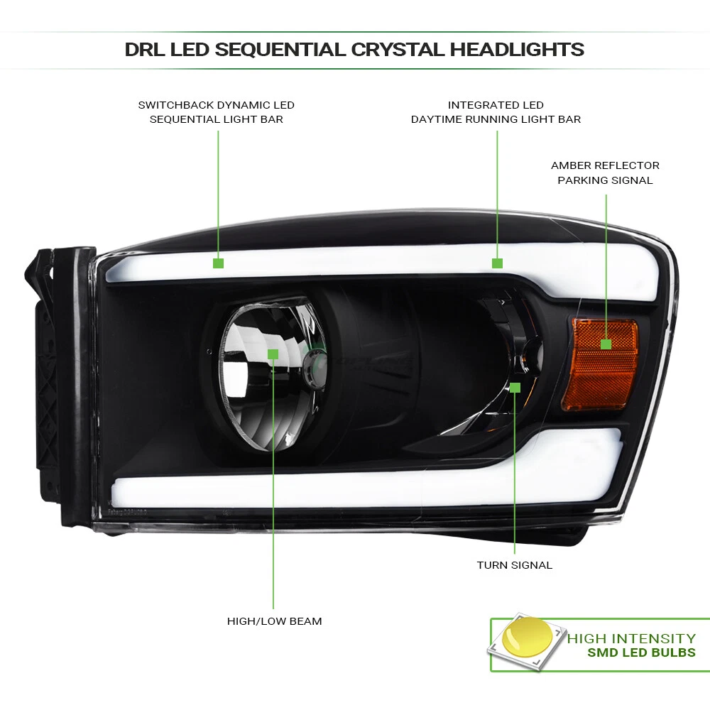 Powered by Frooition Save up to 5% daily deals shop now TLAPS For 06-09 Ram Switchback Sequential LED Blk Headlights Amber+Matte V Grill TLAPS For 06-09 Ram Switchback Sequential LED Blk Headlights Amber+Matte V Grill Part Number: hlnb-ram06lsq-jdma+fggg-grzv-ram06-vt-mb-201 Description Description Payment Shipping Return & Refund Feedback Description Item Description Switchback Sequential Crystal Headlights Video will open in a new window Using the eBay App? Paste link into a browser window: [isdntekvideo] Application For 2006-2008 Dodge Ram 1500 Models 2006-2009 Dodge Ram 2500 / 3500 Models ( Will Not Fit Diesel Models ) Description Switchback Sequential Crystal Headlights & Front Grill Grille Features Headlights : Custom Design With Switchback Fiber Optic Sequential LED Strips New Technology High Intensity SMD LED Tube Bar Switchback LED Using A Dual Filament Socket, LED Bulbs Light Up With White As The Low-Filament Running Light And Switch To Bright Amber Anytime You Toggle That Turn Signal Sequential Function Provided By Multiple Lit Elements That Illuminate Sequentially Rather Than Simultaneously. The Visual Effect Is One Of Outward Motion In The Direction Of The Intended Turn Or Lane Change Daytime Running Light Can Be Help Other Road Users Identify & Better Visibility On Road Offers Extra Smooth & Bright Light During Day / Night Time Brings Significant Exterior Upgrade, Give Your Vehicle An Unique Look Front Grille : Luxury Sport Vertical Style Product Details • 100% Brand New In Stock, Item Exactly As The Picture Shown • Comes With A Complete Set ( Driver & Passenger Side ) • Direct Bolt-On Replacement • Instruction Is Not Included, Highly Recommend To Install By Professional Mechanic • Modification Might Require For Using HID Lighting System • Dramatically Improve Both Styling & Appearance • Please Go Check Out Our Ebay Store For More Additional Hot Items Technical Tips : For Cars That Do Not Have Daytime Running Light ( DRL ) Function: The Lights / HALO / LED Part Can Serve As / Give Out Daytime Running Light ( DRL ) As Extra Functions But In Order For It to Work, You Might Need Modifications To The Wirings And Plugs. Additional Wirings & Plugs For Daytime Running Light ( DRL ) Function Will Not Be Provided. Please Advice Mechanics For Installation & Remember that Professional Installation Is Always Highly Recommended. Please make sure all Headlights are install properly, sockets are tightly fastened and all O-rings or rubber gaskets are in great condition. Broken or loose O-rings or rubber gaskets on your factory sockets can cause moisture in your lights ( It can damage your light bulb ). If you happen to have moisture buildup in your lights, please try the following solution. simply remove the lights from the vehicle and set out in the sun or in a dry area for at least few hours. Wait until the moisture has fully evaporated, and reseal around the seams with a clear silicone sealant on the assembly and replace any worn down O-rings or rubber gaskets. This should alleviate the condensation issue. Payment Payment Please complete the Ebay checkout within 3 days after winning. Payment is expected within 3 days after auction ends. Product availability is not guaranteed after 3 days. PAYPAL payment is for US. customer only and we only ship to PayPal confirmed address, no exception. PAYPAL payment ( in USD ) is the only payment method will be accepted for International Buyers. Insufficient payment amount or missing information will delay the process of order, please read the invoice carefully. Shipping Shipping U.S. 48 Contiguous States Shipping Service: UPS / Fedex Ground Price: $ 0 Transit Time: 1-7 Days With Tracking U.S. 48 Contiguous States ( Express Shipping Service ) Shipping Service: FedEx 2Day Price: $ 331 Transit Time: 1-3 Days With Tracking Canada Shipping Service: Fedex International Economy Price: $ 349 Transit Time: 2-5 Business Days With Tracking ( Brokerage Fee Is Included ) Alaska & Hawaii Shipping Service: FedEx 2Day Price: $ 331 Transit Time: 1-3 Days With Tracking International ( U.K. Europe, Australia Only ) Shipping Service: Not Available Price: $ Not Available Transit Time: Not Available There will be 9.5% Sales Tax on the Total sales price With Shipping Cost for California Buyers. " Free Shipping " Services, If offer, is for US Lower 48 States Buyers Only. Alaska & Hawaii will have a different Shipping rate. We accept Paypal / Credit Card payment through Ebay Checkout ONLY. We only ship to Paypal Confirmed Address as this is recommended for both buyer and seller protection. Most of the orders will be shipped out from our main warehouse CA 91789 within 24-48 hours after payment is cleared. The transit time is provided by the shipping carrier based upon the item is picked up. Additional shipping charge will be applied to reship for incorrect address entered by the buyer at checkout. We DO NOT Ship to PO Box , APO, FPO, Puerto Rico , Virgin Islands, Guam , American Samoa , Minor Outlying Islands , Northern Mariana Islands. International & Canada buyers are responsible for any possible brokerage/custom fee. Please consult with your local post office or authority for details. All International countries except CANADA. If Buyer can't find their country shipping rate in the Ebay shipping info, We apologize that we couldn't process the shipment to those countries which are not listed. Alaska & Hawaii Buyers Attention: Please only choose The Correct Shipping Method That Shown On The Shipping Table For ALASKA & HAWAII at the Ebay checkout to complete the transactions. It is the only shipping method that we provide for customers on U.S. territories outside the lower 48 states. Wrong shipping method selected will put the order on hold for insufficient shipping fee paid. There are shipping size limitation on certain items such as body parts that we are not be able to ship to AK/HI. Please feel free to contact us prior to bidding. We do provide Combined Shipp