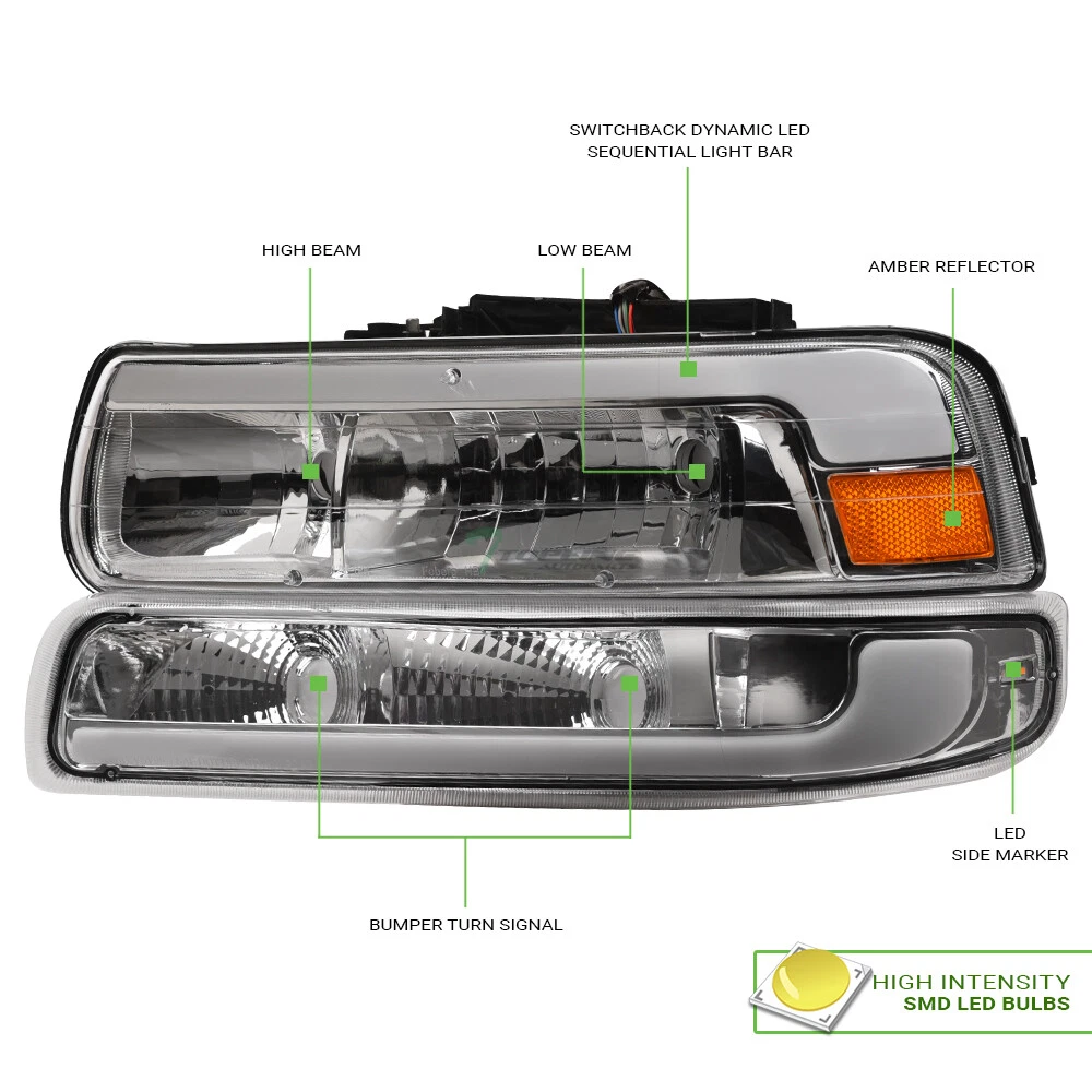 Powered by Frooition Save up to 5% daily deals shop now TLAPS For 99-02 Silverado Sequential LED Chrome Headlights Am+Matte Blk M Grille TLAPS For 99-02 Silverado Sequential LED Chrome Headlights Am+Matte Blk M Grille Part Number: hlnb-sil994plsq-cha+fg-sil99-me-mb-201 Description Description Payment Shipping Return & Refund Feedback Description Item Description Application For 1999-2002 Chevy Silverado 1500 / 2500 Models 2000-2006 Chevy Tahoe All Models 2000-2006 Chevy Suburban All Models ( Will Not Fit On Silverado Heavy Duty 1500 HD / 2500 HD / 3500 Models Unless Modification Is Made With the Bumper Cover ) Description Switchback Sequential Crystal Headlights ( Comes With Bumper Lamps, 4-Pieces Combo ) & Front Grill Grille Features Headlights : Custom Design With Switchback Fiber Optic Sequential LED Strips New Technology High Intensity SMD LED Tube Bar Switchback LED Using A Dual Filament Socket, LED Bulbs Light Up With White As The Low-Filament Running Light And Switch To Bright Amber Anytime You Toggle That Turn Signal Sequential Function Provided By Multiple Lit Elements That Illuminate Sequentially Rather Than Simultaneously. The Visual Effect Is One Of Outward Motion In The Direction Of The Intended Turn Or Lane Change Daytime Running Light Can Be Help Other Road Users Identify & Better Visibility On Road Offers Extra Smooth & Bright Light During Day / Night Time Brings Significant Exterior Upgrade, Give Your Vehicle An Unique Look Front Grille : Luxury Sport Mesh Style Product Details • 100% Brand New In Stock, Item Exactly As The Picture Shown • Comes With A Complete Set ( Driver & Passenger Side ) • Direct Bolt-On Replacement • Instruction Is Not Included, Highly Recommend To Install By Professional Mechanic • Modification Might Require For Using HID Lighting System • Dramatically Improve Both Styling & Appearance • Please Go Check Out Our Ebay Store For More Additional Hot Items Technical Tips : For Cars That Do Not Have Daytime Running Light ( DRL ) Function: The Lights / HALO / LED Part Can Serve As / Give Out Daytime Running Light ( DRL ) As Extra Functions But In Order For It to Work, You Might Need Modifications To The Wirings And Plugs. Additional Wirings & Plugs For Daytime Running Light ( DRL ) Function Will Not Be Provided. Please Advice Mechanics For Installation & Remember that Professional Installation Is Always Highly Recommended. Please make sure all Headlights are install properly, sockets are tightly fastened and all O-rings or rubber gaskets are in great condition. Broken or loose O-rings or rubber gaskets on your factory sockets can cause moisture in your lights ( It can damage your light bulb ). If you happen to have moisture buildup in your lights, please try the following solution. simply remove the lights from the vehicle and set out in the sun or in a dry area for at least few hours. Wait until the moisture has fully evaporated, and reseal around the seams with a clear silicone sealant on the assembly and replace any worn down O-rings or rubber gaskets. This should alleviate the condensation issue. Payment Payment Please complete the Ebay checkout within 3 days after winning. Payment is expected within 3 days after auction ends. Product availability is not guaranteed after 3 days. PAYPAL payment is for US. customer only and we only ship to PayPal confirmed address, no exception. PAYPAL payment ( in USD ) is the only payment method will be accepted for International Buyers. Insufficient payment amount or missing information will delay the process of order, please read the invoice carefully. Shipping Shipping U.S. 48 Contiguous States Shipping Service: UPS / Fedex Ground Price: $ 0 Transit Time: 1-7 Days With Tracking U.S. 48 Contiguous States ( Express Shipping Service ) Shipping Service: FedEx 2Day Price: $ 242 Transit Time: 1-3 Days With Tracking Canada Shipping Service: Fedex International Economy Price: $ 272 Transit Time: 2-5 Business Days With Tracking ( Brokerage Fee Is Included ) Alaska & Hawaii Shipping Service: FedEx 2Day Price: $ 242 Transit Time: 1-3 Days With Tracking International ( U.K. Europe, Australia Only ) Shipping Service: Not Available Price: $ Not Available Transit Time: Not Available There will be 9.5% Sales Tax on the Total sales price With Shipping Cost for California Buyers. " Free Shipping " Services, If offer, is for US Lower 48 States Buyers Only. Alaska & Hawaii will have a different Shipping rate. We accept Paypal / Credit Card payment through Ebay Checkout ONLY. We only ship to Paypal Confirmed Address as this is recommended for both buyer and seller protection. Most of the orders will be shipped out from our main warehouse CA 91789 within 24-48 hours after payment is cleared. The transit time is provided by the shipping carrier based upon the item is picked up. Additional shipping charge will be applied to reship for incorrect address entered by the buyer at checkout. We DO NOT Ship to PO Box , APO, FPO, Puerto Rico , Virgin Islands, Guam , American Samoa , Minor Outlying Islands , Northern Mariana Islands. International & Canada buyers are responsible for any possible brokerage/custom fee. Please consult with your local post office or authority for details. All International countries except CANADA. If Buyer can't find their country shipping rate in the Ebay shipping info, We apologize that we couldn't process the shipment to those countries which are not listed. Alaska & Hawaii Buyers Attention: Please only choose The Correct Shipping Method That Shown On The Shipping Table For ALASKA & HAWAII at the Ebay checkout to complete the transactions. It is the only shipping method that we provide for customers on U.S. territories outside the lower 48 states. Wrong shipping method selected will put the order on hold for insufficient shipping fee paid. There are shipping size limitation on certain items such as body parts that we are not be able to ship to AK/HI. Please feel free to contact us prior to bidding. W