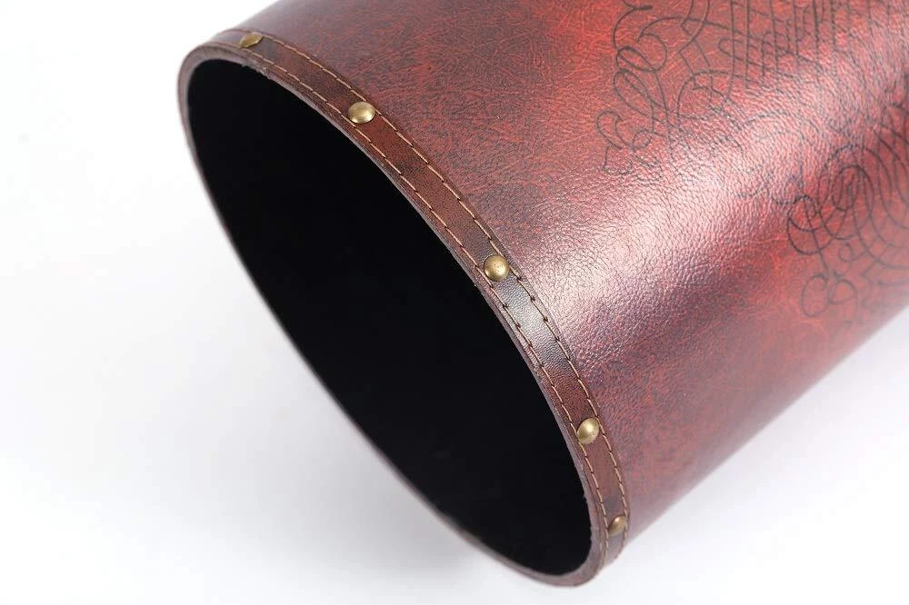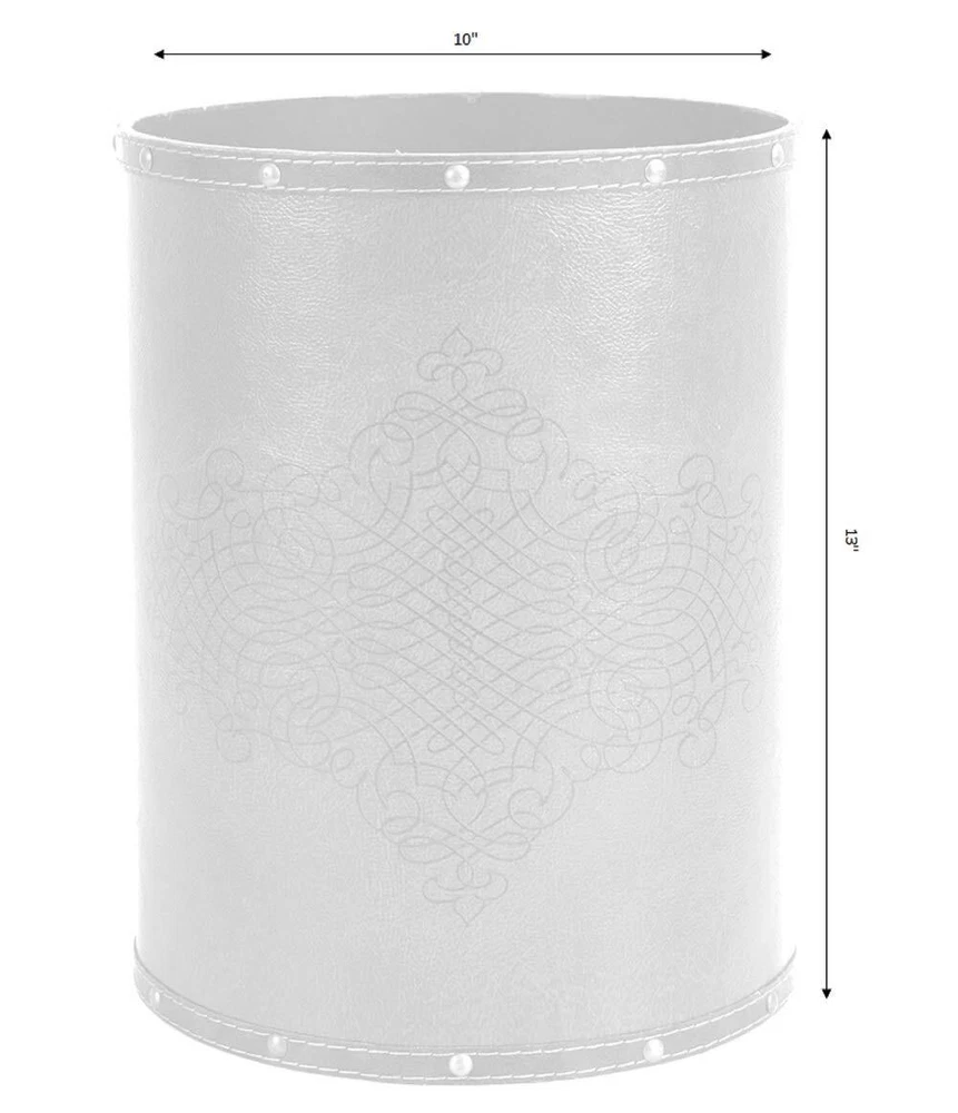 This antique attractive waste paper basket, will add a beautiful decorative accent touch for your home or office. a solidly crafted wood bin, covered in leather design, you will love this. Approx. Dimension: 10" X 10" X 13"High Great for use in bathroom, bedroom, office, and living room Material: Antique crafted design faux leather wrapped on fiber Wood Color: Antique Cherry