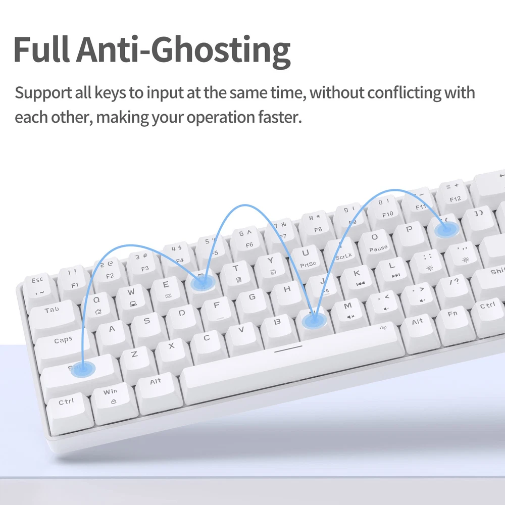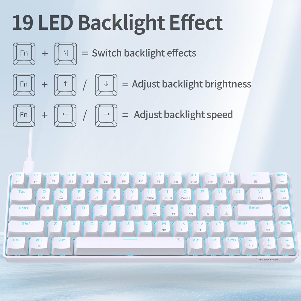 Cool LED Backlighting: T68SE gaming keyboard is fixed lighting color.There is 19 built-in backlights mode with shortcut keys to adjust backlight brightness and speed. Due to the iterative transparent word colour of the keycap that you may receive a Mixed light or single light. Compact & Practical 60% Layout: T68SE mechanical keyboard features a 68-key design with separate arrow keys and commonly used control keys. The included power cord is plug-and-play. Combines practicality, full functionality and portability . Mechanical Red Switch: Linear red switch without a tactile bump. A favorite for gamers who require quick responses with minimal resistance or for those seeking a quiet typing experience. Efficient & Comfortable Operation: The T68SE 60 percent keyboard based on ergonomics, scientific stepped keycap design provides maximum comfort. Support full key anti-ghosting.Keep you away from lag and enjoy efficient and smooth gaming typing. Compatibility & After-sales Service: Suitable for Windows 11/10/8/7/XP. Mac OS, Vista, and Linux are compatible with typing and office only.TMKB product support one year warranty, if you encounter any problems, please feel free to contact us, give you a satisfactory answer within 24 hours.