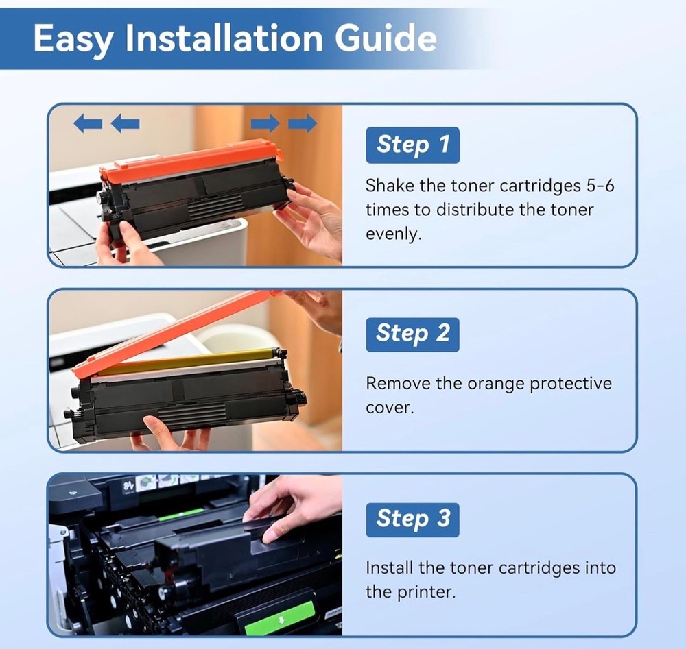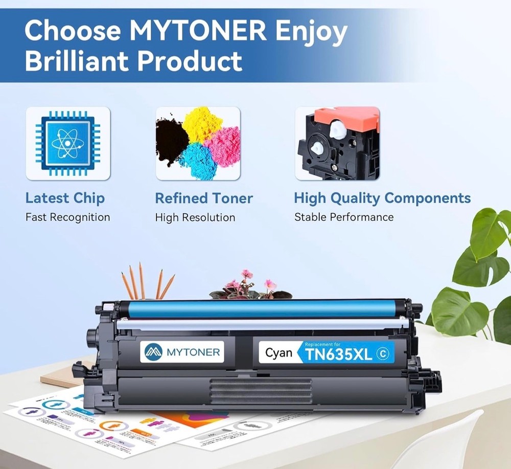 #3561 MYTONER Compatible Toner Cartridge Replacement for Brother TN635XL TN-635XL TN635 for HL-L8430CDW HL-L8430CDWT HL-L8570CDW MFC-L8730CDW MFC-L8930CDW MFC-L8970CDW MFC-EX575 Printer (4 Pack, B/C/M/Y) Brand MYTONER Color TN635XL Toner Cartridge Black Cyan Yellow Magenta Included Components Toner Cartridge Compatible Devices Work for HL-L8430CDW, HL-L8430CDWT, HL-L8570CDW, MFC-L8730CDW, MFC-L8930CDW, MFC-L8970CDW, MFC-EX575 Compatibility Options Compatible with HL-L8430CDW, HL-L8430CDWT, HL-L8570CDW, MFC-L8730CDW, MFC-L8930CDW, MFC-L8970CDW, MFC-EX575 Page Yield 5500 [Compatible Model]: HL-L8430CDW, HL-L8430CDWT, HL-L8570CDW, MFC-L8730CDW, MFC-L8930CDW, MFC-L8970CDW, MFC-EX575 [High Page Yield]: Up to 5,500 pages for TN635XL TN635 black toner cartridge, Up to 4 ,500 pages for TN635XL TN-635XL color toner cartridges (at 5% coverage - letter/A4) [What’s in the box]: 1 x TN635XL TN-635XL black toner; 1 x TN635XL TN-635XL cyan toner; 1 x TN635XL TN-635XL yellow toner; 1 x TN635XL TN-635XL magenta toner [Replacement Model]: MYTONER TN635XL TN-635XL TN635 toner compatible with Brother TN635XL TN-635XL TN635 for printer [Print Quality]: MYTONER TN635XL TN-635XL TN635 toner cartridges produce clear and long-lasting prints with sharp text and vibrant colors, and are engineered to maintain consistent print quality throughout their lifespan, ensuring that your prints look great from the first page to the last What's in the box Toner Cartridge