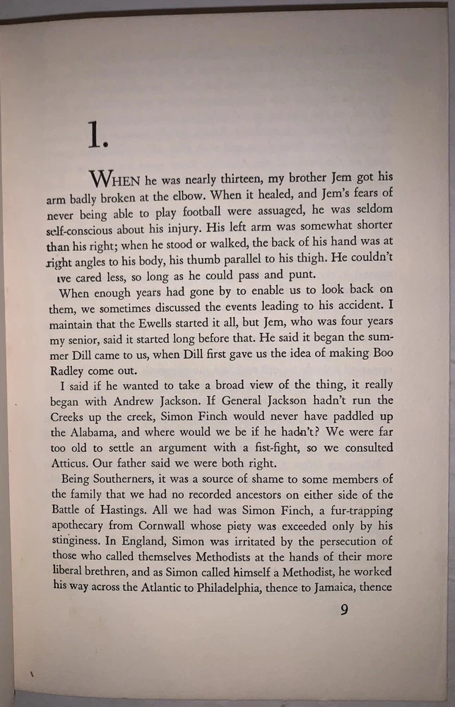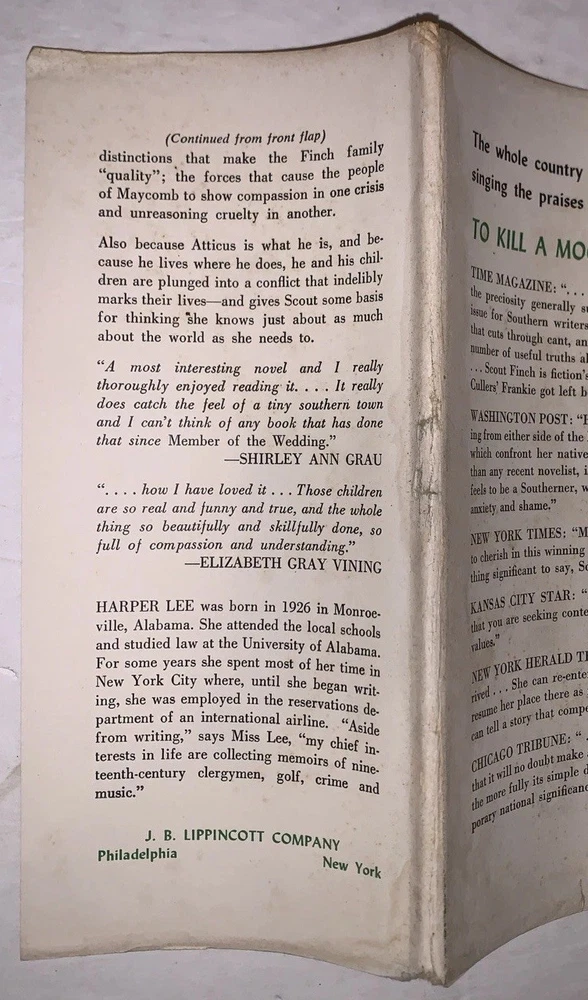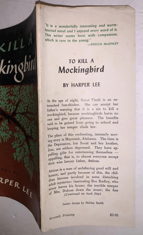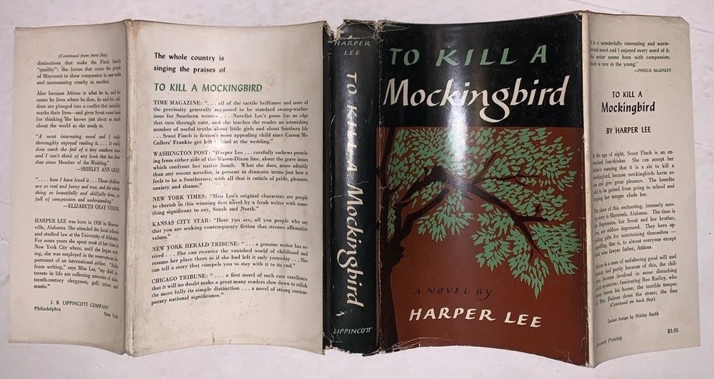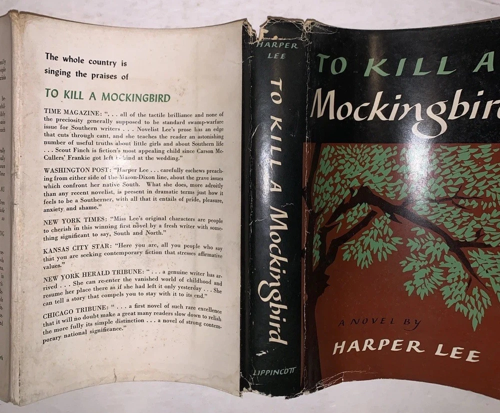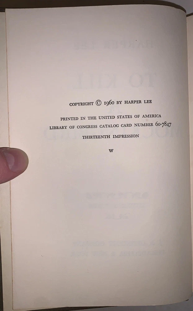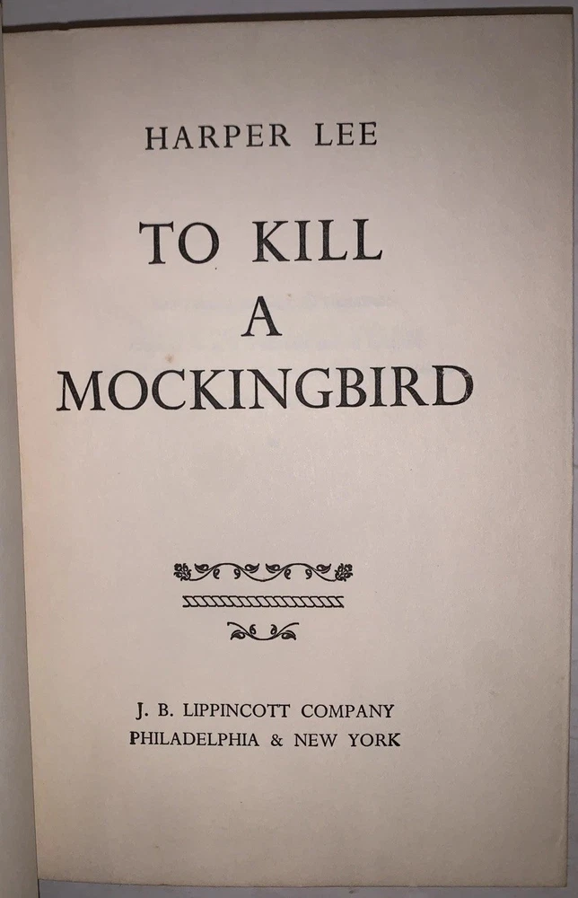 To Kill A Mockingbird by Harper Lee Philadelphia & New York: J. B. Lippincott Company 1960 Book Club Edition. Thirteenth Impression, With a Dust jacket from another copy with indication of seventh Printing. Octavo, 296 pages, publisher's original color pictorial dust jacket with the original price unclipped. Publisher's original green cloth over grey boards. A few tears and some discoloration to the dust jacket, minor rubbing, else in good + condition. This auction has no reserve, an opening bid of only $0.01, and free shipping. If you have any questions, feel free to ask, and don't forget to check out my other listings.