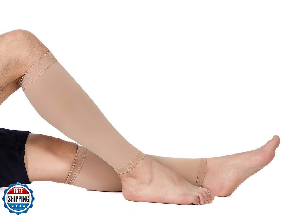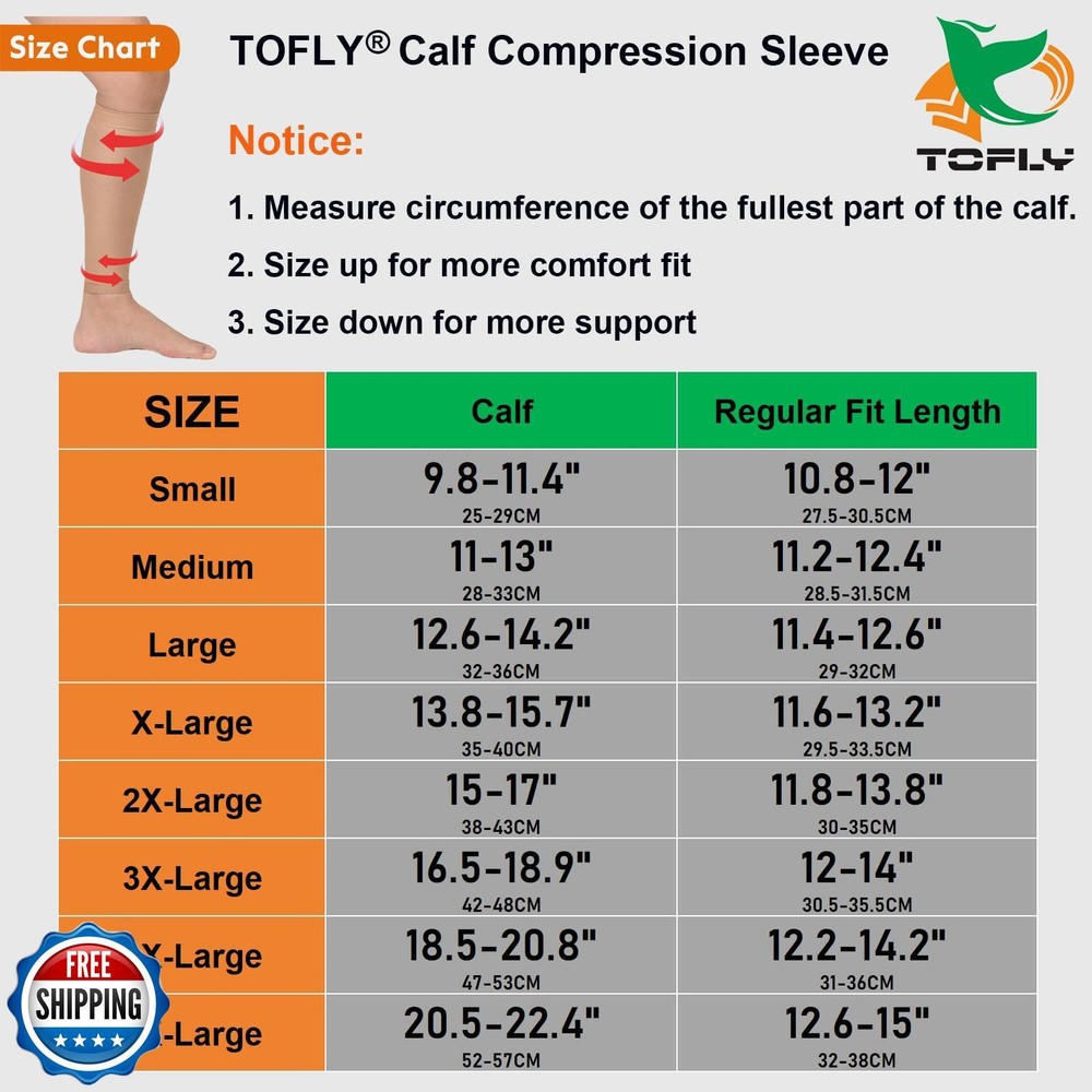 TOFLY® Calf Compression Sleeve for Men and Women, 1 Pair, Footless Compression Socks 20-30mmHg for Leg Support, Shin Splint, Pain Relief, Swelling, Varicose Veins, Maternity, Nursing, Travel, Beige 5XL Features GET PERFECT FIT ACCORDING TO SIZE CHART: Measure the thickest part of your calf then compare to the size chart of left images to get the perfect fit. They include size Small, Medium, Large, X-Large, 2X-Large, 3X-Large, 4X-Large, 5X-Large and painstakingly measured to ensure an exact fit. So whether or not you already have other calf sleeves, please try ours this time, as we provide "BUY 100% RISK FREE" Service, so why not to see whether these are better for you? IT JUST WORKS, TRY PLEASE! -DURABLE & COMFORTABLE: TOFLY compression calf sleeves are made of premium quality material, Nylon 77%, Spandex 23%, lightweight, breathable & durable, sweat-absorbent, anti-slip. True graduated compression of 20 - 30 mmHg (CLASS II), with seamless woven construction, these fit snug with no loss of compression after long time wear. IT JUST WORKS, TRY PLEASE! -RELIEF & RECOVER FAST: By improving blood flowing & circulation, TOFLY compression hose help to prevent the ankle & leg swelling, reduce muscle cramping while re-energizing tired legs. These footless compression hose also help reduce the risk of developing varicose veins, DVT, leg cramps, arthritis, shin splints, pulled muscle, tendonitis, lymphedema, ease muscle soreness as well as leg fatigue. IT JUST WORKS, TRY PLEASE! -GREAT FOR DAILY USE: These compression sleeves could be used during pregnancy, or whatever your sports might be, running, hiking, martial arts, volleyball, basketball, cycling, baseball, yoga, workouts or any fitness activities. Or for people in retail, air travel, jobs as a nurse or in construction that require long standing on your feet, even to cover up tattoos! BUY WITHOUT ANY RISK: Please feel free to contact us whether you have any problem here. And any question will be answered within 12 hours! We are so confident you will like our Calf Compression Sleeve since we know they do WORKS! Doctors, nurses, teachers, flight attendants, salesmen, policeman and the elder can benefit from our Compression Sleeve. Choose us, choose healthy and comfort! Shipping Free & Fast Shipping: We offer free shipping to most of the USA with a normal delivery time of 3-7 days. However, due to the current situation, additional delivery time (up to 3 weeks) may be required for some items. Alternative Carriers: We may use alternative carriers (e.g., USPS, FedEx, UPS) to ensure your package arrives safely and on time. Due to the use of multiple carriers, we are unable to provide a tracking number automatically. Handling Time: Orders are processed and shipped within 1-2 business days of receiving cleared payment. Shipping Restrictions: Shipping to Alaska, Hawaii, Puerto Rico, Guam, and other US territories may incur shipping charges or delivery restrictions. Please contact us before ordering, or your order can be refunded/cancelled. State Restrictions: Certain items may not be shipped to California due to state regulations. Contact for Tracking Updates: If you require tracking updates or have any concerns about the delivery of your order, please feel free to contact us, and we will be happy to assist you. Return Policy 30-Day Hassle-Free Returns: If you are not completely satisfied with your purchase, you can return the item for free within 30 days of receiving it for a full refund or exchange. Easy Return Process: Contact us, and we will provide you with a prepaid return shipping label and detailed instructions. No Restocking Fee: There are no restocking fees for returns. However, the buyer is responsible for return shipping costs if the return is not due to a seller"s error. Refund Processing: Refunds will be processed within 1 business day of receiving the returned item in its original condition. Feedback Your feedback is extremely important to us. We strive to provide the best products and customer service possible. If you are satisfied with your purchase, please take a moment to leave us a positive review. If you have any concerns or issues with your order, please contact us before leaving negative feedback. We are committed to resolving any problems and ensuring your satisfaction. Contact Us If you have any questions or concerns, please feel free to reach out to our customer support team. You can contact us through the eBay messaging system. We are available Monday to Friday, 9:00 am to 5:00 pm EST, and we will do our best to respond to your inquiry within 24 hours. Thank you for supporting our small family business!