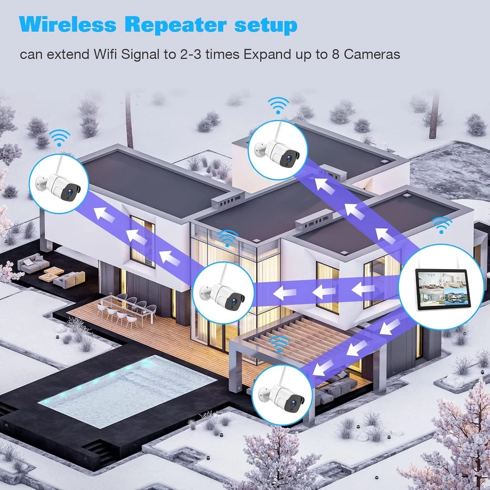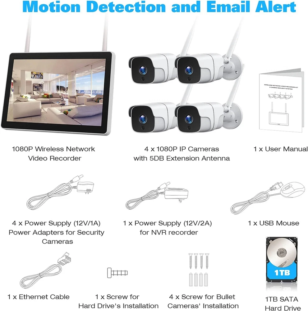 TOGUARD 1080P Wireless Security Camera System with 12 inch LCD Monitor, 8CH NVR 4Pcs WiFi Outdoor Home Surveillance Camera with App Remote, Night Vision, Waterproof, Motion Detection, Email Alert W/ 1TB Hard Drive Free & Fast USA Shipping ✔ Best Quality ✔ Easy Installation TOGUARD Wireless Security Camera System Precautions: 1. W/ 1TB Hard Drive 2. Audio Recording is NOT Supported 3. Wireless means the cameras can automatically connect to the NVR monitor wirelessly. Cameras and NVR require power supply all the time. (Not cover Battery) Observing What You Love From Every Angle and Keep Your House Under Control. NVR Kit supports sync-playback, video backup, motion detection, email alert. Night Vision, Waterproof and 1080P image sensor allow you to view more clear and stunning picture and video at night even in rainy day. Smart security for your home. Save videos automatically and you can watch videos on your phone, laptop and computer at any time. Also you can share the interesting things with your other family members and friends. Key Words: 【 All-in-One and Plug & Play 】TOGUARD wireless camera system features a 12" full HD 1080P NVR monitor (Not Touch Screen). The cameras and NVR monitor are auto-paired during the factory setting. Just need to charge the cameras and NVR monitor with Power Supply provided for 24/ 7 surveillance purposes. (Wireless means wireless connection, but also need to plug-in power supply all the time) Perfect for villa, home, office, shop, hotel, warehouse, school, business or elsewhere. 【 Remote Viewing on smart devices 】Connect the NVR Monitor to home router via Ethernet cable provided and download app “EseeCloud ” into your Phone, Pad, or PC. You can remote access simultaneously on smart devices at any time and anywhere. (Note:This TOGUARD wireless camera system does not support audio recording.) 【 Motion Detection and Email Alert 】TOGUARD wireless camera system provide a sensitive choice of Motion Detection for different needs. Smart notifications with email/ snapshot alerts will be pushed to your smart phone via email or IOS/ Android App when motion is detected. Customize your own detection plan and zone for each camera. Alarm Ringing does not support yet. Note: The Email Alert function needs to turn on before it works. 【 IP66 Weatherproof & Outdoor Night Vision 】TOGUARD wifi security camera is rated with IP66, the working temperature ranges from -4°F to 122°F (-20℃ to 50℃) made with dust tight and waterproof and cover with durable housing. It is vandal proof and can work well under harsh weather, even in the storm and snowy weather. Featuring 3.6mm LEDs with IR-CUT function support up to 20m/65ft Night Vision. Best choice for your outdoor home security. 【 More functions and details 】 TOGUARD wireless camera system support up to 8 cameras. It can be also used in no Internet area(connect directly via NVR system, but can not use Remote view). Extending wireless signal range by IP Camera if you use in a long distance.24 hours 30 days reliable video recording for 1TB HDD. For more function,please read user manual. Surveillance System Packing List: 1 x 8CH 12inch 1080P Wireless Network Video Recorder&Monitor(Wireless NVR Monitor) 4 x 1080P IP Cameras with 5DB Extension Antenna 4 x Power Supply (12V/1A) Power Adapters for Security Cameras 1 x Power Supply (12V/2A) for NVR recorder 4 x Screw for Bullet Cameras' Installation 1 x Screw for Hard Drive's Installation 1 x Ethernet Cable 1 x USB Mouse 1 x User Manual Reference: 1TB Hard Drive ( included) When the hard drive is full, it will be overwritten automatically. True Plug & Play and Auto-Pair The IP cameras have been paired to the NVR monitor. Actual Plug and Play. Just need to connect the NVR monitor and IP cameras with Power Supply. (Cameras are not cover battery) The NVR monitor and IP cameras need to charge all the time to get electricity for 24/7 surveillance purposes. Wireless means that there is no cable between cameras and NVR monitor, but Cameras and NVR require power supply all the time. Local and Remote View Local Viewing: No Network Needed. Just connect the wireless surveillance camera system to the monitor via HDMI and enjoy multiple-cam views on one screen. Remote Viewing: Connect the NVR to Network . Download the “EseeCloud” on your smart phone (Android & IOS system), Or download the “EseeCloud” PC client on PC(advise IE Browser). Create an account and connect the NVR device to view live and record videos. Easy Remote Access TOGUARD Wireless Security Camera System support different devices on remote viewing.(It need to connect to WIFI) Download app “EseeCloud ” into your Phone, Pad, or PC. You can remote access simultaneously on smart devices at any time, anywhere. WiFi Range Extend & Repeater Set up TOGUARD IP Camera can work as signal transmitter to help strengthen the poor signal camera that caused by long range installed or physical obstacles such as walls. Repeater is also supported. Infrared Clear Day Night Vision Featuring 3.6mm LEDs with IR-CUT function, 110° viewing angle, 50ft Night Vision range. The camera's infrared mode is automatically activated in low lighting conditions. It can clearly monitor everything even at night. Motion Detection and Email Alert Customize your own detection zone for each camera exactly to your needs. When motion is detected, smart notifications with email/ snapshot alerts will be pushed to your phone via iPhone/ Android App or Email. The motion detection function of the wireless security camera system uses intelligent algorithms to minimize false alarms. Sensitive of motion detection can be chosen for different need. Wireless Surveillance System Provides for 24/ 7 Recording TOGUARD Security Camera makes your life safe and monitor what matters most. TOGUARD Security Camera System supports wireless / wired connection. When the wireless signal cannot be covered, you can set up a wired network to transmit video. (If you