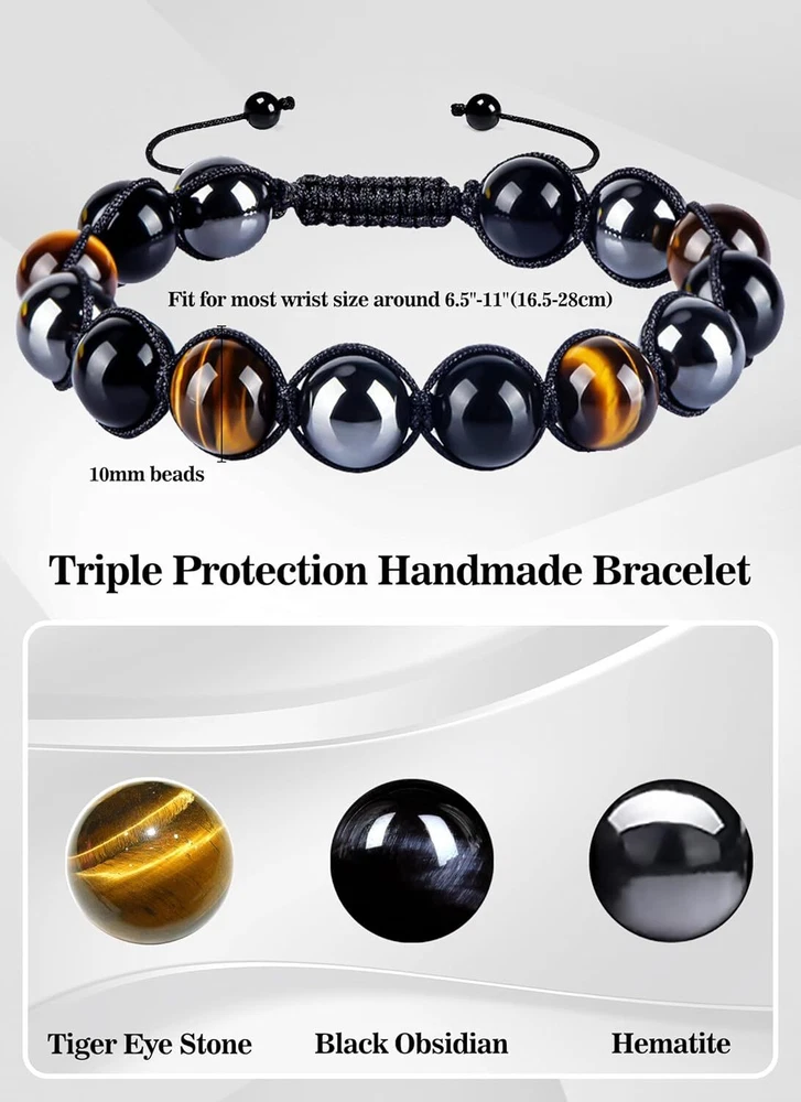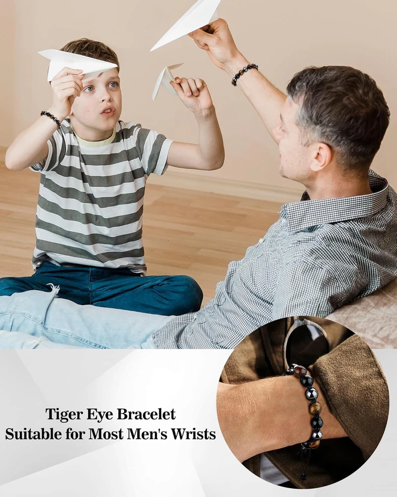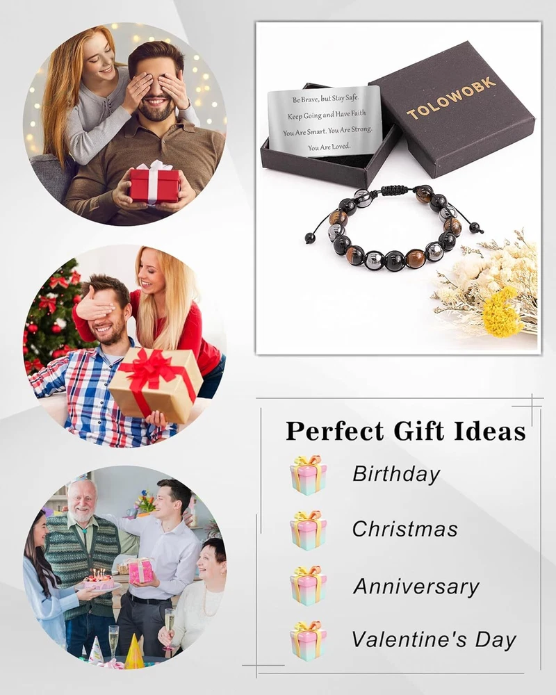 TOLOWOBK Mens Bracelet Gifts Tiger Eye Bracelet Black Obsidian Stone Bead Brand TOLOWOBK Manufacturer TOLOWOBK Features 【After-Sales Care】Your happiness is our happiness! If you have any questions about our products, please feel free to contact us, our service team will answer in 24 hours and offer satisfactory solution 【Perfect Jewellery Gift Box】Triple protection bracelet and wallet card come together in a jewelry box. Every time he takes out his wallet it will remind him of your indelible love for him. Perfect gift for dad, son, grandson, boyfriend, brother and friends on Birthday, Graduation, Anniversary, Back to School, Christmas. The black obsidian bracelet that tenderly and thoughtfully expresses love will surely surprise him and keep him company at all times 【Adjustable Size for Him】The tigers eye bracelet comes with a sliding knot and can be adjusted from 6.5 inches to 11 inches, nice fit for most size wrists of men and boys. Just need to pull the rope at the end for adjusting the length you want, very convenient and elegant, very comfortable to wear 【Premium Protection Stone Material】Made of natural tigers eye stone, black obsidian and hematite, which helps relieve stress, brings you good luck, confidence, happiness. This mens crystal bracelet is carefully hand-polished, not easy to fade. The beads are tightly and securely threaded together, comfortable to wear everyday. Stainless steel engraved wallet card is hypoallergenic, will not easily bend, will not rust, change color or tarnish. So your loved one can cherish it always 【Crystal Bracelet With Engraved Wallet Card】Different from other mens bracelets with paper wish card, our beaded bracelet is included with a stainless steel wallet card engraved "Be Brave, but Stay Safe. Keep Going and Have Faith. You Are Smart. You Are Strong. You Are Loved." A meaningful men gift that expresses your special love and care to the one you loved Our Business 100% Customer Satisfaction We go above and beyond to ensure you receive the best level of service. Returns We want you to be happy with your purchase, however in the rare occasion that you are not, please let us know and we will contact you to arrange either a collection or a refund. Please CONTACT US before leaving any negative feedback and we will promptly sort out any issue with your order. 6124072