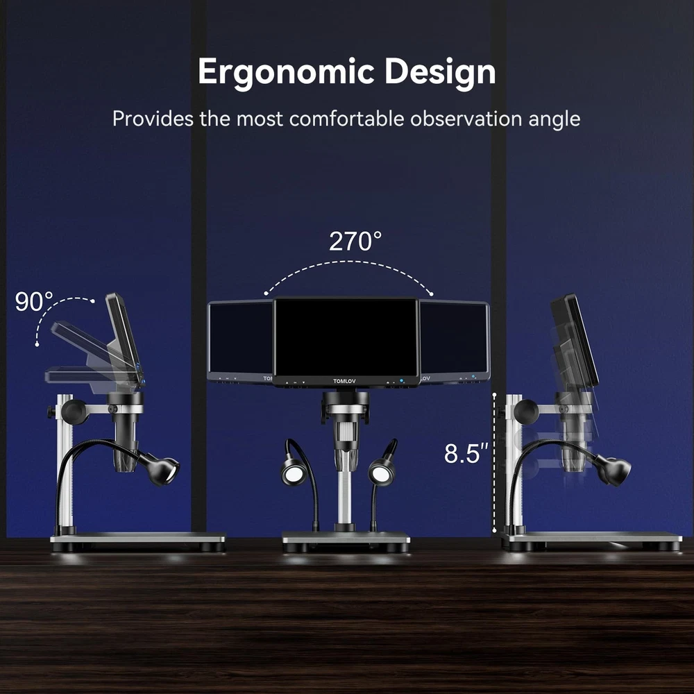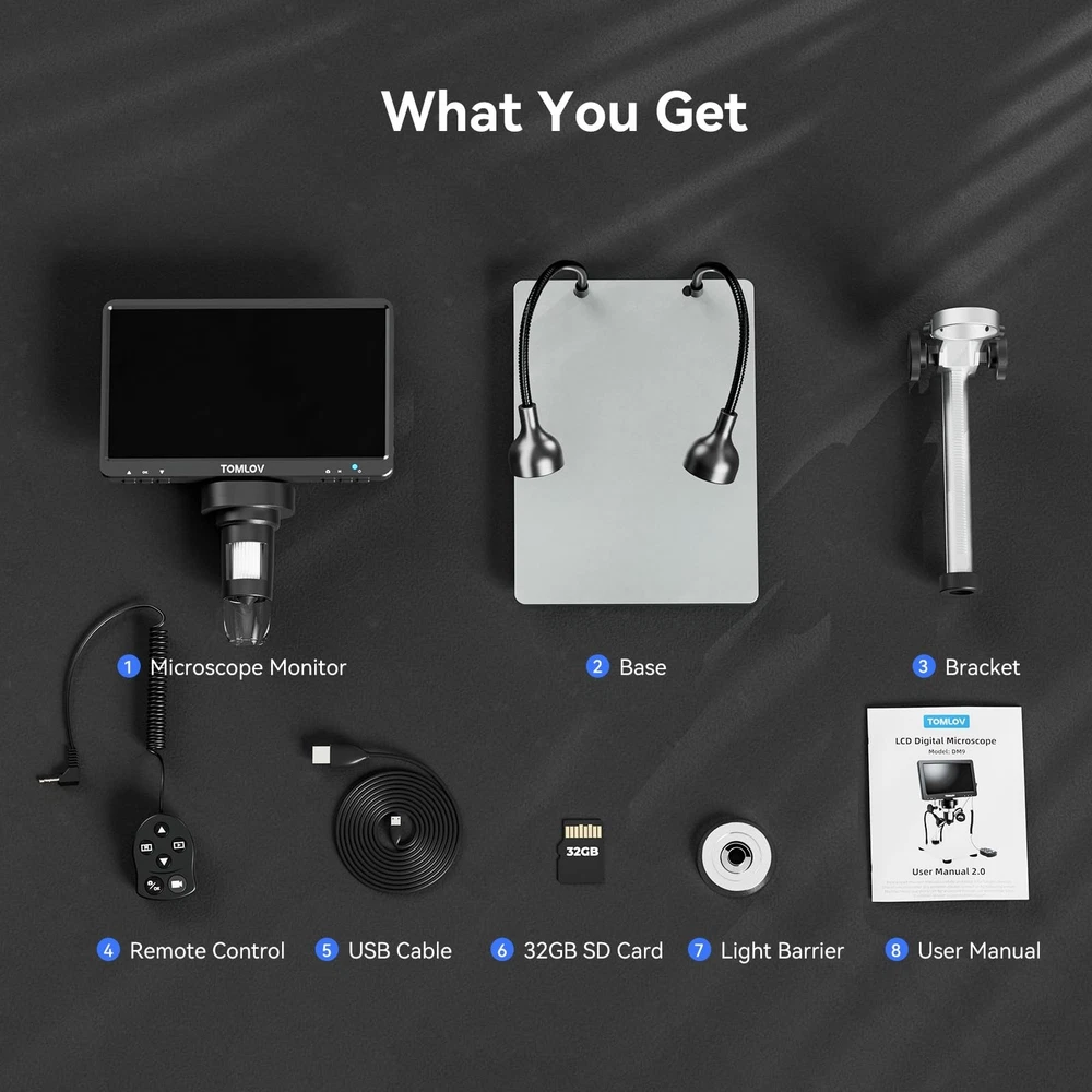 TOMLOV DM9 7" Digital Microscope: 1080P 1200X Coin Microscope Magnifier, 12MP Ultra-Precise Focusing LCD Soldering Microscopes for Adults, PC View, 32GB Product Details Color: Silver Brand: TOMLOV MPN: TM-DM9 UPC: 889251607592 EAN: 0889251607592 Light Source Type: LED Model Name: DM9 Material: Aluminum Alloy Color: Silver Product Dimensions: 8.19"L x 3.23"W x 9.45"H Real Angle of View: 178 Degrees Magnification Maximum: 1200 x Voltage: 5 Volts Brand: TOMLOV Compatible Devices: Laptop, Personal Computer Product Dimensions: 9.53 x 8.03 x 3.54 inches Item Weight: 2.11 pounds Item model number: TM-DM9 Batteries: 1 AAA batteries required. (included) Is Discontinued By Manufacturer: No Date First Available: August 18, 2020 Manufacturer: TOMLOV Tons of Fun and Applications: With easy-to-use operation and a wide range of applications, from micro soldering and rock inspection to coin and stamp observation, this coin microscope with screen is perfect for adults, students, and young learners, enhancing interaction between parents and kids, as well as teachers and students 7-Inch Rotatable FHD Screen: Equipped with a 12MP ultra-precise focusing camera and 1080P high-definition imaging, this LCD digital microscope captures high-quality images and videos, delivering an incredible microscopic viewing experience. The rotatable (90-degree) screen design improves ergonomics and reduces eye and neck strain 5X-1200X Magnification: Allows you to zoom in and observe the tiniest details with a magnification range from 5X to 1200X. The 8 LED fill lights, plus 2 additional gooseneck lights, ensure a well-lit view. The actual magnification varies depending on the screen size and the distance between the camera and objects Hook Up to PC for a Larger View: Compatible with Windows and macOS, the PC view allows you to observe on a larger screen and facilitates data sharing and analysis. No additional software requiredsimply use the default apps: "Windows Camera" for Windows and "Photo Booth" for iMac/MacBook 32GB SD Card Included: This coin magnifier with light includes a 32GB Micro SD card, allowing you to store numerous photos and videos. Press and hold the menu button for 3 seconds to switch between Photographing, Video Recording, and Playback modes (Please note: To prevent the Micro SD card loss, we have pre-installed it into the Micro SD card slot on the microscope) Solid Metal Frame Construction: Constructed with an aluminum alloy base, stand, and holder, this soldering microscope ensures long-term durability, making it ideal for micro soldering and PCB repairs Available Photo & Video Resolutions: Photo Resolution: 12MP (40233024), 10MP (36482736), 8MP (32642448), 5MP (25921944), 3MP (20481536). Video Resolution: 1080FHD (19201080), 1080P (14401080), 720P (1280720). Please note that higher resolutions take up more storage space, and resolution may be limited when viewed on a PC