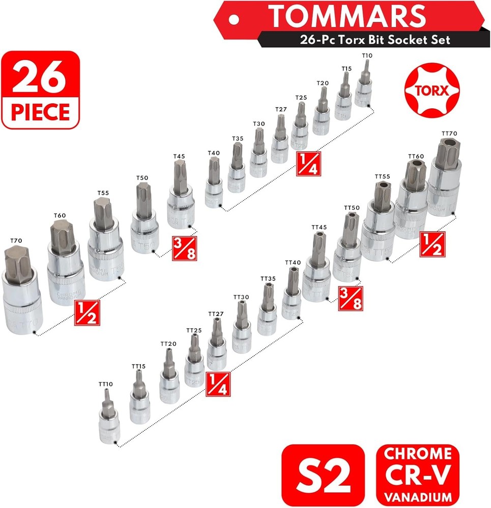 TOMMARS 26-PC Torx Socket Set, 26-Piece, Bit Socet T10-t70 & Tt10-tt70 Product Details Brand: TOMMARS Material: Chrome Vanadium Steel, S2 Steel Drive System: 3/8", 1/2" Finish Type: Mirror Chrome Finish Number of Pieces: 26 Drive Bit Shank Style: star-drive Manufacturer: TOMMARS Part Number: K1T95623 Item Weight: 3.39 pounds Package Dimensions: 13.82 x 7.99 x 2.36 inches Item model number: K1T95623 Size: 26-Piece Color: Torx Bit Socet T10-t70 & Tt10-tt70 Style: Torx Bit Socket Finish: Mirror Chrome Finish Item Package Quantity: 1 Compatible Fastener Range: 0.25 inches Batteries Included?: No Batteries Required?: No Brand: TOMMARS Material: Chrome Vanadium Steel, S2 Steel Drive System: 3/8", 1/2" Finish Type: Mirror Chrome Finish Number of Pieces: 26 Torx bit socket set includes: 1/4" drive T10, T15, T20, T25, T27, T30, T35, T40, 3/8" drive T45, T50, 1/2" drive T55, T60, T70; Tamper proof security torx bit socket includes: 1/4" drive TT10, TT15, TT20, TT25, TT27, TT30, TT35, TT40, 3/8" drive TT45, TT50, 1/2" drive TT55, TT60, TT70 These torx bit sockets are crafted from a combination of S2 alloy steel and chrome vanadium steel, providing excellent resistance to rust and exceptional strength and durability. They're ideal for loosening stubborn screws. Each torx bit is precisely sized and chamfered to ensure a perfect fit and to reduce wear on fasteners. This torx bit socket set is compatible with a ratchet, making it versatile for servicing vehicles. This set includes the essential sizes to work on bikes, automobiles, appliances, lawn equipment, machinery, ect. The size markings on these torx bit sockets are large, clear, and die-stamped, ensuring easy readability that won't wear off over time. Additionally, the set comes with a storage case for convenient transport and quick organization.