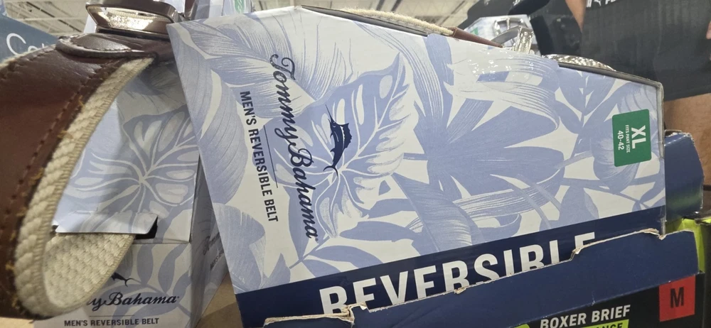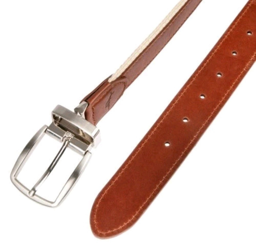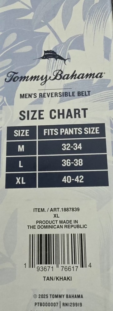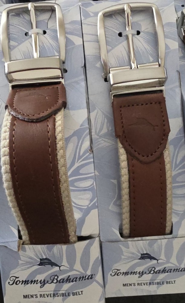 The Tommy Bahama Reversible Belt in size XL is a stylish accessory for men that offers versatility. Made in the Bahamas, this tan belt features a reversible design, allowing the wearer to switch up the color to complement different outfits. With the reputable Tommy Bahama brand, this belt is sure to add a touch of sophistication to any man's wardrobe.