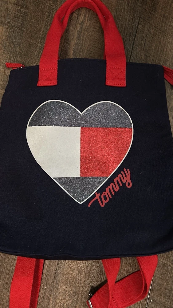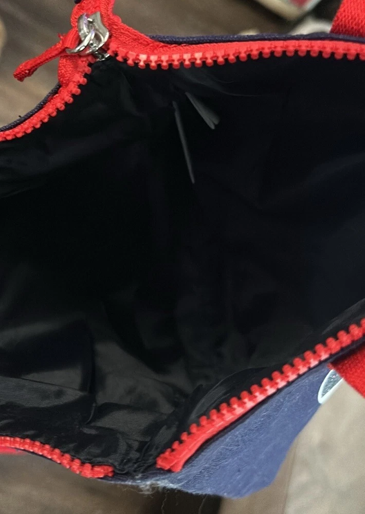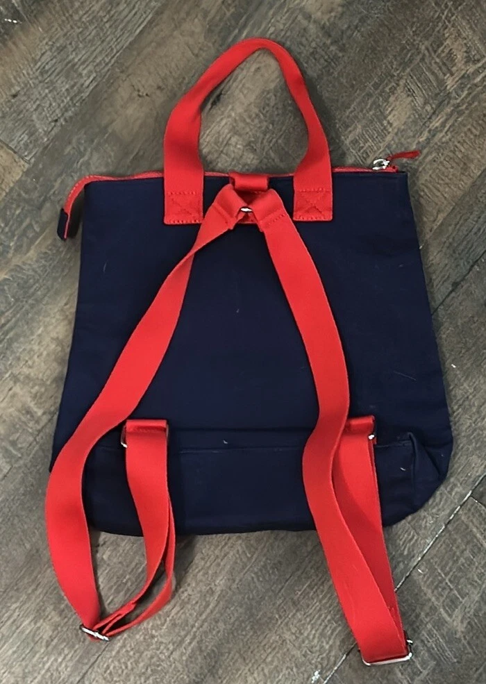 The bag has a zipper closure and a sturdy Red Canvas handles The exterior is made of durable canvas while the interior is lined with soft blue polyester. This small-sized backpack features adjustable straps