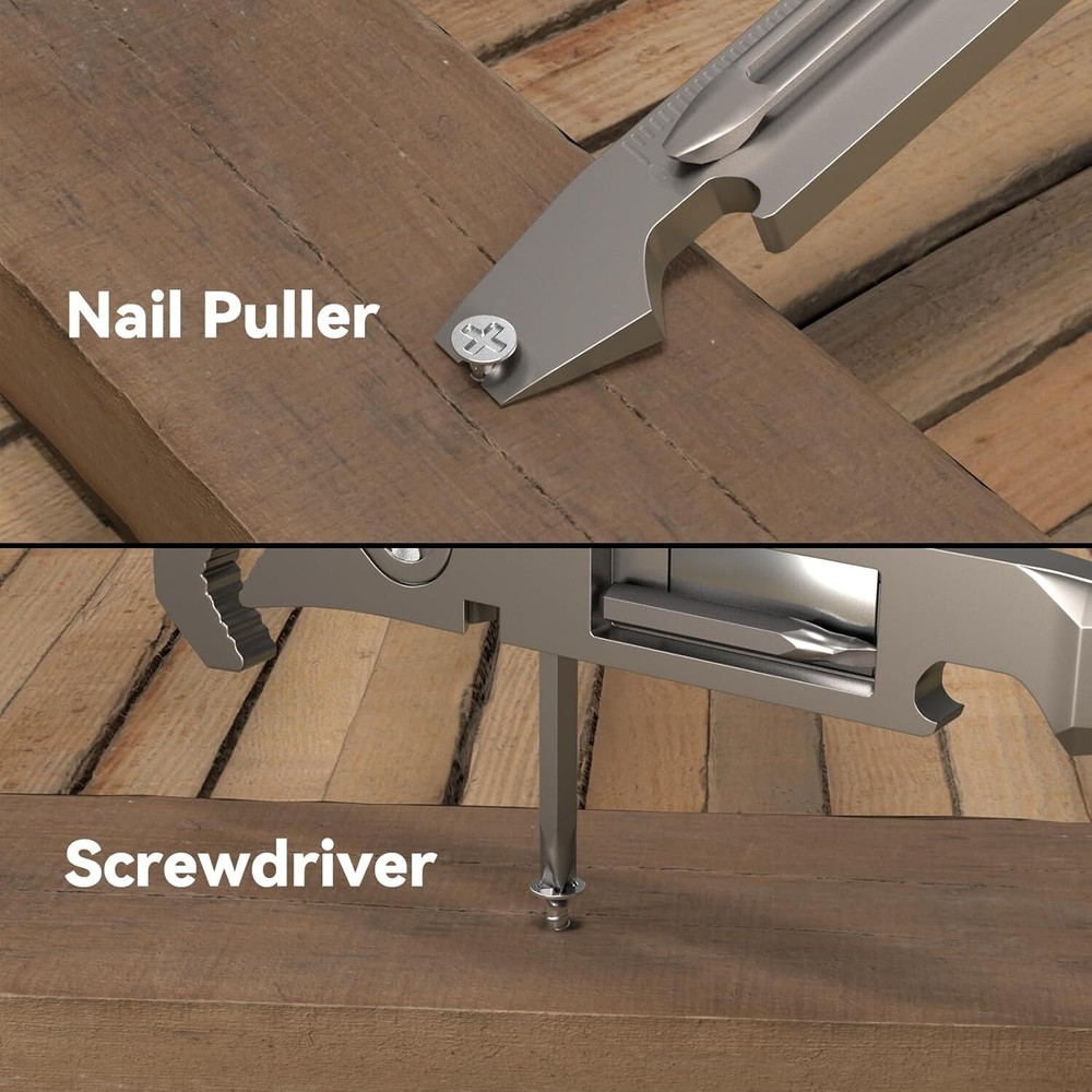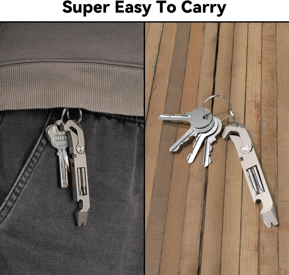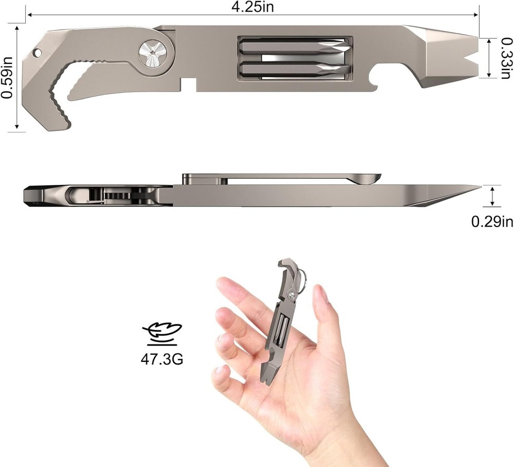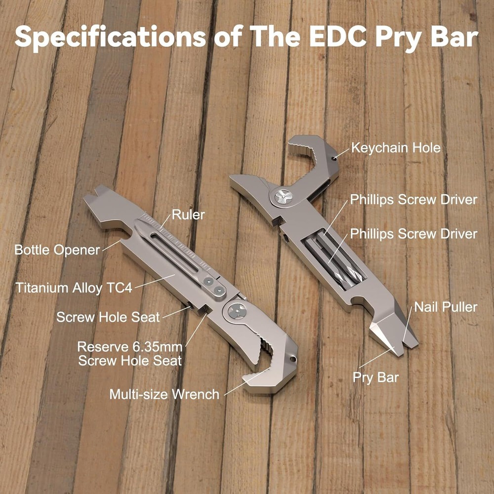 Durable Material: Toovem titanium multitool is made of high-quality titanium, and TC4 titanium alloy has high strength, good corrosion resistance and high heat resistance. It also has a very high for everyday carry and adventures and is easy to grasp with one hand. Multifunction Pry Bar Tool: This titanium alloy TC4 pry bar multifunctional pry bar tool is suitable for outdoor and home use, with a bottle opener, multi-size wrenches, Phillips screwdriver, slotted screwdriver, a measuring ruler, but also reserved for 6.35mm screw hole holders, to bring you great convenience in life. Easy to Carry Dimensions: This EDC titanium is small and delicate, comfortable to touch and compact marvel of design. Size: 0.59x 4.25 x0.33 inch. Weight: 0.11LB. Pry Multitool Has You Covered: Our pocket EDC pry bar is equipped with a keychain for easy carrying and the product itself is equipped with a clip, the clip can be clipped on the shirt pocket, can be carried with you. Extensive Use Keychain Pry Bar: Titanium EDC pry bar is suitable for outdoor camping, barbecuing, picnicking, hiking, traveling, backpacking, is the preferred tool for hiking, camping. Product Description TOOVEM EDC Titanium Pry Bar TOOVEM Titanium EDC Pry Bar This titanium alloy TC4 pry bar multifunctional pry bar tool is suitable for outdoor and home use, with a bottle opener, multi-size wrench, Phillips screwdriver, slotted screwdriver, a measuring ruler, but also reserved for 6.35mm screw hole holders, to bring you great convenience in life. Wide Variety of Uses - Multi-function Pry Bar Tool Ti-Pry Features: Made of high-quality titanium to last a lifetime Corrosion resistant Bottle opener Multi-functional tool Light weight and easy to carry What will you receive? 1* EDC Titanium Pry Bar 1* Keychain The Multitool Pry Bar Screwdriver Choice is Yours BOTTLE OPENER Portable Pry Bar Repair Tool