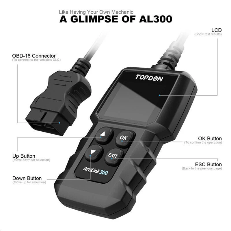 TOPDON OBD2 Code Reader OBD2 Scanner Car Check Engine Fault Diagnostic Tool HOT TOPDON AL300, OBD2 Scanner Code Reader, car Auto Diagnostic Tool with Full OBD2 Functions, Engine Fault Code Reader CAN Scan Tool, HD LCD Display Screen, for Cars After 1996 Brand TOPDON Product Dimensions 2.82"L x 0.92"W x 4.72"H Operating System Windows XP Manufacturer TOPDON About this item FULL OBD2 TEST MODES: this OBD2 code reader to pull and clear codes. Get real-time sensor readings from emissions/ rpm/ mph/ fuel trim/ O2 sensors/ mass airflow and such, to easily find catalytic converter/ fuel delivery/ vacuum problems. I/M READINESS: check I/M readiness status to help pass smog tests. Identify emission issues ahead of time and save on expensive repair costs. Works for most OBD2 / EOBD compliant cars worldwide. AUTO VIN DECODER: this OBD2 scanner features automatic VIN technology for easy car identification. It enables you to read freeze frame data recorded by the ECU, aiding in effectively solving emission-related faults. MULTI-LANGUAGE: 7 languages are supported English, French, German, Italian, Spanish, Portuguese, Russian. WIDE COMPATIBILITY: this OBD2 code reader works on most US-based cars since 1996, EU-based cars after 2000, and Asian-based cars after 2008. Product Description OBDII protocols applicable:KWP2000, ISO9141, J1850 VPW, J1850 PWM and CAN (Controller Area Network). Vehicles Coverage for this model: for the EU-based cars, it supports the model year of 2000 or newer; for the US-based cars, it supports the model year of 1996 or newer; for the Asia based-cars, it supports the model year of 2008 or newer. Product information Technical Details Manufacturer TOPDON Brand TOPDON Model AL300 Item Weight 12.3 ounces Product Dimensions 2.82 x 0.92 x 4.72 inches Item model number AL300 Manufacturer Part Number AL300 Special Features ➤This code reader work for the cars: America Cars after 1996, Asia Cars after 2008, Europe cars after 2000, it works for the cars which support the protocol of KWP2000, ISO9141, CAN, J1850, J1850 PWM, and it doesn’t support JOBD!, ➤VIN Identification: quickly read the car's information such as the VIN number., ➤DTC Lookup: well-interpreted & analyzed fault codes in seconds., ➤I/M Readiness Check: check if the vehicle is ready for an emission test to avoid unnecessary fines., ➤Freeze Frame: vehicle snapshot when a code is stored., ➤Read and Clear Diagnostic Codes: confirmed, pending, and permanent for most 12V voltage, 16-pin interface compliant 1996 US-Based, 2000 EU-Based and Asian cars, and newer OBD II & CAN domestic or import vehicles. What's in the box 1*TOPDON Al300 obd2 code reader; 1*Quick Start Guide; 1*User Manual. Payment Delivery details Terms of sales About us Contact us Payment We accept all common forms of payment such as Credit cards、Debit card、Google Pay ect. Please contact us if you need to use another method to pay. Payment should be made within 7 days after bidding ends. Otherwise a Unpaid Item case will be opened to you. We are not responsible for buyers’ local taxes. Please include your special requests in eBay note if there is any. Delivery details Shipping: Most orders placed by 1PM eastern time, Monday thru Friday will be shipped within 1 business day after payment confirmed. All orders placed over the weekend will be shipped on Monday. We have warehouse in USA, UK, HongKong, Australia, Russian, Germany and China warehouse. Notice: For USA Buyer , we have warehouse located in Kentucky, Los Angeles & New Jersey etc. (East Side & West Side of USA) , parcel will be shipped from the nearest warehouse according to buyers' eBay address in the paid ORDER . 1. From our US/DE/UK/AU warehouse via UPS / DHL or other eCommerce shipping. Delivery time varies from 2 to 6 business days. 2. From our Hong Kong warehouse via UPS / DHL / FedEx Ground etc. Delivery time varies from 3 to 7 business days. 3. From our China warehouse For US buyers, we use e-Packet (Delivery time is 5-12 business days) or express delivery(Delivery time is 3-7 business days) . For other countries' buyers, we use China Post or Hong Kong Post (Delivery time varies from 10 to 25 business days) or Express delivery (Delivery time is 3-7 business days). We will ship according to buyers' eBay address in the paid ORDER. Please make sure it is correct and including phone number for delivery. If you do not receive your order in the estimated time, please contact us, we would do our best to serve you solve the problem. Please include your special requests in eBay note if there is any. Terms of sales We are authorized distributor , our all items are 100% original and all our products have warranty, 12 months free repair for the main devices. 3 months for the accessories. Please contact us firstly when you need warranty service. In case an item arrives faulty, please contact us in 30 days and keep it unused . We will instruct you on how to return and get refund or replacement. If after 30 days, or the item has been used, we have the rights to decline your claim. Items should be returned on buyers’ cost for repair or replacement. About us Who We Are? We are specialized dealer of On-Board Diagnostic tools and automotive electronics for more than 10 years. We are authorized first class distributor of Topdon . What Do We Have? We have office and warehouse in USA, UK, HongKong, Australia, Russian, Germany and China to ensure fast shipment and after-sale service. We have more than 100 employees devoting to customer satisfaction. Terms of tax: We are not responsible for buyer's local taxes, please consult your local customs for tax details. Contact us Our customer-oriented service strives for buyers' 100% satisfaction . Please feel free to contact us via eBay message once you have any question before leaving neutral / negative feedback or open case. We will reply in 24 business hours . Business time: GMT8 (9:00-18:00) from Monday to Friday. Please leave us Positive Feedback and 5-s