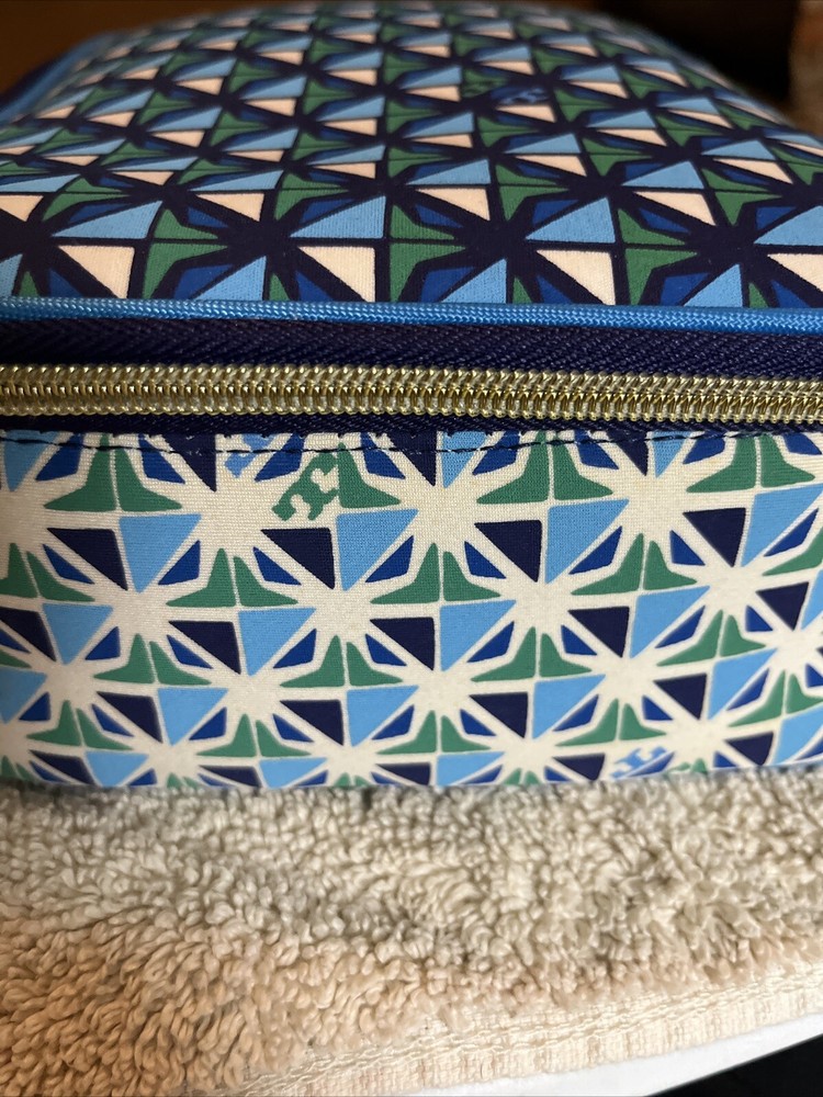 Item Depth: 2.75 in Shape: Rectangle Pattern: Geometric Type: Lunch Box Material: Neoprene Features: Reusable, With Handle Character: Blue Color: Multicolor Style: Modern Number of Items in Set: 1 Item Width: 10 in Brand: Tory Burch Number of Compartments: 1 Item Height: 3 In Lid Type: Zip