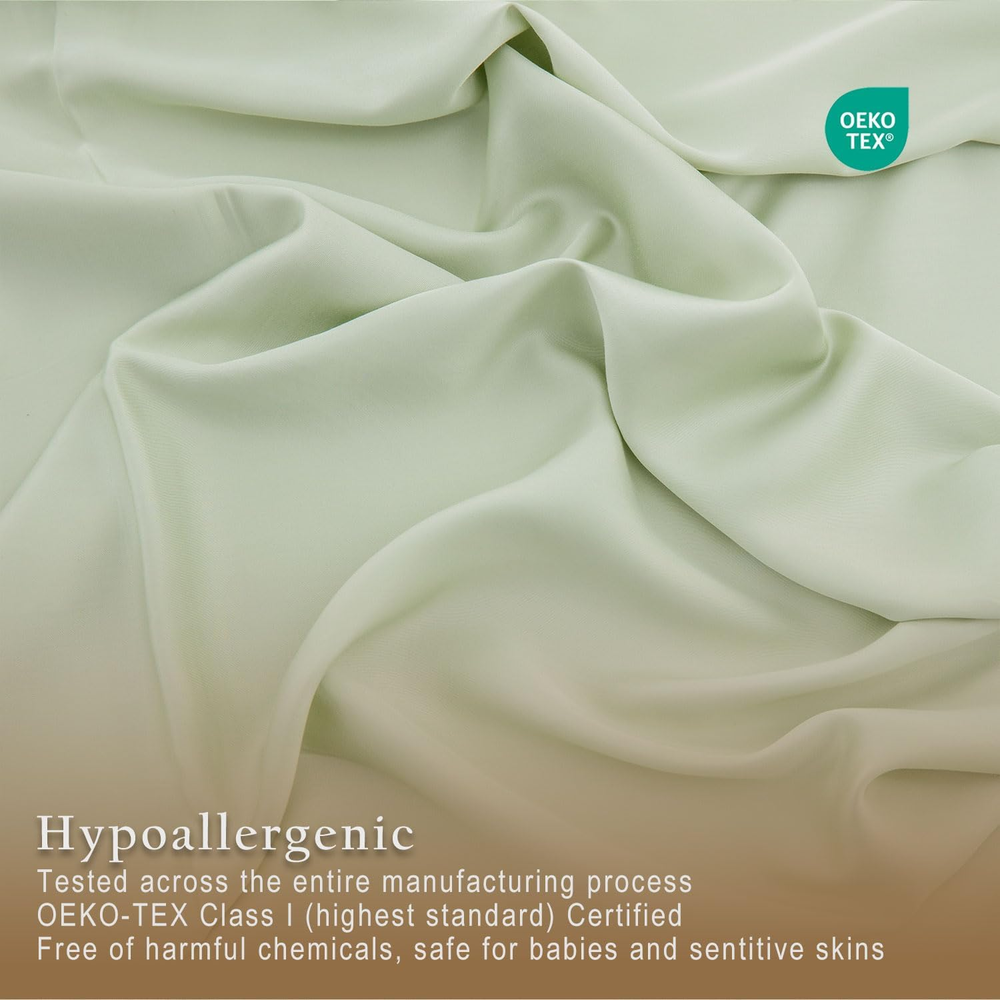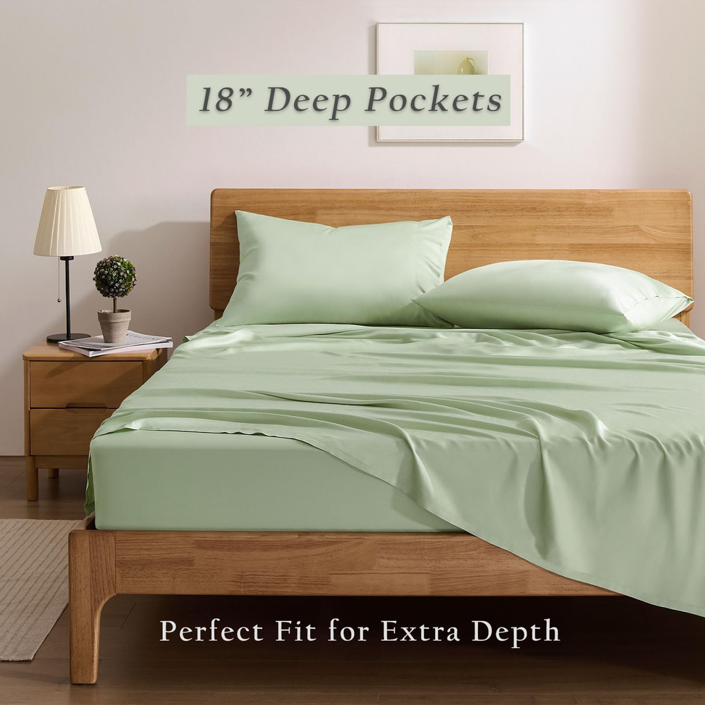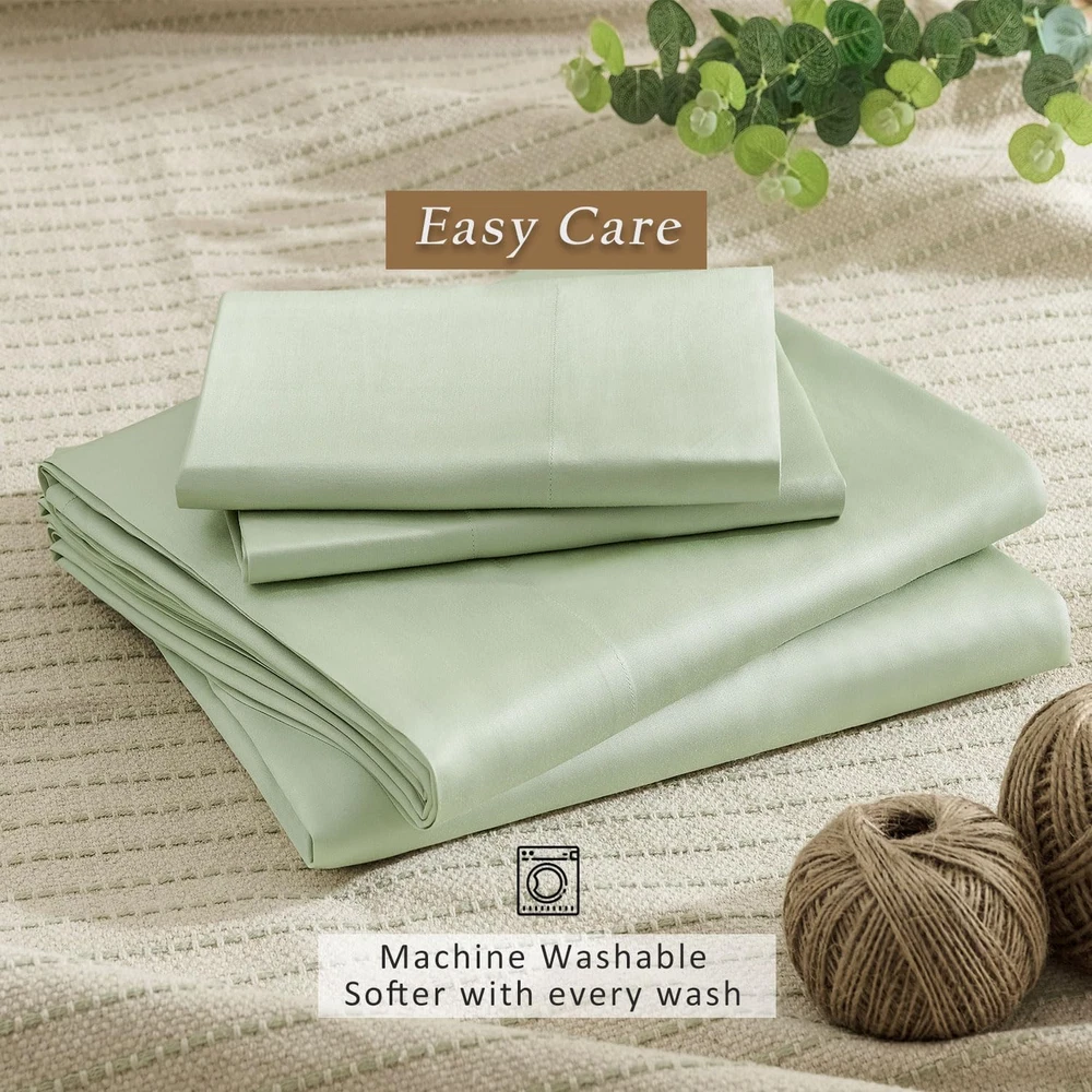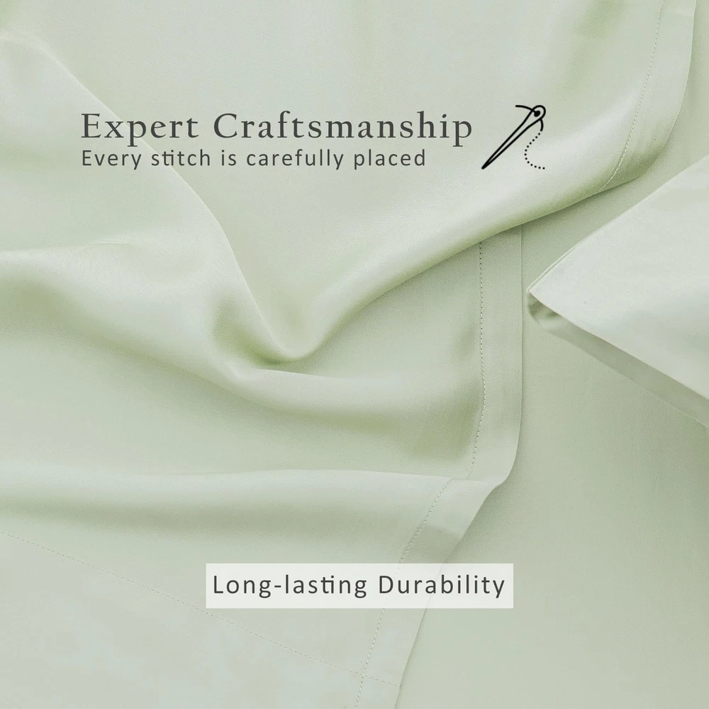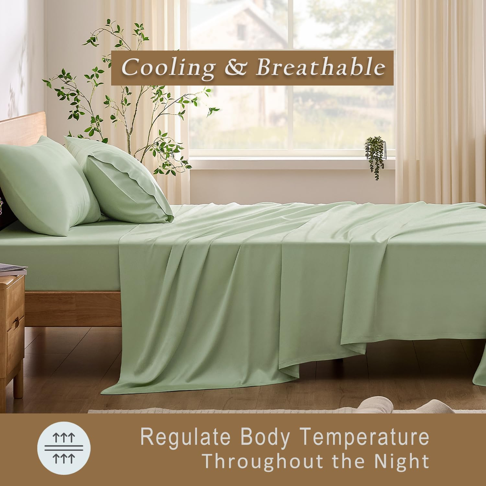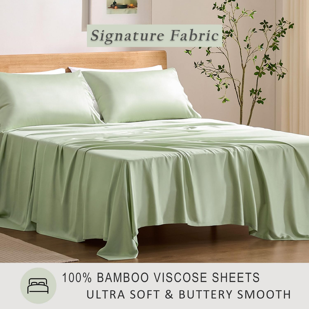 Sleep Safe, Breathe Easy: Certified by OEKO-TEX Standard 100, our 100% viscose from bamboo sheets are rigorously tested to ensure free from harmful substances – ideal for sensitive skin, allergy sufferers, and families seeking a healthier sleep environment. Night Sweat Defense: Plant-Based Viscose natural temperature control wicks away moisture 3x faster than cotton, keeping you cool in summer and cozy in winter. Perfect for hot sleepers, menopause, or humid climates. Long-lasting Luxury: Experience the silky-smooth caress of 300-thread-count sateen weaving – durable enough for daily use yet delicate enough for the most discerning skin. Elevate your bedroom into a 5-star hotel retreat. Universal Fit, Zero Hassle: The 18-inch deep pocket accommodates extra-thick mattresses, toppers, or adjustable beds (up to 18" height). No more slipping corners – just crisp, secure bedding every morning. Easy-Care Bliss: Maintaining your bed sheets is a breeze. Simply toss them in the washing machine on a gentle cycle in cold water. Avoid dry cleaning, bleach and fabric softener. Tumble dry on low heat, remove promptly, and cool ironing them if needed. For long-lasting quality, wash with similar materials and colors. Product Description Is thread count significant for determining quality? The belief that thread count reliably gauges softness, durability, and quality is a misunderstanding. Instead, the pivotal factors are the quality of the raw fiber and the material's weave. Does the fitted sheet have extra straps? No, our fitted sheet is designed with high-quality elastic that is specifically engineered to provide a snug and secure fit. It firmly holds the sheet in place on the mattress without the need for additional straps. Does the color look exactly like the pictures? The color might be slightly different under various lighting environment. Due to monitor restrictions, the color on your screen might also be different. Home Collection Add to Cart Add to Cart Add to Cart Customer Reviews 4.8 out of 5 stars 83 — 4.4 out of 5 stars 40 4.7 out of 5 stars 58 Price $129.00 $ 129 . 00 — $159.00 $ 159 . 00 $42.99 $ 42 . 99 Material 100% Viscose from Bamboo 100% Viscose from Bamboo 100% Bamboo Viscose Shell&Fill 95% Bamboo Viscose/5% Spandex Size Map Twin/Full/Queen/King/Cal King 20x26/20x30/20x36/20x40 Twin/Full/Queen/King S-2XL Features Silky, Luxurious, Cooling Silky, Light Weight, Cooling Breathable, Soft Stretchy, Breathable Machine Washable ✔ ✔ ✘ ✔ Style 18" extra deep pocket Envelope Closure Diamond Stitch Notch Neck