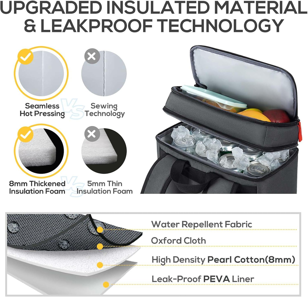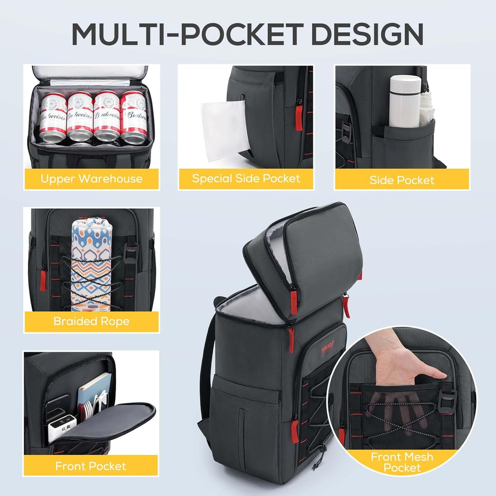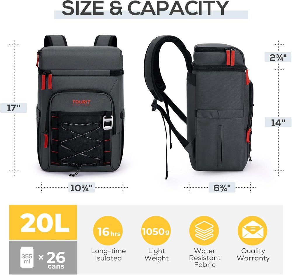 Store New Arrivals Add to Favorite View Feedback Contact TOURIT Backpack Cooler Insulated Leak Proof 30 Can, 2 Thick Insulated Description Capacity 9.23E+3 Milliliters Number of Items 1 Pattern Letter Print Package Weight 0.72 Kilograms Brand Name TOURIT Brand TOURIT Material Polyester Package Information Bag Item Package Dimensions L x W x H 15.59 x 11.89 x 3.86 inches Included Components bottle opener Water Resistance Level Waterproof Item Weight 1.59 Pounds Special Feature Leak Proof, Lightweight, Double Deck, Adjustable Strap, Insulated Item Dimensions LxWxH 6.7 x 10.7 x 17 inches Color Dark Grey Product Care Instructions Hand Wash Recommended Uses For Product Picnic, Fishing, Camping, Hiking Chamber Depth 6.7 Inches Manufacturer TOURIT Product Dimensions 6.7"D x 10.7"W x 17"H Insulation Material Polyethylene Size Normal 【16 Hours Retention】The inner insulation of the backpack cooler is thickened with 10-8mm(others 5mm) foam and the leak proof EVA liner works together to keep food and drinks cold up to 16 hours. 【Waterproof & Lightweight】The outermost layer of the cooler backpack is made of high-density scratch-resistant nylon material and Oxford fabric ensuring 100% waterproof and easy to clean. Sufficient material but overall light. Lightweight 1.76 LB(others 1.2 LB) portable design with adjustable padded strap, more comfortable than carrying a heavy traditional big cooler. 【2 Insulated Compartments & Multi-Pockets】The backpack cooler includes 1 main large insulated leak proof storage compartment for drinks, 1 upper compartment used to organize dry items, 1 front zipper pocket that comes with a mesh pocket and braided cord for accessories. 2 side pockets, one for holding tissues and the other for holding objects such as umbrellas. 【Leak-proof & Sweat-Free】Cooler backpack liner adopts high-tech seamless hot pressing process for leak-proof. We support free replacement or return if any leak happens. 【26 Cans Large Capacity】Measures 17''x10.7''x6.7"( H x L x W) and can hold up to 26 cans (355ml), roomy enough to pack meals, beers, tall beverages, snacks and other necessities. TOURIT 26 Cans Insulated Cooler Backpack for Hiking Whether you have strong interest in road/ beach trip, picnics or daily hiking, the TOURIT backpack cooler is your best partner for all types of outdoor activities. The stylish design of our insulated backpack make it also can be used as a lunch backpack or daily pack. 【Product Features】 ■Keep your food cool and safety This cooler bag for hiking choose high-density material to keep your snacks and drinks cool for 16 hours temperature below 15℃. ■Ventilate Exterior Material Our insulated backpacks use ventilate material on the back to avoid your clothes getting wet by the condensation. ■Durable and easy to clean This camping coolers is comfy and versatile which is made of high-density tear resistant fabric with padded, adjustable straps. ■Leak resistant The inner insulation thicken foam and leak-proof liner work together to make sure anti-leaking. 【Multi Compartments】 ■1 large cooler storage compartment. ■1 upper half compartment. ■1 front zipper pocket. ■1 front mesh bag. ■2 side pockets. ■ 1 beer opener. With this picnic backpack cooler, you can spend the idyllic day with your family, enjoying the drinking at the beach or on the boat. ABOUT US We offer the best prices around on high quality products. Our E-store includes media such as books, movies, music and games while offering electronics, toys, sporting apparel, clothing, tools, general home, garden items and more. SHIPPING We are always working hard to ensure your package arrives as soon as possible. Please understand that some factors like weather, high postal traffic, and the performance of shipping companies are outside of our control. We offer free shipping to the lower 48 states and ship within 2 business days of payment, usually sooner. We do not accept P.O. Boxes. Please provide a physical address. RETURNS We offer a 30-Day Return Policy on items which you are not completely satisfied with. You have the option for a full-refund or an exchange of the item. No returns are available on items shipped outside of the USA. PAYMENT We accept PayPal. CONTACT US This page content is yet to come Please ad us to your favorite seller and visit again later Thank You CUSTOMER SATISFACTION We try our very best to make sure every customer is completely satisfied. If there's a problem, message us! We're happy to help.