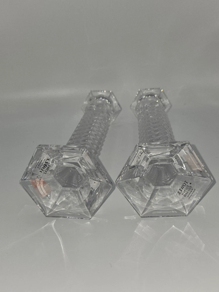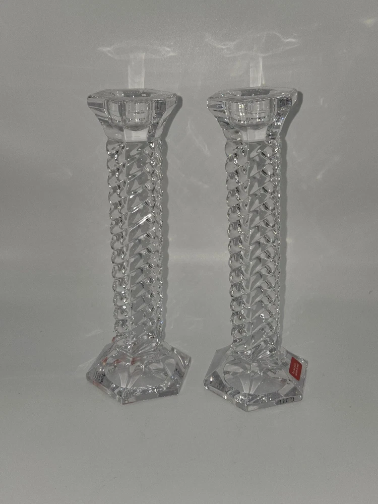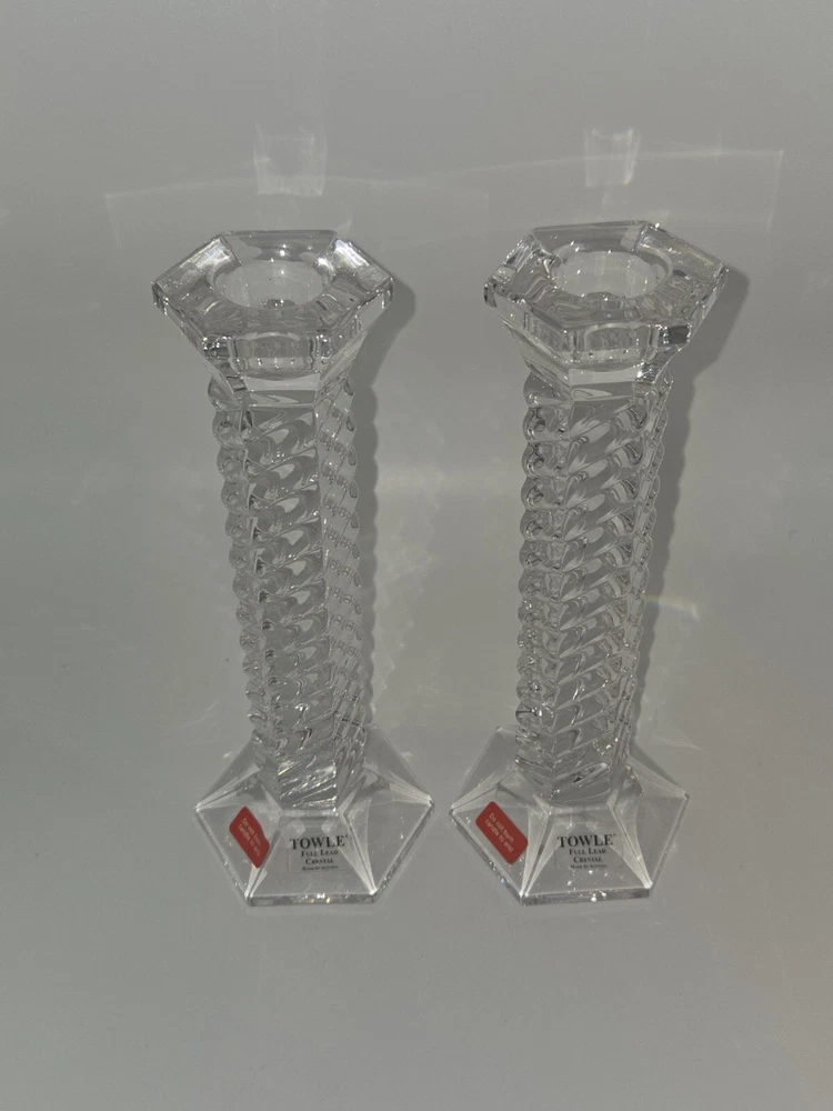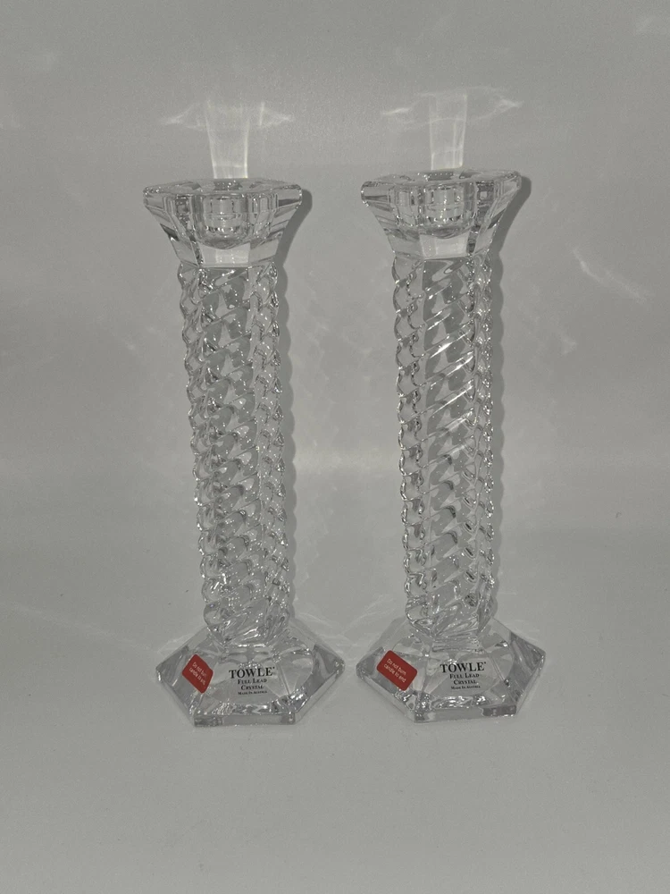 The TOWLE Leaded Crystal Candlesticks Holder Set features a pair of medium-sized candle holders, each measuring 8 inches in length. Made of clear crystal with intricate crystal detailing, these candlesticks are original pieces from Austria. They are suitable for all occasions and come in a set of two. The candle holders do not appear to be engraved and would make a beautiful addition to any decor with their elegant design and craftsmanship.
