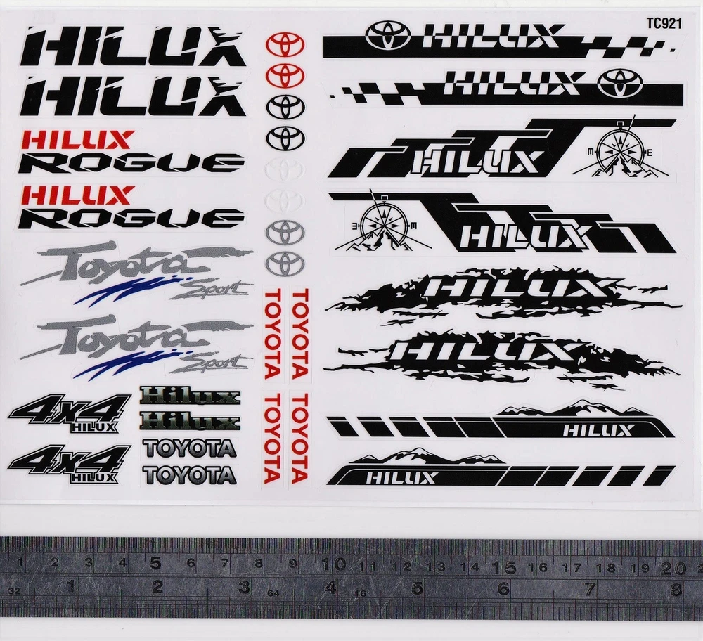 Decal Sheet for 1:10 radio control vehicle use. Theme Toyota HiLux. Set consists of 1 sheet - 205mm x 145mm. Pictures form the description-so check them out. NEW - Supplied in plastic bag. Enhance a plain paint job with very little effort. Part # 921 Check out other great bargains in my E b a Y store , including more Decal Sheets, parts and accessories. I am not a "drop shipper", all products are in stock in Australia being sold by an Australian seller. POSTAGE - AUSTRALIAN CUSTOMERS , Small items are sent as letters and are delivered by Australia post to your letterbox only. If you want to use the Express Post service please buy one item and select Express post, then buy any other items you want with regular post (the default option). All items will be sent together via Express Post service……… INTERNATIONAL CUSTOMERS . For post quotes for multi item orders please message me. Thanks. All duties and taxes (if applicable) are the responsibility of the buyer. If you have any questions or special requests regarding this please feel free to message me. Manufacturers are constantly improving products and changes are made without prior notice. This means that changes can be made to products (including slight colour changes) from time to time. These changes in no way constitute any intent to change the basic description of an item, nor do they constitute a reason for an item’s return or warranty replacement. Return Policy: Any returns will be handled as per Ebay’s return policy. Returned items must be new, unopened and undamaged. Opened returns will attract a 50% “reduced value” fee. Any unrecoverable costs and fees incurred (by me) will be deducted from any refund issued. Warranty: items have a 30 day warranty, except drift wheels – which is ‘dead on arrival’ only. Warranty doesn’t cover crash damage, poor maintenance, misuse or incorrect assembly. Warranty covers sold items only.