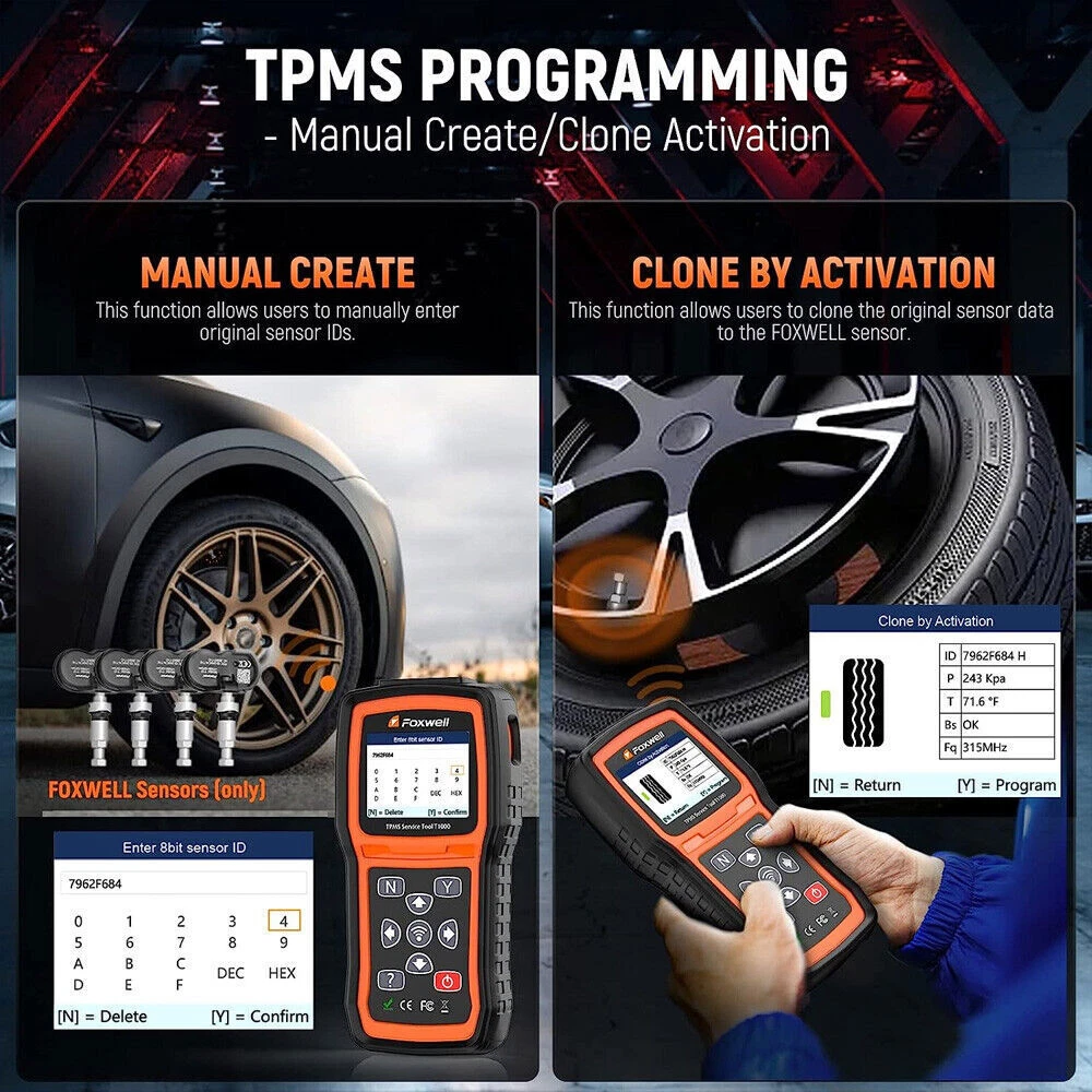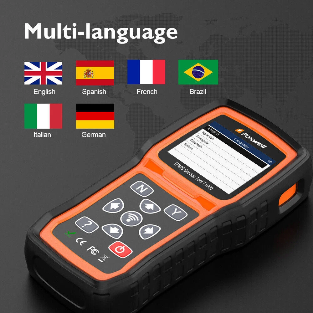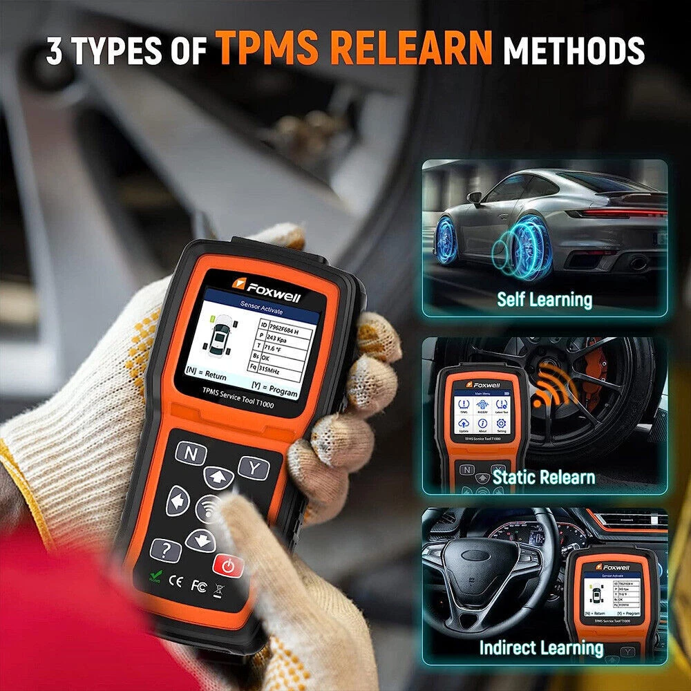 FOXWELL T1000-Professional TPMS Relearn Tool with sensor activation and programming Why Monitor Tire Pressure? Tire Pressure Monitoring helps drivers to properly maintain their vehicle tires, improves vehicle safety and fuel efficiency. 33,000 crashes are a result of under-inflated tires. 75% of roadside flats are caused by a slow leak or under inflation. 35% of drivers admit to never checking tire pressure. NHTSA estimates TPMS could save as many as 660 lives annually. What will you do when you notice the illuminated TPMS warning light? ✘ - Ignoring the warning light will cause you are risking tire failure or even serious injury. ✘ - Going to the workshops for a comprehensive check is effective, but it will cost more than your budget. ✔ - A FOXWELL T1000 costs little of the money to check TPMS in a workshop and it can perform the same professional functions as well. FOXWELL T1000- Professional TPMS Relearn Tool with sensor activation and programming- It's 2021 new generation FOXWELL TPMS service tool to activate OEM/Universal TPMS sensors, retrieve TPMS sensor data (sensor ID,tire pressure, temperature, battery condition and OE part number), relearn 98% sensor IDs, program FOXWELL T10-sensor to replace bad sensors and testing RF Remote Keyless Entry Key Fob. Activate 98% OEM/Universal TPMS sensors: in All wheel mode and in Single wheel mode. Programming FOXWELL T10 Sensors: Copy by Activation; Manual Create; Auto Create. 3 TPMS Relearning Methods: self learning; indirect learning; static learning. Fast Reading Sensor Data: Include sensor ID, tire pressure, temperature, battery, frequency and etc Key Fob Testing Tool: precisely test 315MHz and 433MHz key fobs to ensure whether it is perfectly running Solid and Rugged Construction: it's well-constructed with materials designed to handle harsh work environment Intuitive and Easy Instructions: easy to navigate and operate with clear instructions and detailed user manual Protective Blow Molding Box: will be top gift idea with original carrying case and prevent your scanner from damage Save your Time and Money: solve the TPMS issues easily with this TPMS tool without going to dealership Programming FOXWELL TPMS Sensors Note: This TPMS programming function can only work with FOXWELL T10 sensor. With this TPMS programming tool, you can program FOXWELL exclusive T10-sensor to meet the specifications of a particular vehicle before new sensor installation and relearn. Therefore, the healthy T10 Sensors can measure tire pressure and temperature accurately, allowing you to know tire health conditions, which can replace more than 95% of the original or OEM sensors. 3 different sensor programming methods are supported by This FOXWELL TPMS programming tool T1000: Copy by Activation; Manual Create; Automatic Create. ( Note: T1000 only program a replacement sensor only if it is the FOXWELLT10 sensor. ) Copy by Activation If your original sensor works and can be activated. You could use this method to program a new sensor. It will clone the original ID to the new FOXWELL T10 sensor. The Clone By Activation function lets users automatically write in the retrieved original sensor data to the FOXWELL Sensor which is used after the original sensor is triggered. 1)Highlight TPMS from the Main Menu and select the vehicle model as need. 2) Select Programming--Clone by Activation from the available menu. 3)Place the t1000 tool near the original sensor to be copied and press Activate to continue. 4)After trigger successfully, press Y to continue. 5)Place a new FOXWELL sensor near the TPMS tool (around 0-20 cm).6)Press Y to start the programming when the tool detect the sensor.7) Press N to exit after the programming successfully. Copy by Manual Input: If you know the original sensor ID, you could input the ID to program new sensor. The Manual Create function lets users to input the sensor ID manually. Input sensor ID. 1)Highlight TPMS from the Main Menu and select the vehicle model as need. 2)Select Programming--Manual Create from the available menu.3)Input the sensor ID in the dialog box and press Y to continue.4)Place a new FOXWELL sensor near the TPMS tool (around 0-20 cm).5)Press Y to start the programming when the tool detect the sensor.6)Press N to exit after the programming successfully. Auto Create 1-16 Sensors If you don't know the original sensor ID or your original sensor was bad, you could choose this method. Intall new sensor ID--program new sensor-->perform tpms learning and let the car recognize new sensor After programming the new sensor, you need to perform tpms learning function to learn the new sensor ID to your car. The tpms learning method will vary on specific car models.(the car shown in our video is cadillac XT5, and it's using static learning method.) The tpms tool will show you what kind of learning method you car will apply. The Automatic Create function is to program FOXWELL sensors by applying random IDs created according to the test vehicle when it is unable to obtain the original sensor ID.1) Highlight TPMS from the Main Menu and select the vehicle model as need.2) Select Programming--Automatic Create from the available menu.3) Place new FOXWELL sensors(1-16) near the TPMS tool (around 0-20 cm).4) Press Y to start the programming when the tool detect the sensor. 5) Press N to exit after the programming successfully. Note: T1000 only program a replacement sensor only if it is the FOXWELL brand. Almost all tpms programming tool in thie field have the same limitation. For example, if you purchase tpms programming tool from B brand, you should also purchase B brand sensor to peform this TPMS programming function Activate Almost All TPMS Sensors This FOXWELL TPMS scan tool T1000 enables you to activate 98% known OEM/Universal TPMS sensors in the market. You can rapidly and accurately trigger and decode sensors to read their ID, pressure, temperature, battery, frequency and OE Part number before servicing the tires/wheels or when you