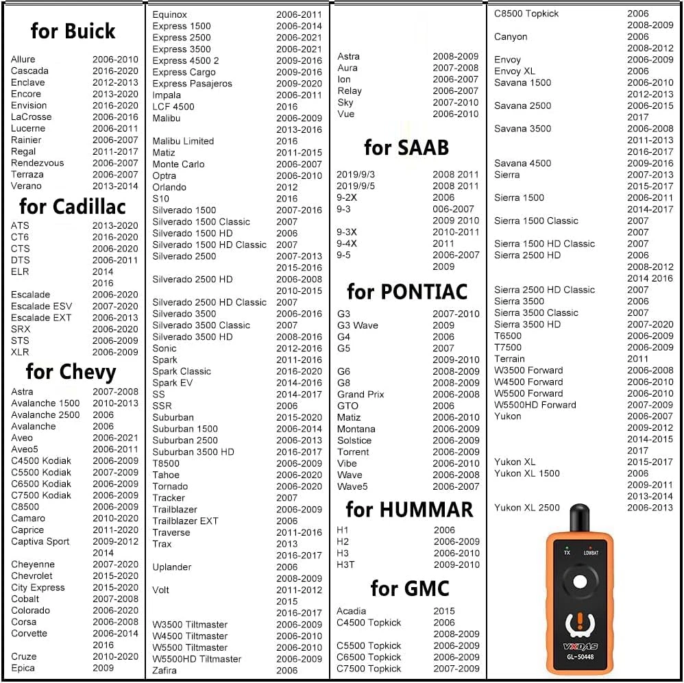 【FOR GM TIRE PRESSURE RELEARN TOOL】: GL50448 is an essential tool as tire pressure sensor replacement, tire pressure alarm remover tires.Works for GM 2006-2024(Chevy/Buick/GMC/Opel) 【EASY TO USE】2024 Updated Version GL50448 is simple, fast and easy to use, can help you reprogram all tire pressure easily within only 3 steps. Activates the individual TPMS sensors within 1-2 Mins by pressing one button 【SAVE TIME AND MONEY】Save your almost 20-80$,Activate Easily within 1-2 Mins.Much better than going to the dealer or a tire store just to get your pressure sensors reset 【UPGRADED VERSION】Sensitive sensor, Circuit Optimal Design, Easy to use, Activates the individual TPMS sensor with the press of one button.Ensure that the vehicle is in the relearn mode, and following the service procedure. Hold tool against the sidewall of the tire, near the valve stem. Depress press button while holding the tool against the tire sidewall 【FRIENDLY TIPS】1.Make sure to hold the battery in place ,or it will not work 【if you have a Excessive Installation problem about the battery,please Press down on the battery contact 2.When using tpms relearn tool , please make sure antenna in correct position 3. 9V battery should be in good condition,4.When activation of a tire is finished,sometimes the horn or flashing will feedback Product Description The video showcases the product in use. The video guides you through product setup. The video compares multiple products. The video shows the product being unpacked. Say goodbye to costly professional assistance and unnecessary trips to the auto shop! The VXDAS TPMS Relearn Reset Activation Tool is specifically designed for GM series vehicles (Chevy, Buick, GMC, Opel, Cadillac, etc.) from 2006-2023 equipped with a Tire Pressure Monitor System (TPMS) sensor. Exceptional build quality and durability for long-lasting use Friendly, recyclable materials for a sustainable choice Vibrant orange color For easy visibility in the garage, ensuring it's instantly recognizable and dirt-resistant 1 Factory Tested Models 2 Customers Tested Models 3 Quality 4 Materials 5 Bright Why You Need VXDAS TPMS Do tire rotation, didn’t have a quick and easy way to let ECU relearn new tire information New TPMS sensors installed, letting air out or adding air in to the tire couldn’t make the system recognize new sensors Low tire pressure or leakage / replacement or installation of tire pressure monitoring equipment / tire replacement, sensor damage, etc. After those problems are solved, TPMS needs to be reset When the tire pressure indicator light is ON, after the maintenance is performed, the tire pressure needs to be reset to turn off the TPMS light Exchanging the winter tires or Summer tires Follow the Instructions to Relearn Your TPMS Sensors: Placing a new 9V battery The battery is not included in the package The magnitude of the battery voltage affects the signal strength of the product TPMS learning mode Please reset the TPMS in the correct mode. CORRECT Position Point antenna on correct position The position of the tires is also important, Front tires have to be straight. Right Order Front left, front right, rear right, rear left Please make sure the antenna fits in the CORRECT position. 1 Step1 2 Step2 3 Step3 4 Step4 Quality Carefully Tips before Using: Equipped with 315/433MHz tire sensor. And A 9V Battery is needed, but is not provided. Please reset the tire pressure monitoring system in the correct mode Please make sure to use a Brand NEW 9V battery, the battery is not included in the package, and the magnitude of the battery voltage affects the signal strength of the product. Please make sure the antenna fits in the CORRECT position. The position of the tires is also important, Front tires have to be straight. Not for heavy trucks with more than 4 tires. The TPMS tool is unable to reprogram sensors, it's a tpms reset tool. Do the tire reset outside instead of in the garage. For different vehicles Super GL50448 may need different times to reset all of your tire sensors after rotation. Sensors should be original OEM sensors which well programmed. Choose Your Right Car Tool Add to Cart Add to Cart Add to Cart Add to Cart Add to Cart Add to Cart Customer Reviews 4.4 out of 5 stars 7 4.0 out of 5 stars 398 3.9 out of 5 stars 49 4.1 out of 5 stars 983 4.1 out of 5 stars 983 4.1 out of 5 stars 2,052 4.4 out of 5 stars 1,514 Price $42.99 $ 42 . 99 $24.99 $ 24 . 99 $28.90 $ 28 . 90 — $15.99 $ 15 . 99 $12.91 $ 12 . 91 $19.99 $ 19 . 99 For GM &F0RD ✔ ✘ ✘ ✔ ✔ ✘ ✔ For GM ✔ ✔ ✔ ✔ ✔ ✘ ✔ For F0RD ✔ ✘ ✘ ✔ ✔ ✔ ✔ Digital Tire Pressure Gauge ✔ ✔ ✘ ✘ ✘ ✘ ✘ fOR motorcycles, and bicycles. ✔ ✔ ✘ ✘ ✘ ✘ ✘