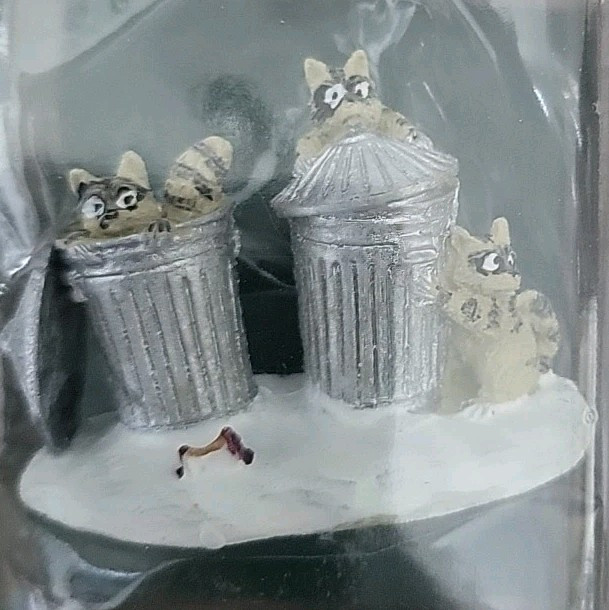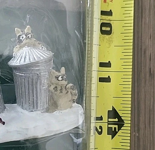 This small multicolored figurine display titled "TRASH BANDITS" features raccoons in a Christmas-themed scene, manufactured by Lemax in 2004. The display is not illuminated but provides a 3D effect, making it a unique addition to any room decor during the holiday season. This original figurine from Lemax showcases a group of raccoons engaging in festive decorating, adding charm to any holiday village or display setting.