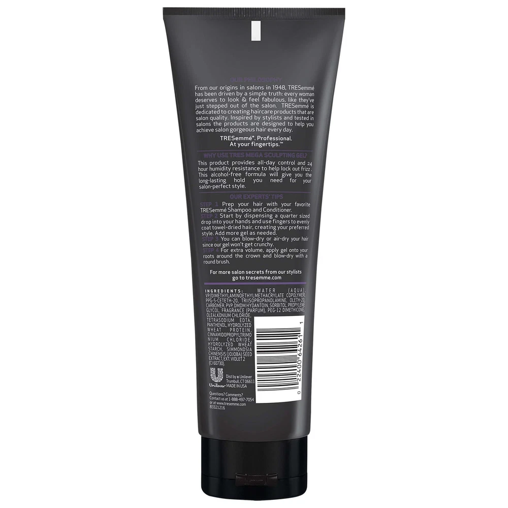 Product Description Tresemme Tres Two, Mega Control, Hair-Gel, for 24-Hour, Frizz Control #5, 9 Ounce (Pack Of 6) TRESemmé Mega Frizz Control Hair Styling Gel, Need a styling gel that delivers mega hold without feeling stiff or sticky? TRESemme Mega Control Hair Gel provides all-day resistance to humidity and keeps your style going strong without crunchy stiffness. After you put the work into your style, you better lock it in before you lose it. Sprays work best to lock in some styles, but when you're aiming for a sleek, tight look, you should use a styling hair gel for extra hold and humidity control. Built for control and ready to be styled, TRESemme Mega Control Hair Gel is an anti-frizz gel, giving you all-day hold with built-in 24-hour humidity protection. This mega control hair gel is perfect for slicking, shaping, or sculpting hair for that perfect look. Our unique, alcohol-free hair gel formula is great for all hair types and designed to keep your hairstyle on lock without leaving hair looking wet or feeling sticky. Step 1: Prep your hair with your favorite TRESemme shampoo and conditioner and hair styling products. TRESemmé Mega Frizz Control Hair Styling Gel, 9 oz MEGA FIRM STYLING HAIR GEL: TRESemmé Mega Control Hair Gel is a styling gel that adds long-lasting shine and mega hold to your hair for all-day control ANTI-FRIZZ GEL: This alcohol-free hair styling gel delivers all-day control with humidity resistance to help keep frizz away MAXIMUM HOLD: TRESemmé Mega Control Hair Gel is a stiff hair gel that locks in your style without ever looking sticky or wet TREND LED, RIGOROUSLY TESTED: Every ingredient is carefully selected to ensure your hair receives the best possible care. We do not test on animals and our hair products are PETA-approved HAIR CARE TIPS FROM OUR STYLISTS: Dispense a quarter-size drop into your hands and use your fingers to evenly coat damp hair, creating your desired style. Add more gel as needed FRIZZ FREE: Formulated with coconut oil, this formula gives all-day hold and 24-hour humidity resistance for resilient styles ALL-DAY HOLD: Level 5 hold, our strongest hold hair gel, is Infused with coconut oil. Achieve moisturized hair without compromising on hold CRUELTY-FREE: TRESemmé prohibits animal testing for our hair products and the ingredients used in them, anywhere in the world DO IT WITH STYLE: With professional quality hair products like our Mega Control Alcohol-Free Gel, you can confidently create your personal style Super firm control. Resistance To Lock Out Frizz And Lock In Style All Day Holds For 24 Hours In High Humidity Mega Firm Control For All Hair Types Product Benefits Humidity Resistant, Frizz Control Hair Type Curly Material Type Free Mineral Oil Free, Sulfate Free, Alcohol Free, Aluminum Free, Formaldehyde Free Scent Unscented Liquid Volume 9 Fluid Ounces Ingredients WATER (EAU), VP/DIMETHYLAMINOETHYLMETHACRYLATE COPOLYMER, PPG-5-CETETH-20, PHENOXYETHANOL, TRIISOPROPANOLAMINE, OLETH-20, CAPRYLYL GLYCOL, CARBOMER, PVP, SORBITOL, FRAGRANCE (PARFUM), PROPYLENE GLYCOL, PEG-12 DIMETHICONE, DISODIUM EDTA, PANTHENOL, COCOS NUCIFERA (COCONUT) OIL, BENZYL ALCOHOL, CITRONELLOL, GERANIOL, HEXYL CINNAMAL, LIMONENE, LINALOOL, EXT. VIOLET 2 (CI 60730).