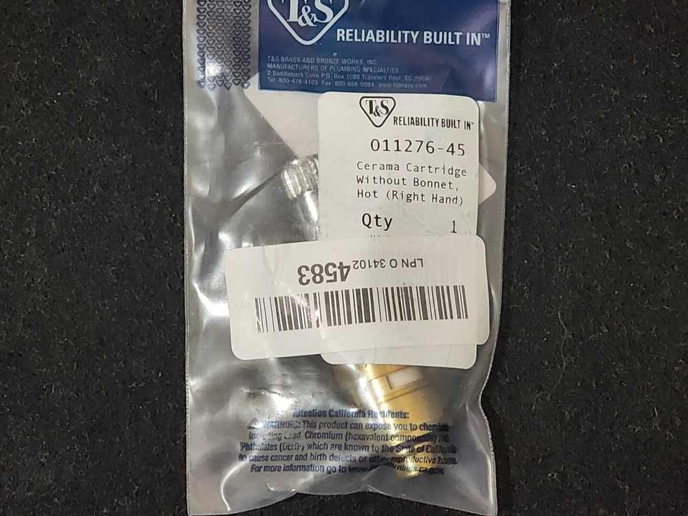The T&S Brass 011276-45 Ceramal Cartridge is a high-quality replacement cartridge designed to fit various commercial and residential faucets. Manufactured with durable materials and precision-engineered ceramic disks, this cartridge provides smooth handle operation and long-lasting leak-free performance . ✅ Features: ✅ Precision Ceramic Disks – Ensures smooth and reliable valve operation ✅ Durable Construction – Built for long-term use in commercial and residential settings ✅ Direct Replacement – Fits T&S Brass faucets requiring model 011276-45 cartridge ✅ Easy Installation – No special tools needed ✅ Resists Leaks and Drips – Maintains water-tight seal over time 🔧 Specifications: Part Number: 011276-45 Type: Ceramic Cartridge Material: Ceramic, brass Condition: New 🛠️ Replaces Part Numbers: 011276-45 🚰 Compatible Models: T&S Brass Faucets (various models requiring cartridge 011276-45) Suitable for commercial kitchen and utility faucets ⚠️ Note: Verify compatibility with your faucet model before purchase to ensure proper fit. 📦 Shipping: 📦 Fast & Free Shipping ⏰ Ships within 1 business day 🔍 Tracking provided upon shipment 🔄 Returns: ✅ 30‑day return policy – item must be unused, in original condition, and buyer pays return shipping r222 r290