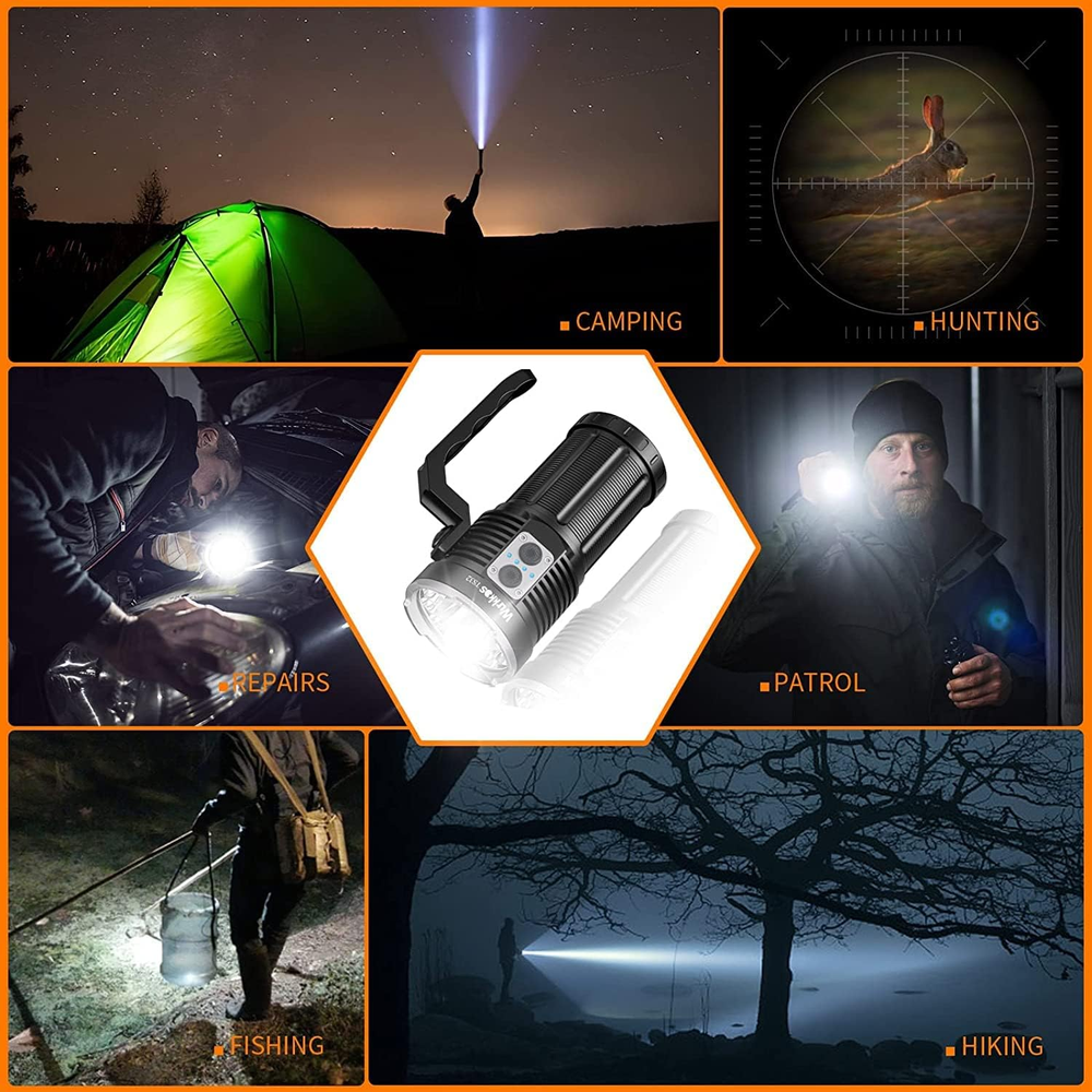 Store New Arrivals Add to Favorite View Feedback Contact TS32 Super Bright Led Flashlight 13000 Lumens Max, Powerful Flashlight with 12*LH351D&1* SFT40 LED, Waterproof Handheld Rechargeable Flashlight for Camping Searching Hiking Description Item model number ts32-lh351d Light Source Type LED Power Source Battery Powered Battery Cell Composition Lithium Ion Country of Origin China Batteries Included? Yes Batteries Required? Yes Product Dimensions 8"D x 5.5"W x 3.1"H Material Aluminum Number of Batteries 3 Lithium Ion batteries required. (included) Item Package Quantity 1 White Brightness 13000 Lumens Brightness 13000 Lumen Water Resistance Level Waterproof Item Weight 2.05 pounds Special Features Rechargeable Special Feature Rechargeable Part Number ts32-lh351d Color TS32- LH315D Batteries 3 Lithium Ion batteries required. (included) Included Components Batteries included Super Bright Led Flashlight--Rechargeable led flashlight built-in upgraded 12pcs LH351D floodlight led and 1pcs SFT40 Middle Spotlight Led. Together Max high output up to 13000 lumen the two light modes. And the ultra-wide beam can easily illuminate Brighten the whole room and backyard and even the football field. Two Light Source-- The high powered flashlight combine floodlight and spotlight, the two modes not only use alone, but also use together. Great for camping hiking searching adventure etc. USB C Rechargeable and Discharging-- The flashlight hidden a usb c charge port on the head, which makes your daily charge quick and convenient. Besides, it support discharging, charge your phone at emergency case. Dual Electric Side Switch -- High lumens flashlight has dual side switch, the upper control spotlight, the lower switch control floodlight, which feels very nice. Steped and Ramping Mode-- The flashlight features two mode groups: Group 1 with stepped modes and Group 2 with a stepless ramping mode. Simple UI, easy to operate by every one. IP68 Waterproof Flashlight-- Aerospace grade 6061 grade aluminum alloy body, two waterproof o-rings, waterproof usb c charge port cap, makes flashlight with powerful water resistance, don’t worry use it in rain. 90 High CRI --TS32 powerful led flashlight is high CRI, meaning colors look natural and vibrant. It would make a great tool for photography. Product Description High Powered Rechargeable Flashlight TS32 Very solid and bright flash light. Ensure you really tighten the housing after removing the protective film. The high lumens flashlight gives you the latest and greatest emitters for both flood and throw. It does a great job on both selections. Very bright and focused beam with a nice white light. High 90 CRI, IP68 waterproof, quick usb c rechargeable, removable handle, a heavy duty flashlight design for camping searching hiking adventure. Simple UI, friendly to everyone. Group 1: Stepped modes (default) Spotlight Modes: Eco(10lm)-Low(150lm)-Mid(400lm)-High(900lm)-Turbo(2000lm) Floodlight Modes:Moonlight(5lm)-Eco(50lm)-Low(400lm)-Mid(1200lm)-High(3600lm)-Turbo(12000lm) Strobe modes(both beam lights on):strobe-SOS-beacon Group 2: Ramping mode Spotlight adjust from 10lm to 2000lm;Floodlight adjust from 1lm to 12000lm Ramping mode gives you full flexibility to adjust brightness steplessly from Eco/Moonlight to Turbo level. Toggle between Group 1 and Group 2 When ON Quick quadruple click to change between both mode groups. 3 flashes will confirm the mode group changed. Good Connection Removable Handle IP68 Waterproof USB C Rechargeable Flashlight and Power Indicator Power Indicator TS32 has 4 pieces LED indicator between the two side switches,when on, it will turns off automatically in 32-40 seconds if without any operation. Remaining battery power shows when Charging: 4 indicator lights on= 100% 3 indicator lights on,1 indicator light flashing=more than 75% 2 indicator lights on,1 indicator light flashing=50%-75% 1 indicator lights on,1 indicator light flashing=25%-50% 1 indicators flashing(0.5hz)=less than 25% Remaining battery power shows when Reverse Charging: 4 indicator lights on=more than 75% 3 indicator lights on=50%-75% 2 indicator lights on=25%-50% 1 indicator lights on=3%-25% 1 indicators flashing(1hz)=0%-3% Electronic Lockout Function TS32 comes with a lockout function to prevent accidental activation, e.g. in one’s pocket or backpack. How to get the lock out mode? When flashlight is off: Quick quadruple click to active lockout . Another quadruple click to deactive lockout again and return to the previous mode setting. When the light is locked, the main LED only blinks two times to show the status of being locked. While in lockout mode, hold the side switch to use Eco mode. ABOUT US We offer the best prices around on high quality products. Our E-store includes media such as books, movies, music and games while offering electronics, toys, sporting apparel, clothing, tools, general home, garden items and more. SHIPPING We are always working hard to ensure your package arrives as soon as possible. Please understand that some factors like weather, high postal traffic, and the performance of shipping companies are outside of our control. We offer free shipping to the lower 48 states and ship within 2 business days of payment, usually sooner. We do not accept P.O. Boxes. Please provide a physical address. For shipping outside of the continental USA, we only use eBay's Global Shipping Program.The item is shipped to KY and then sent to the rest of the world. International customers are responsible for all duties and taxes. Continue to check out in order to calculate costs for shipping the item to your country. Messages regarding eBay's Global Shipping Program MUST be directed at eBay EXCLUSIVELY. RETURNS We offer a 30-Day Return Policy on items which you are not completely satisfied with. You have the option for a full-refund or an exchange of the item. No returns are available on items shipped outside of the USA. PAYMENT We accept PayPal. CONTACT US This page content is 