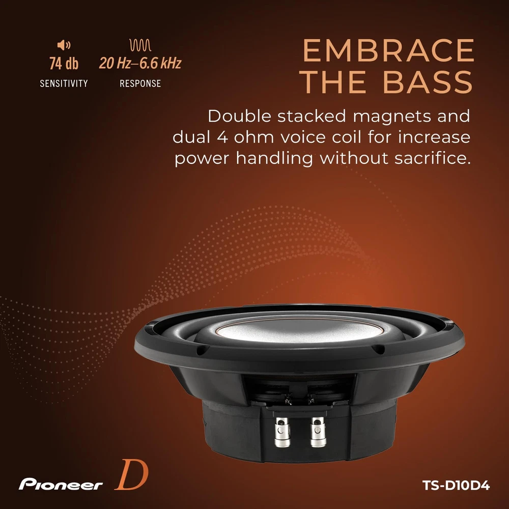Elevate your car audio experience with the TS-D10D4 Dual 4 Ohms Voice Coilsubwoofer. Designed to deliver powerful bass in a compact package, this subwoofer brings depth and impact to your music. Too much isn’t enough, embrace the bass. The D subwoofer is a culmination of technologies that produce thick, deep, powerful and accurate bass that makes listening to your favorite music energetic, fun and engaging. Combining bass quality and bass quantity with high power, plus installation flexibility that provide high performance in both acoustic suspension (sealed) and bass reflex (ported) enclosures, the D subwoofer is the ultimate all-around performer. Made of a specially blended, highly durable and moisture-resistant compound, butyl rubber keeps the cone moving in a linear direction, seals the cone to the basket and quickly dampens cone vibration once the signal has changed or stopped. This results in less distortion and superior frequency response. Polypropylene (PP) is a tough thermoplastic resin that is an ideal material for a subwoofer cone - with low mass and high damping, PP cones offer good sensitivity and low distortion. However, polypropylene cones lack the rigidity and strength required for high output and extreme low bass. To resolve this, engineers used advanced Computer-Aided Manufacturing to develop a process to blend aramid fibers into the polypropylene resin during the injection molding process. The resulting Aramid Fiber Interlaced IMPP subwoofer cone is incredibly strong and low mass with high rigidity and superior strength to produce deep, powerful and undistorted bass. A subwoofer motor structure consists of the voice coil and magnet assembly. Increasing the diameter and length of the voice coil provides greater control of the woofer cone and higher power handling. To take full advantage, however, the magnet must also be increased, both in magnetic power and physical size. The D subwoofer uses an oversized 4-layer voice coil and high energy double stacked magnets to increase the overall power handling and SPL output with no sacrifice in sound quality. Experience exceptional sound reproduction with the TS-D10D4 Dual 4 Ohms Voice Coil subwoofer. Feel the rhythm, hear the impact, and immerse yourself in powerful bass that transforms your driving experience. Upgrade your car audio system and enjoy music the way it was meant to be heard. Powerful Bass - 10-inch subwoofer, it produces a dynamic bass response that enhances the audio experience. It adds depth and richness, creating an immersive and thrilling soundstage that brings your music to life Butyl Rubber Surround - Butyl rubber keeps the cone moving in a linear direction, seals the cone to the basket and quickly dampens cone vibration once the signal has changed or stopped. This results in less distortion and superior frequency response Aramid Fiber Interlaced Injection Molded Polypropylene (IMPP) - The Aramid Fiber Interlaced IMPP subwoofer cone is incredibly strong and low mass with high rigidity and superior strength to produce deep, powerful and undistorted bass Large Diameter Voice Coil and Double Stacked Magnets - The D-Series subwoofer uses an oversized 4-layer voice coil and high energy double stacked magnets to increase the overall power handling and SPL output with no sacrifice in sound quality Excellent Sound Reproduction - Its high-quality components and precise engineering delivers accurate and detailed sound. The design and construction minimizes distortion, for clean and crisp bass response Instruction & Operation – Please see the Owner’s Manual for full detail and operation found near the bottom of this page (Technical Specifications). Cutout Hole: 9”