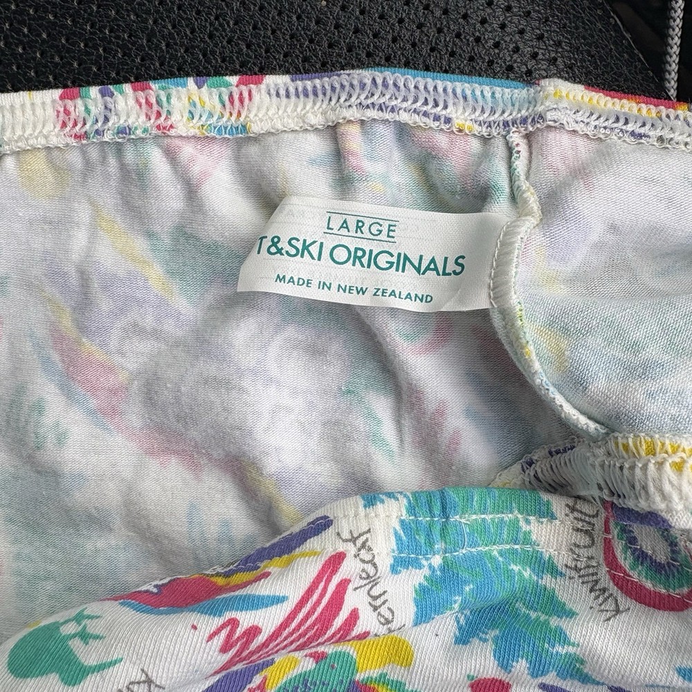 Elevate your underwear game with these T&Ski Originals New Zealand Cheeky Panties in a size Large. Made from 100% cotton, these panties are perfect for everyday wear. The multicolor design features a fun animal theme that is sure to make you stand out in the crowd. Designed for women who want to feel comfortable and stylish, these panties are perfect for skiing or any outdoor activity. The cheeky style provides a flattering fit and the brand's high-quality construction ensures long-lasting durability. Made in New Zealand, these panties are a must-have for any wardrobe.