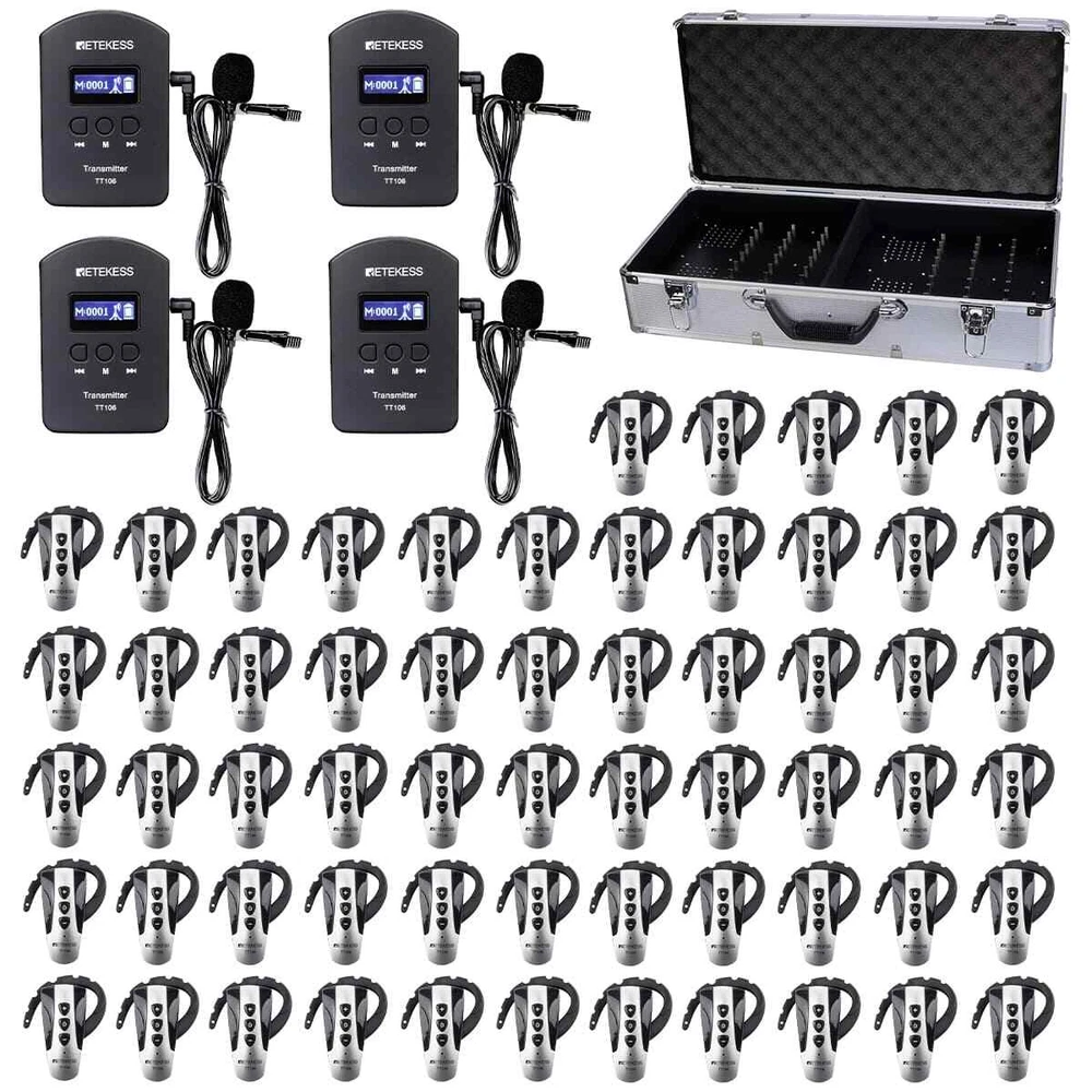 If you want to buy at more favorable price, or want to freely match the receiver, please contact customer service Shipping Service:Priority DHL Express from China to deliver item(2-7 business days) TT106 Tour Guide Audio Assisted System 2 Transmitter 60 Receiver Charger Case US Features TT106 guide system with digital signal transmission; longer distance; higher confidentiality; strong anti-interference ability; clear audio quality; widely used in churches; simultaneous interpretation; seminars; exhibitions; art galleries and other learning activities ; special vocational training. Professional wireless audio guide system; adopt used globally signal transmission, with 9999 selectable channels; 9999 IDs allow up to 9999 tour groups to operate simultaneously in the same vicinity. One-click to set the channels of all receivers; one-click to turn off all connected receivers; one-click to mute all receivers; if the interpreter sometimes does not want the listener to hear him; he can press the mute button and the listener cannot hear his speech. Communication range up to 150 m / 492 ft; built-in 1300mAh rechargeable lithium battery in the transmitter can be used for 25 hours; and built-in 380mAh rechargeable lithium battery in the receiver can be used for 23 hours. Easy to carry; each small device comes with its own charger; small size; transmitter weighs 0.15 pounds and each receiver weighs 0.04 pounds; easy for listeners to use; the transmitter has a MIC input for the microphone; and supports mono external AUX audio input; such as smartphones; laptops; church audio systems. Specification TT106 Wireless Transmitter TT106 Wireless Receiver Frequency Range 2400~2483MHz Frequency Range 2400~2483MHz ID Number 9999 ID Number 9999 Supply Voltage DC3.7V Supply Voltage DC3.7V Transmitting power ≦50mW TIS -90dBm Frequency stability ±0.001﹪ Frequency stability ±0.001﹪ SNR 80dB SNR 80dB Size 97*63*18mm Size 65*58*11mm Weight 70g Weight 18g Charge time 3H Charge time 2H Working time 25H Working time 23H Battery specification 3.7V/1300mA Battery Specification 3.7V/380mA Charge Jack MINI USB Charge Jack MINI USB Modulation frequency deviation ±320KHz Modulation frequency deviation ±320KHz Working current 62mA Working current 15mA Communication range 150m (open air) Standby current 1mA Charging voltage DC5V Charging current 320mA Communication range 150m (open air) Charging voltage DC5V Charger Case Features: Can charge for 2pcs T130 transmitters and 30pcs T131 receivers at the same time Aluminum alloy, durable and fire resistant Portable design, you can put down all the accessories As your team grows, if you have more receivers, this charging case is your good helper Input : AC110-220V, 50/60Hz Output: DC 5V, 7A Size: 500 x 265 x 140mm / 19.7 x 10.4 x 5.5 in Weight: 3200g / 7lbs Package Includes 2 x TT106 Wireless Transmitter 60 x TT106 Wireless Receiver 1 x Lavalier Mic 61 x USB Cable 61 x Lanyard 1 x English User Manual 1 x 32 slot charging base Long Service Time 1300mAh rechargeable lithium battery for transmitter; 3H get full charged, 25H continuous use; 380mAh for receivers; 2H get full charged, 23H continuous use. AUX Input Jack Transmitter support 3.5mm AUX input which enables to connect a MP3, PC, phone, etc. to plug as sound sources; You can play background music or pre-recorded voice files by this function. One Key Mute Tour guide transmitter has mute function; If the interpreter sometimes does not want the audience to hear his speech, he can press the mute button and the audience will not hear his speech. 2.4GHz Global Public Use Signal Stable transmission; High security and confidentiality. Support 2 Transmitters Work Simultaneously Receivers could hear voice messages from two transmitters on the same channel; Note:If need more transmitters or receiveds,please contact our customer service. Translation System One click turn off all paired receivers; 9999 IDs allows 9999 tour groups to operate simultaneously in the same area; Unlimited number of receivers can be paired to a tour guide transmitter. Ear-hook Design for Tour Guide System Receivers Light weight, 18g for each receiver, 70g for each transmitter; Comfortable, no need to plug the receiver headset into ear; One click to make all receiver mute. USB Charging Tour Guide System Receivers USB chraging slots for each receiver; USB charging cable for each receivers are included; One click to turn off all connected receivers. Translation System for Churches You can adjust volume to a comfortable level without disturbing others; Set channels for all receiver simultaneously . About Us