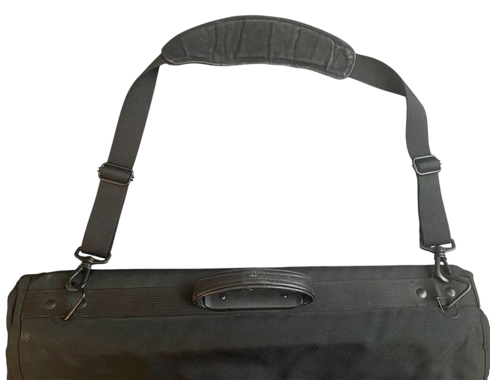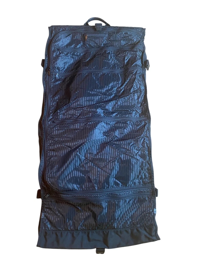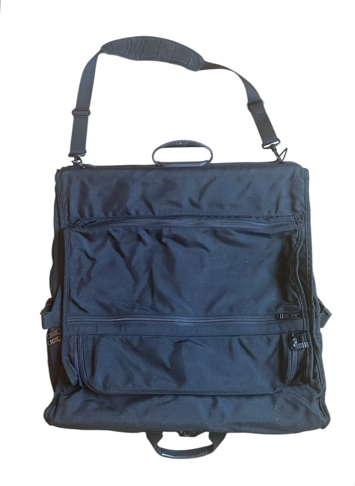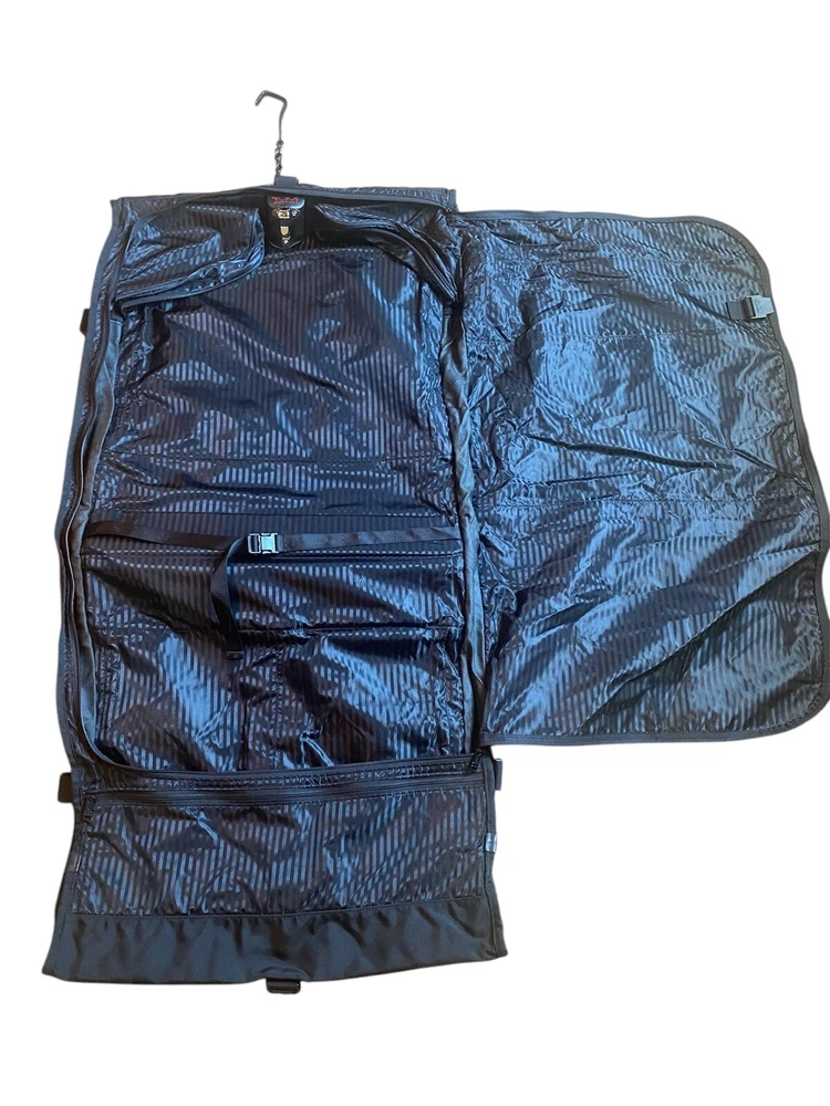 TUMI Bi-Fold Garment Bag Luggage Ballistic Nylon Suit Dress BLACK Made In USA. Pre owned condition. Measurements : Fold 24” x 23” Unfold 48” x 23”