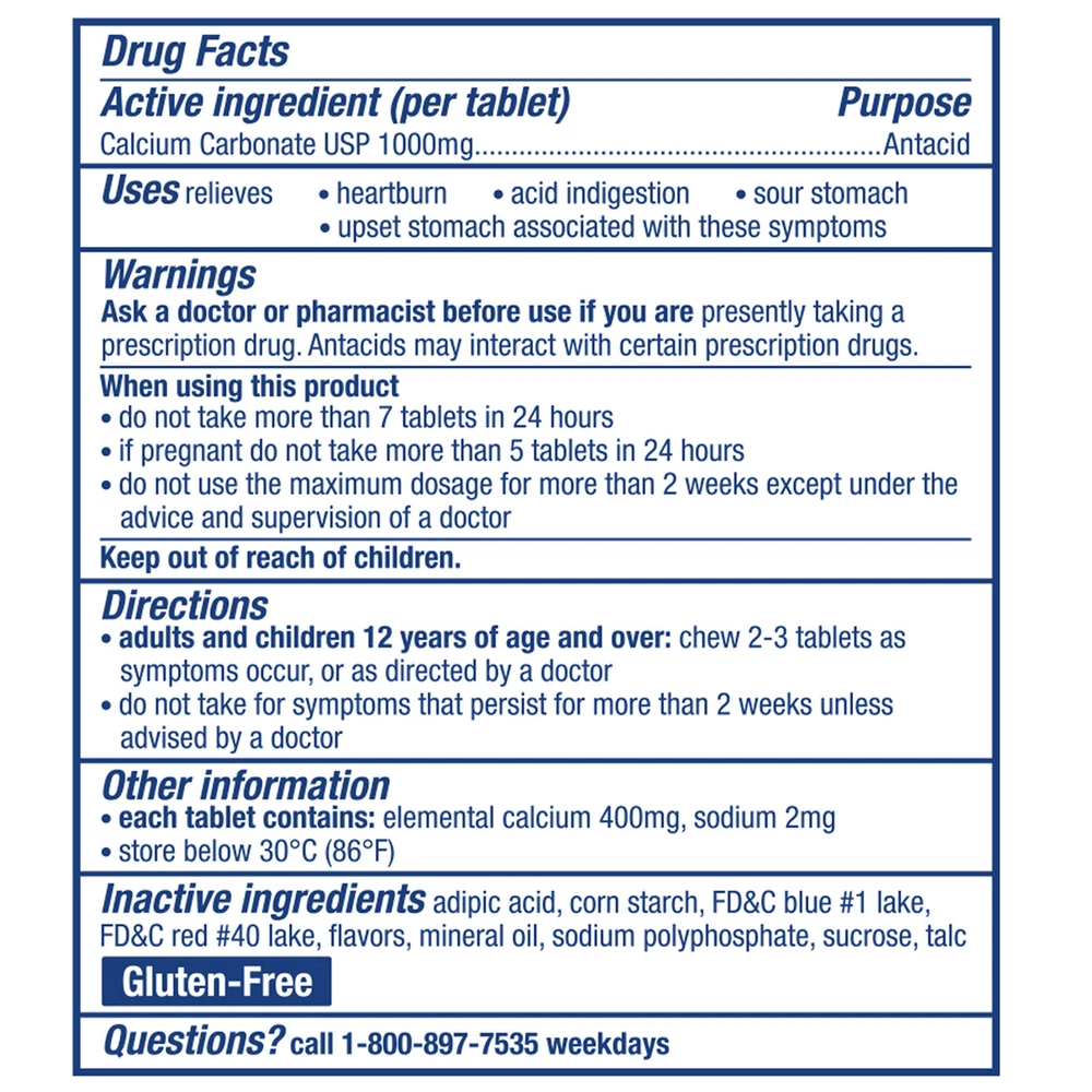 Store New Arrivals Add to Favorite View Feedback Contact TUMS Antacid Ultra Strength, 265 Chewable Tablets Description Features FSA Eligible Form Tablet Quantity 265 Tablets TUMS Ultra Strength Chewable Antacid Tablets go to work in seconds by starting to neutralize acid on contact to bring fast and powerful ultra strength heartburn relief CONTENTS: 1 bottle containing 265 TUMS Ultra Strength Chewable Antacid Tablets for Heartburn Relief in easy to take, delicious Assorted Berry flavors - Strawberry and Raspberry MULTI-SYMPTOM RELIEF: This acid indigestion remedy treats the four signs of heartburn: burning in the chest, acid indigestion, sour stomach and upset stomach associated with these symptoms FAST AND POWERFUL STRENGTH: Nothing works faster! This ultra strength antacid goes to work instantly by starting to neutralize acid on contact GLUTEN FREE AND KOSHER: This heartburn and acid indigestion medicine has the active ingredient 1000 mg calcium carbonate #1 DOCTOR RECOMMENDED: TUMS antacids are the #1 recommended adult antacid brand by doctors, pharmacists and OBGYNs Suggested Use: Relieves: Heartburn. Acid indigestion. Sour stomach. Upset stomach, associated with these symptoms. Ingredients: (per tablet) Calcium Carbonate USP 1000mg – Antacid Adipic acid, corn starch, FD&C blue #1 lake, FD&C red #40 lake, flavors, mineral oil, sodium polyphosphate, sucrose, talc Warnings: Ask a doctor or pharmacist before use if you are presently taking a prescription drug. Antacids may interact with certain prescription drugs. When using this product, do not take more than 10 tablets in 24 hours. If pregnant do not take more than 6 tablets in 24 hours. Do not use the maximum dosage for more than 2 weeks except under the advice and supervision of a doctor. Keep out of reach of children. Each Tablet Provides 400 mg of Elemental Calcium Gluten Free Calcium Carbonate 1,000 mg. Assorted Berry Flavor ABOUT US We offer the best prices around on high quality products. Our E-store includes media such as books, movies, music and games while offering electronics, toys, sporting apparel, clothing, tools, general home, garden items and more. SHIPPING We are always working hard to ensure your package arrives as soon as possible. Please understand that some factors like weather, high postal traffic, and the performance of shipping companies are outside of our control. We offer free shipping to the lower 48 states and ship within 2 business days of payment, usually sooner. We do not accept P.O. Boxes. Please provide a physical address. RETURNS We offer a 30-Day Return Policy on items which you are not completely satisfied with. You have the option for a full-refund or an exchange of the item. No returns are available on items shipped outside of the USA. PAYMENT We accept PayPal. CONTACT US This page content is yet to come Please ad us to your favorite seller and visit again later Thank You CUSTOMER SATISFACTION We try our very best to make sure every customer is completely satisfied. If there's a problem, message us! We're happy to help.