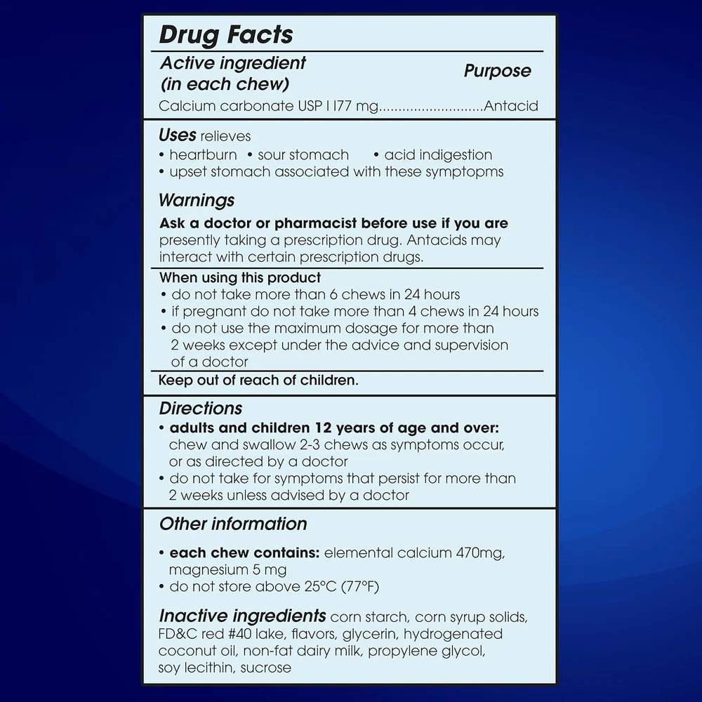 Store New Arrivals Add to Favorite View Feedback Contact TUMS Chewy Delights Ultra Strength Antacid Soft Chews for Chewable Heartburn Relief and Acid Indigestion Relief, Very Cherry - 32 Count Description Item model number 749115 Item dimensions L x W x H 5 x 2 inches Is Discontinued By Manufacturer No Brand TUMS Product Benefits Digestive Health Item Weight 0.35 Pounds Special Feature Excellent source of calcium Manufacturer Haleon US Services Inc. Contents: 1 resealable bag containing 32 individually wrapped TUMS Chewy Delights Ultra Strength Antacid Soft Chews for Chewable Heartburn Relief and Acid Indigestion Relief in an easy to take, delicious Very Cherry flavor Multi-Symptom Relief: This heartburn medicine treats the four signs of heartburn: burning in the chest, acid indigestion, sour stomach and upset stomach associated with these symptoms Fast And Powerful Strength: Nothing works faster! These ultra strength antacid soft chews go to work instantly by starting to neutralize acid on contact Gluten Free And Kosher: These soft antacid chews have the active ingredient 1000 mg calcium carbonate #1 Doctor Recommended: TUMS is the #1 recommended adult antacid brand by doctors, pharmacists and Ob-Gyns Trusted Brand: TUMS is America’s #1 antacid, providing trusted heartburn relief for 90 years, supported by a satisfaction guarantee TUMS Chewy Delights Ultra Strength Antacid Soft Chews go to work in seconds for simple, delicious, chewable heartburn relief. When symptoms occur, chew and swallow two to three ultra strength antacid chews, depending on the severity of your acid indigestion. Featuring the active ingredient calcium carbonate, these soft antacid chews provide heartburn, acid indigestion and sour stomach relief, and upset stomach relief associated with these symptoms. Delicious and fast, these soft antacids come in a tasty Very Cherry flavor. TUMS is the #1 recommended adult antacid brand by doctors, pharmacists and OBGYNs. As America�s #1 antacid and trusted as a heartburn medicine for 90 years, TUMS is fully supported with a satisfaction guarantee. These Very Cherry antacid soft chews are individually wrapped and packaged in a convenient bag that�s easy to stow for whenever heartburn strikes. With TUMS Chewy Delights, you get fast acting heartburn relief and acid indigestion relief in every individually wrapped soft chew. ABOUT US We offer the best prices around on high quality products. Our E-store includes media such as books, movies, music and games while offering electronics, toys, sporting apparel, clothing, tools, general home, garden items and more. SHIPPING We are always working hard to ensure your package arrives as soon as possible. Please understand that some factors like weather, high postal traffic, and the performance of shipping companies are outside of our control. We offer free shipping to the lower 48 states and ship within 2 business days of payment, usually sooner. We do not accept P.O. Boxes. Please provide a physical address. RETURNS We offer a 30-Day Return Policy on items which you are not completely satisfied with. You have the option for a full-refund or an exchange of the item. No returns are available on items shipped outside of the USA. PAYMENT We accept PayPal. CONTACT US This page content is yet to come Please ad us to your favorite seller and visit again later Thank You CUSTOMER SATISFACTION We try our very best to make sure every customer is completely satisfied. If there's a problem, message us! We're happy to help.