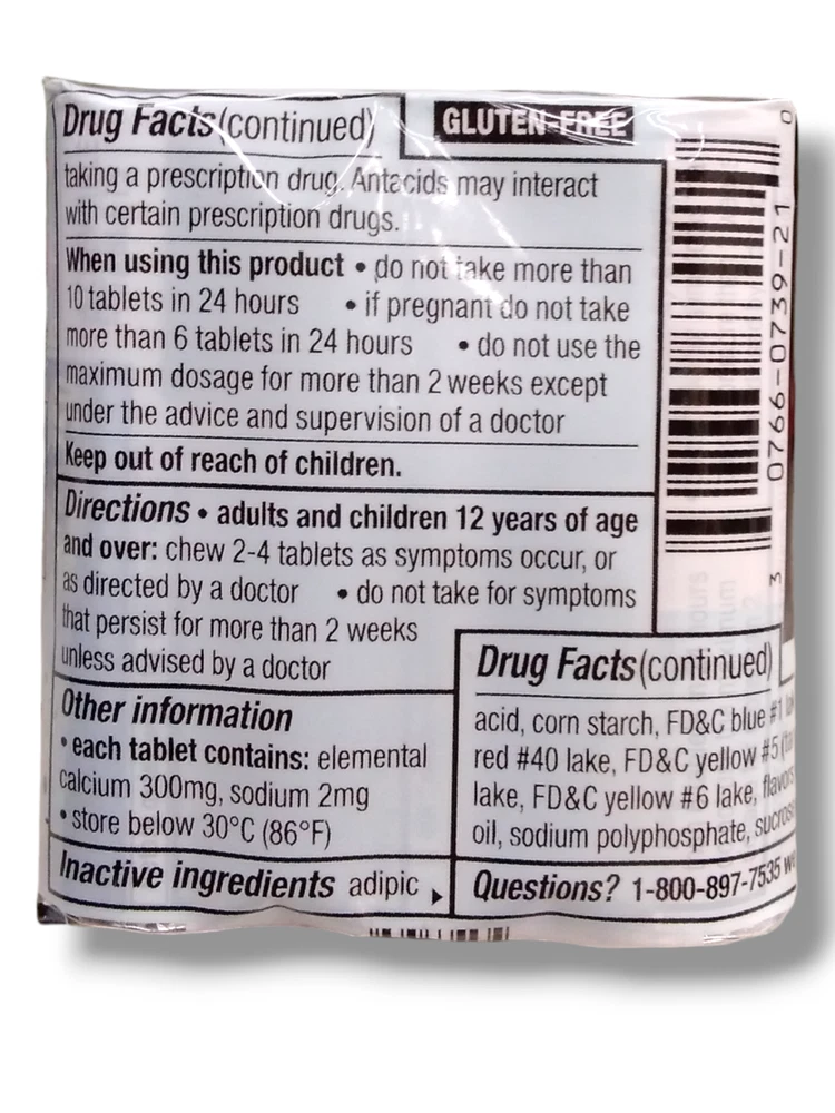 TUMS is an antacid used to relieve heartburn, sour stomach, acid indigestion, and upset stomach associated with these symptoms. Many other heartburn medications are absorbed into the bloodstream and can take hours or day to fully work. TUMS, with active ingredient Calcium Carbonate, travels directly to the source of the heartburn. TUMS starts to neutralize the heartburn-causing acid in your stomach on contact which provides fast relief for your tough heartburn. Can you take TUMS while pregnant? If you experience heartburn during pregnancy, there are treatments your doctor can prescribe or recommend. TUMS is effective for occasional heartburn and TUMS is the #1 OB/GYN recommended brand of antacid.* The maximum daily dosage for Extra Strength is 6 tablets in 24 hours and for Ultra Strength is 5 tablets in 24 hours. Ask your doctor if TUMS and other options are appropriate for you. Do TUMS contain gluten or dairy? All TUMS products have been gluten tested and meet the guidelines for “gluten free.” TUMS Extra Strength, Ultra Strength, Sugar-Free and TUMS Smoothies are all dairy free. TUMS Chewy Delights contain dairy and TUMS Chewy Bites are manufactured at a plant that contains dairy.
