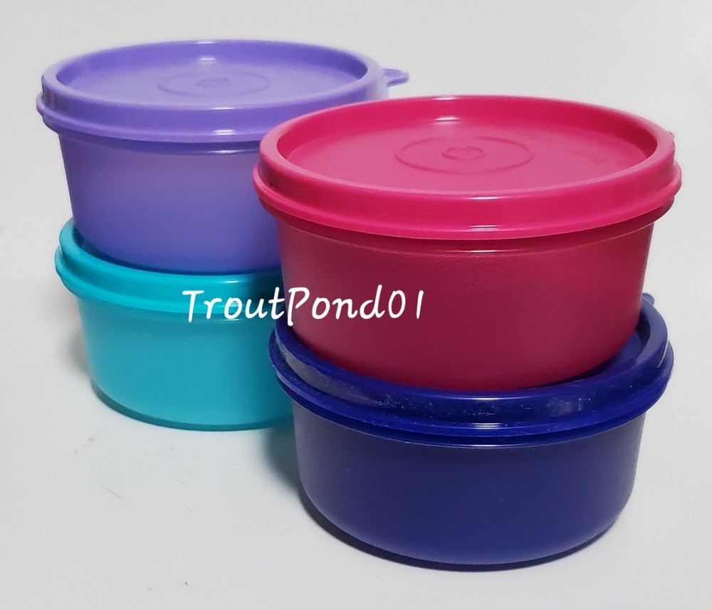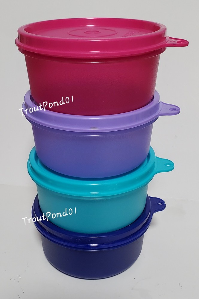 Set of (4) Tupperware Snack Serving Bowls Containers. Each bowl holds about 7 ounces. Measure approximately 3 3/4 inches diameter by 2 inches deep. Colors are indigo blue, aqua blue, lilac purple, and fuchsia pink with coordinating seals. Seals are virtually airtight and liquid tight. Great for travel, lunch box,snacks, leftovers, diaper bag, back pack, on the boat, picnics, camping, anytime! Dishwasher safe, BPA-free. Brand New. Questions are welcome, combined shipping available, fast service! International Buyers: Please be aware of the laws regarding import into your country. Your country may assess a customs fee or tax on this purchase. United States sellers do not have any control over the tariffs, taxes, and customs fees imposed by your country. You are solely responsible for any import duty or tax that your country may impose. No refunds or partial refunds will be made if you choose to abandon the package due to import fees. If a package is returned to the seller, shipping cost is non-refundable. Please do not ask to have customs information falsified as it is against the law.