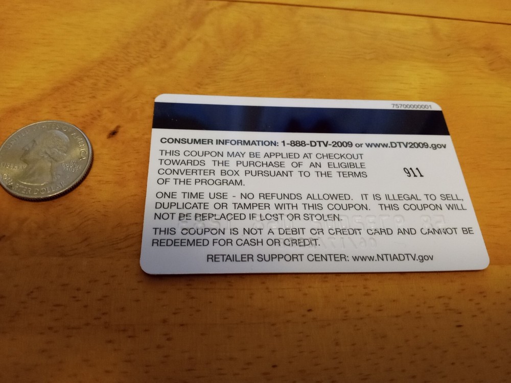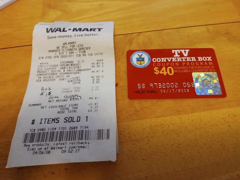 Back in 2008 I used this coupon to buy a digital to analog TV signal converter box. This card was issued by the Department of Commerce to help people that still had older TVs because the over the air broadcasters were required to convert to digital signals and many people still had old TVs. Also included is my receipt when I bought the box at Walmart. This TV Converter Box Coupon Card is a must-have for any collector of vintage media items. Released in 2008, this coupon card is a piece of history that represents the transition from analog to digital television. It's a great addition to any collection of memorabilia related to television, radio, or phones. The card features a unique design and is in great shape, with no damage or discoloration. It's an authentic piece of vintage media that's perfect for display or as a conversation starter. Don't miss out on the opportunity to own this piece of TV history!