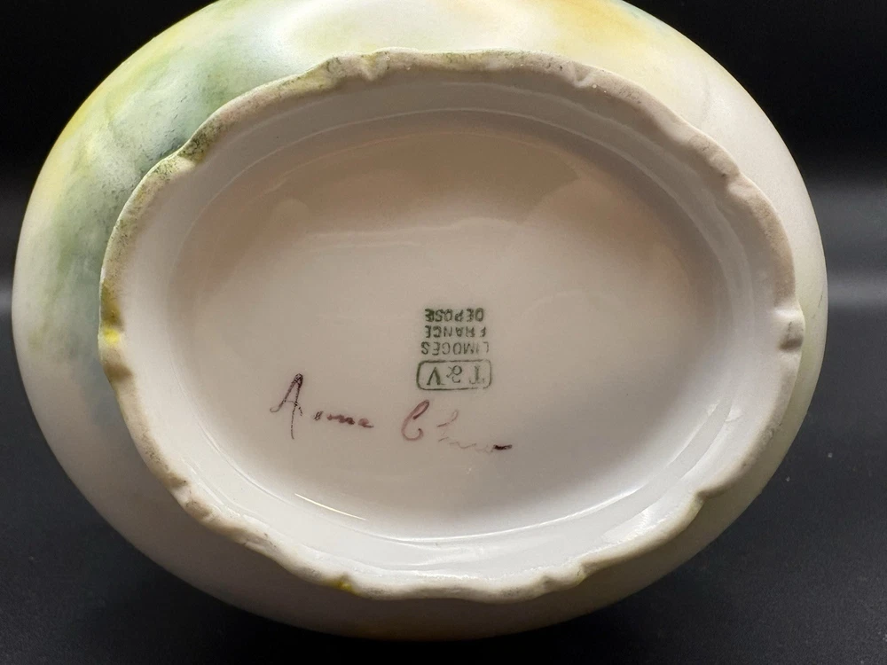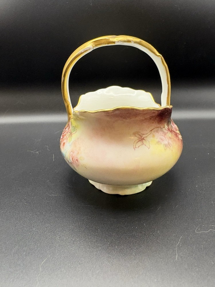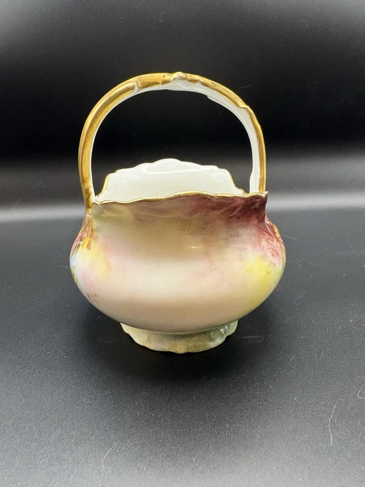 This product is a T&V Limoges Porcelain Hand Painted Basket, originating from France. The basket features intricate hand-painted details, with a gold accent and a beautiful rose flower design. Made from high-quality porcelain, this original piece showcases the craftsmanship and elegance of Limoges, making it a unique and exquisite addition to any collection or decorative display. There is some slight fading on the gold of the handle. The item is signed on the bottom by All items are sold as is. We do our best to photograph any imperfections and list marks, scratches, or any other damage in the description. If you have any questions regarding an items condition please feel free to send us a message.