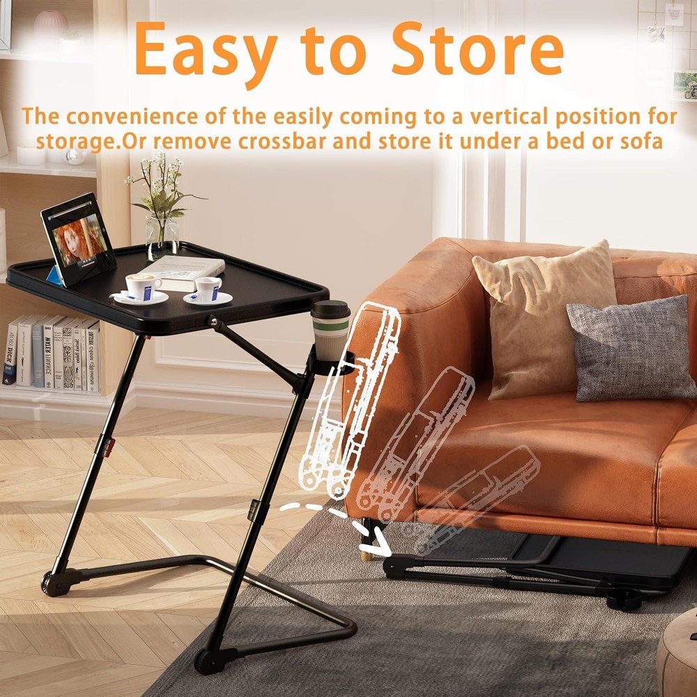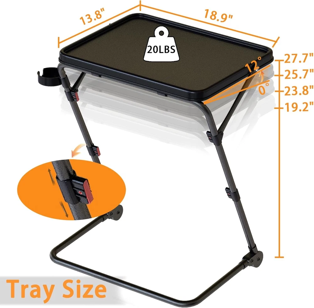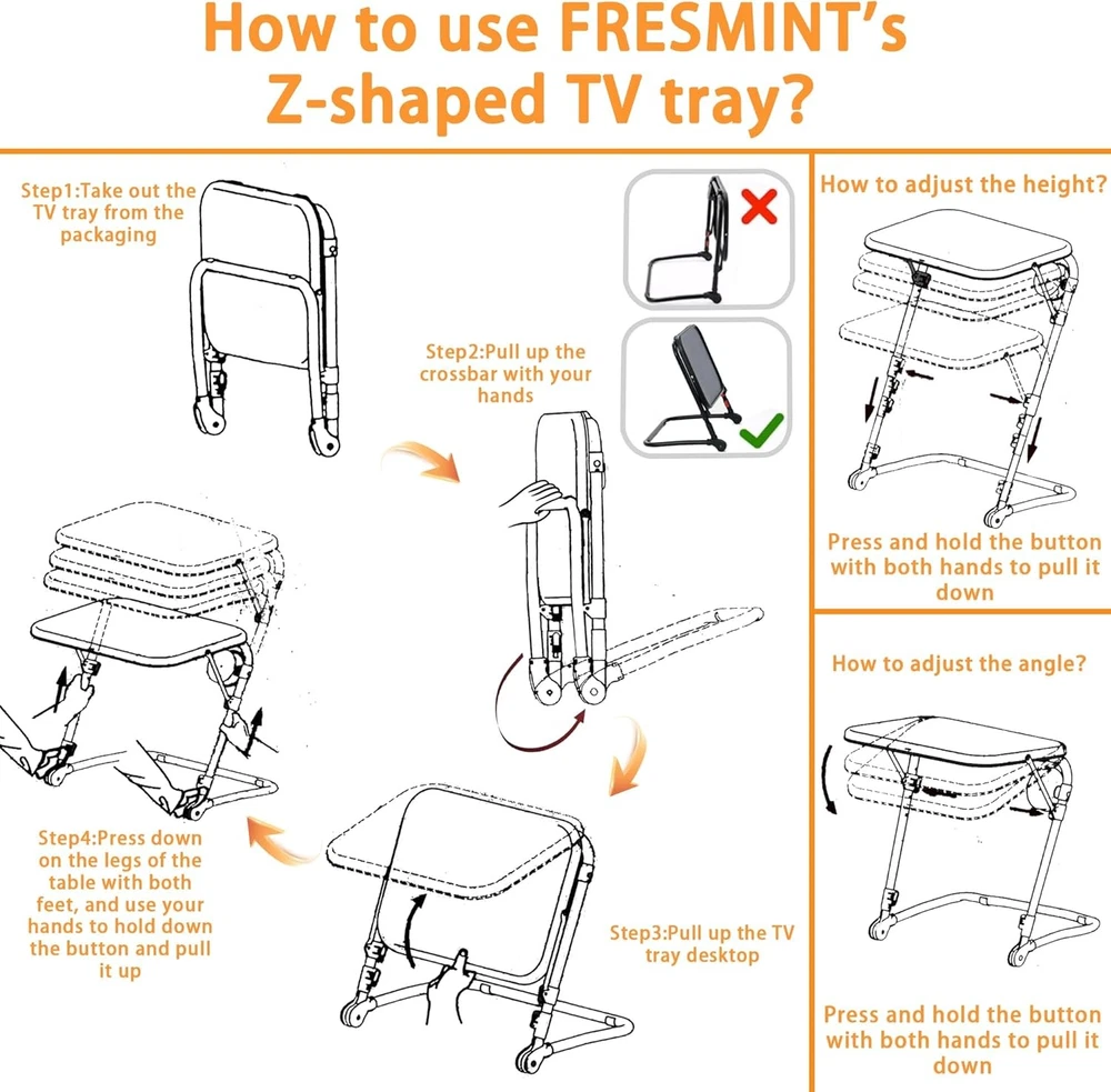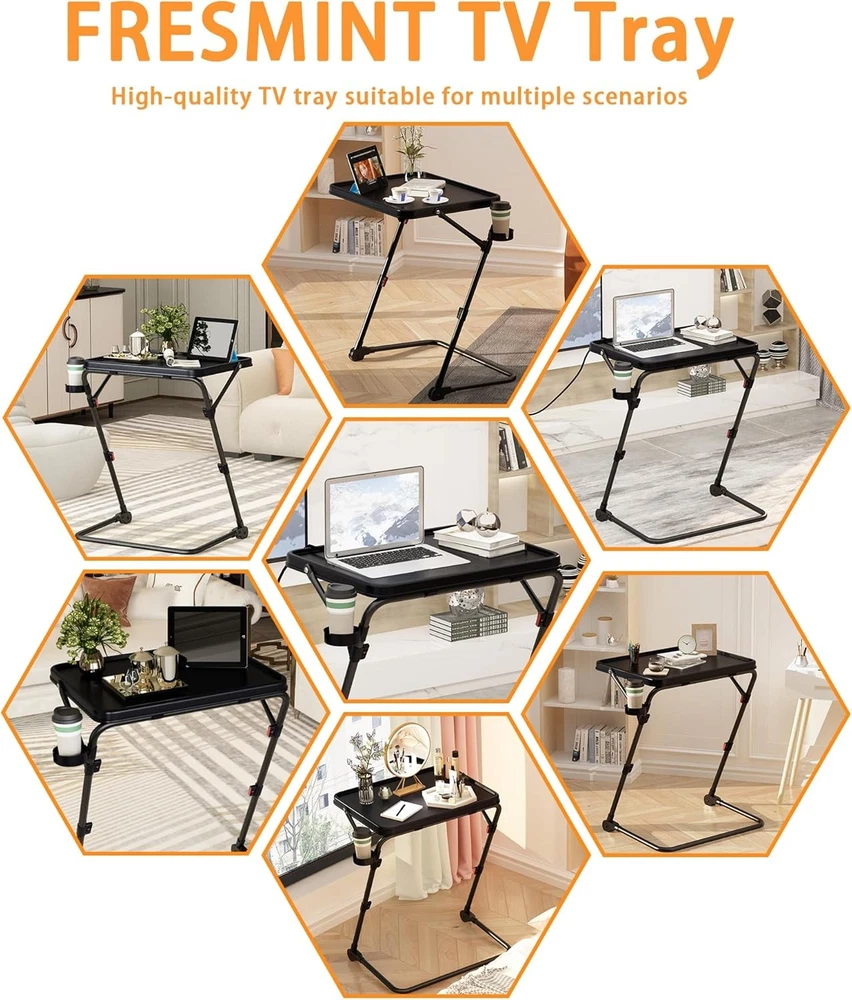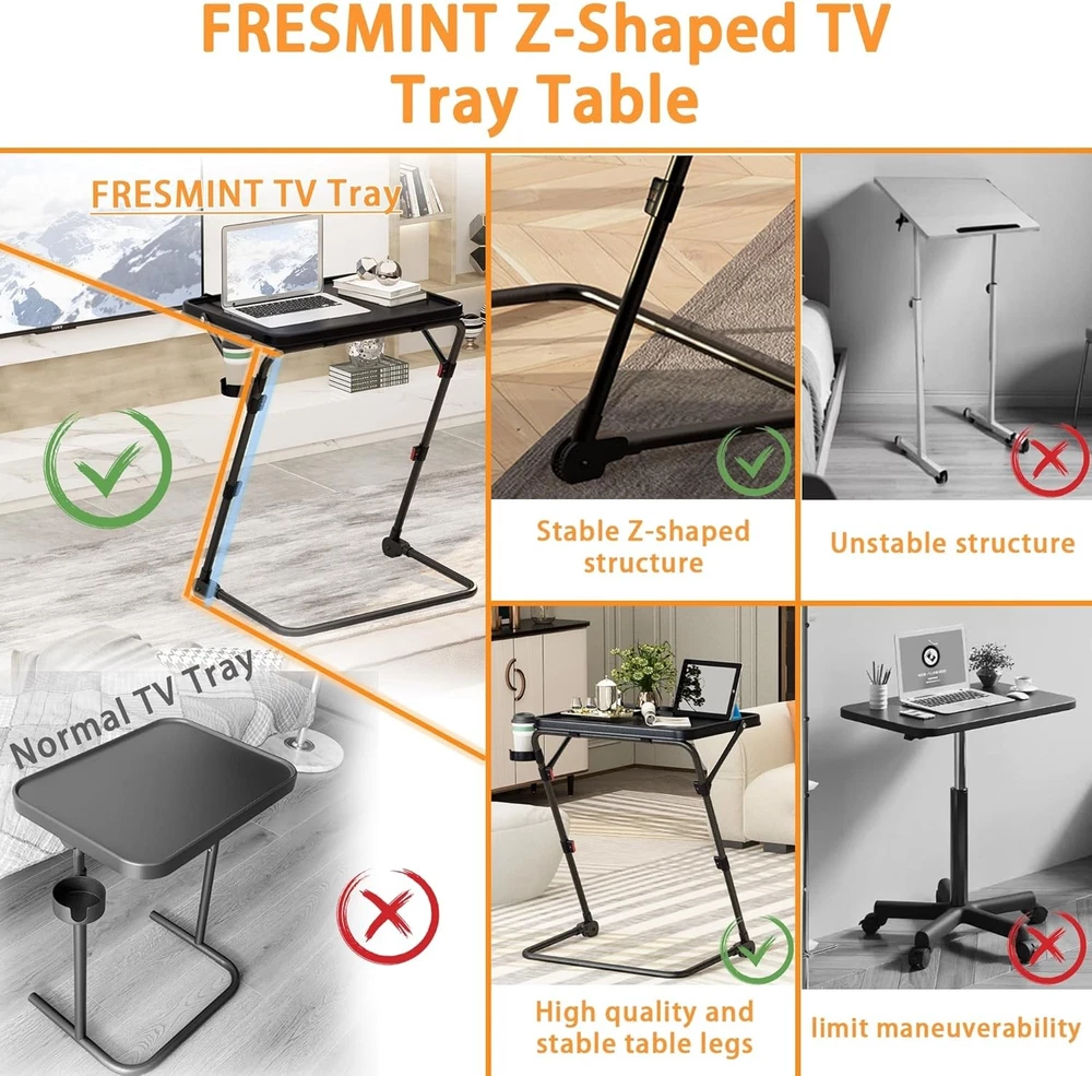 Product Description Previous page Next page 1 FOR COUCH 2 FOR LIVING ROOM 3 FOR BEDROOM 4 FOR DRESSER Waterproof Function The desktop has excellent waterproof function, which can be restored to its original state by gently wiping it with a cloth Z-shaped Structure The unique Z-shaped structure TV tray table not only looks beautiful, but also greatly improves stability Stabilizing Footpads High quality foot pads provide excellent support for excellent TV trays Space Saving The TV tray can be easily stored without taking up too much space, making it an excellent choice for small spaces Fresmint TV Tray How to Use? Step1 : Take out the TV tray from the packaging Step2 : Pull up the crossbar with your hands Step3 : Pull up the TV tray desktop Step4 : Press down on the legs of the table with both feet, and use your hands to hold down the button and pull it up The video showcases the product in use. The video guides you through product setup. The video compares multiple products. The video shows the product being unpacked. TV Tray Table Merchant Video Is it difficult to assemble this TV tray? No,Its assembly process is very simple. our TV Tray has pictures and videos of auxiliary assembly. Convenient for every buyer to assemble the TV Tray What is the difference between it and other TV trays FRESMINT TV Tray has a unique Z-shaped structure. While ensuring excellent appearance, it also has good stability.And equipped with cup holder What can be placed on the desktop? The FRESMINT TV Tray Table has a load-bearing capacity of up to 20 pounds, allowing you to easily place your computer, laptop, headphones, food, and more on top Where is this TV tray suitable for? Its unique Z-shaped structure is suitable for many places such as bedrooms, sofas, dining rooms, living rooms, and so on