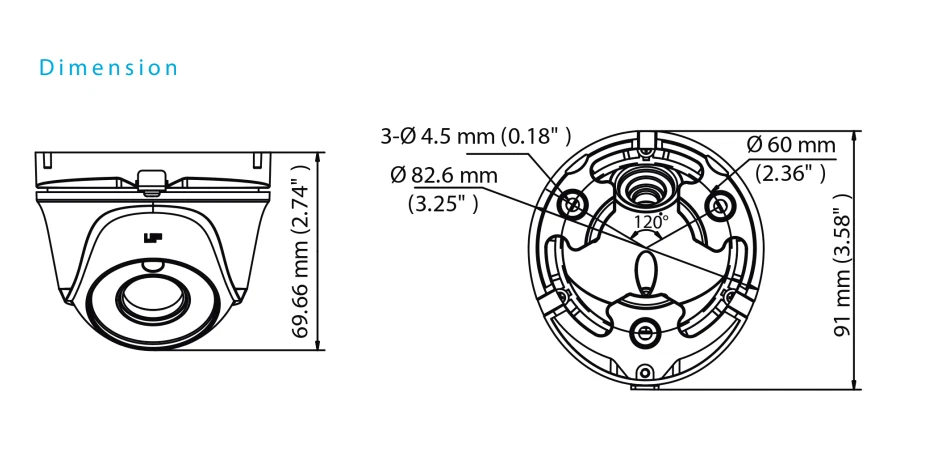 Features: Resolution: 1920 x 1080 (2 MP) Minimum illumination: 0.01 Lux@(F1.2, AGC ON), 0 Lux with IR Fixed lens: 2.8 mm 65 ft IR EXIR. Horizontal Field of View: 103° Switchable (TVI / AHD / CVI / CVBS ). Physical and Electrical Features : Operating temperature:-40 °F to 140 °F Power supply: 12 Vdc / 4 Watts. Application: Indoor/ Outdoor IP66. Material: Metal Dimensions: 85.4 x 76.12 mm Weight: 0.51 lb Warranty: 5 years.