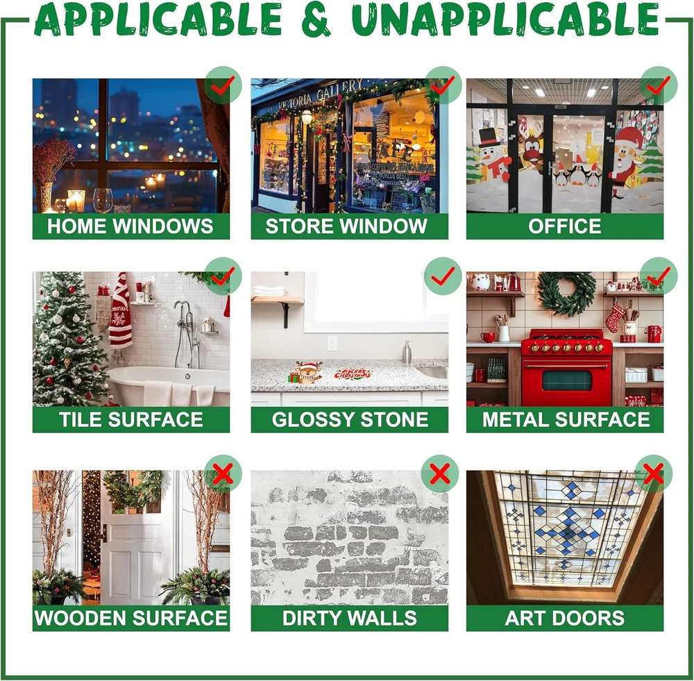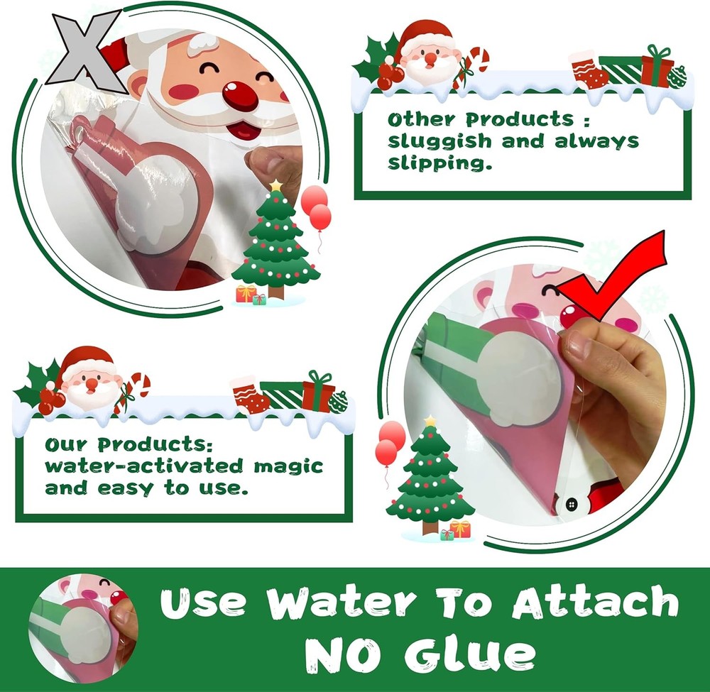 T&W SAME FILM Christmas Window Clings Stickers for 12in X 14in, Colorful LuxeFusion Product Description Features Package Contents: 6 sheets Christmas-themed window clings decorations. 1 Santa Claus design + 1 reindeer design + 1 “Merry Christmas” text with 3 hanging gift strip designs + 1 hanging stocking and Christmas tree strip design + 2 designs featuring 3 different-sized snowflakes and white dots, totaling 71pcs. Each window clings measures 12 inches × 14 inches (approximately 30.5 cm × 35.5 cm). Premium Christmas Window Decoration Materials: Made from high-quality PVC, these christmas decor are waterproof and fade-resistant. Utilizing static adhesion, they require no glue during application and leave no residue when removed. Even better, our Christmas window stickers are fully reusable! Usage Instructions: First, thoroughly clean the surface. Then spray water onto smooth surfaces such as glass doors, windows, mirrors, cars or refrigerators before applying the stickers. Finally, gently wipe away any remaining moisture from the surface. Once applied, these lively and adorable window clings will stay put throughout the entire Christmas season without peeling off. Unique Christmas Room Decor: These decoracion de navidad make the perfect decoration for Christmas and all kinds of parties. Since our window decals are large enough, you can clearly see these adorable, lively designs from a distance. They're suitable for many occasions, such as Christmas parties, homes, school, classroom, offices, clothing stores, restaurants, cafes, and other commercial spaces. Best Gift:T&W SAME FILM Winter window clings are premium and elegant, making them the perfect gift for friends, family, loved ones, fathers, mothers, sons, daughters, grandchildren, girlfriends, boyfriends, colleagues, and more. Let your family and friends experience the festive spirit of Christmas in the most convenient way. Product Details Brand: T&W SAME FILM Color: Colorful Recommended Uses For Product: Car, Classroom, Glass Door, Wall, Water Bottle, Window Theme: Christmas Cartoon Character: Christmas Special Feature: Peel and Stick, Removable, Repositionable, Reusable, Waterproof Number of Pieces: 6 Style: Modern Reusability: Reusable Item Form: Cling Pattern: Scenic, Text, Abstract Indoor/Outdoor Usage: Indoor, Outdoor Finish Type: Glossy Animal theme: Reindeer Water Resistance Level: Waterproof Number of Items: 71 Target Audience: Boys, Girls, Men, Teachers, Women Seasons: Winter Product Dimensions: 8.3"L x 6.7"W Set Name: 001 Size: 12in X 14in Item Weight: 5.9 ounces Manufacturer: T&W SAME FILM Item model number: 001 Item dimensions L x W x H: 14 x 12 x 0.2 inches Surface RecommendationMaterial: GlassPolyvinyl Chloride Surface Recommendation: Glass Material: Polyvinyl Chloride ShapeUnit Count: Rectangular71.0 Count Shape: Rectangular Unit Count: 71.0 Count Free Shipping All orders ship free and fast to your doorstep. Easy Returns Satisfaction guaranteed. 30-day returns, no questions asked. 24/7 Support Contact us anytime; we’re here to help, day or night. Brought to you by LuxeFusion – Quality you can trust.