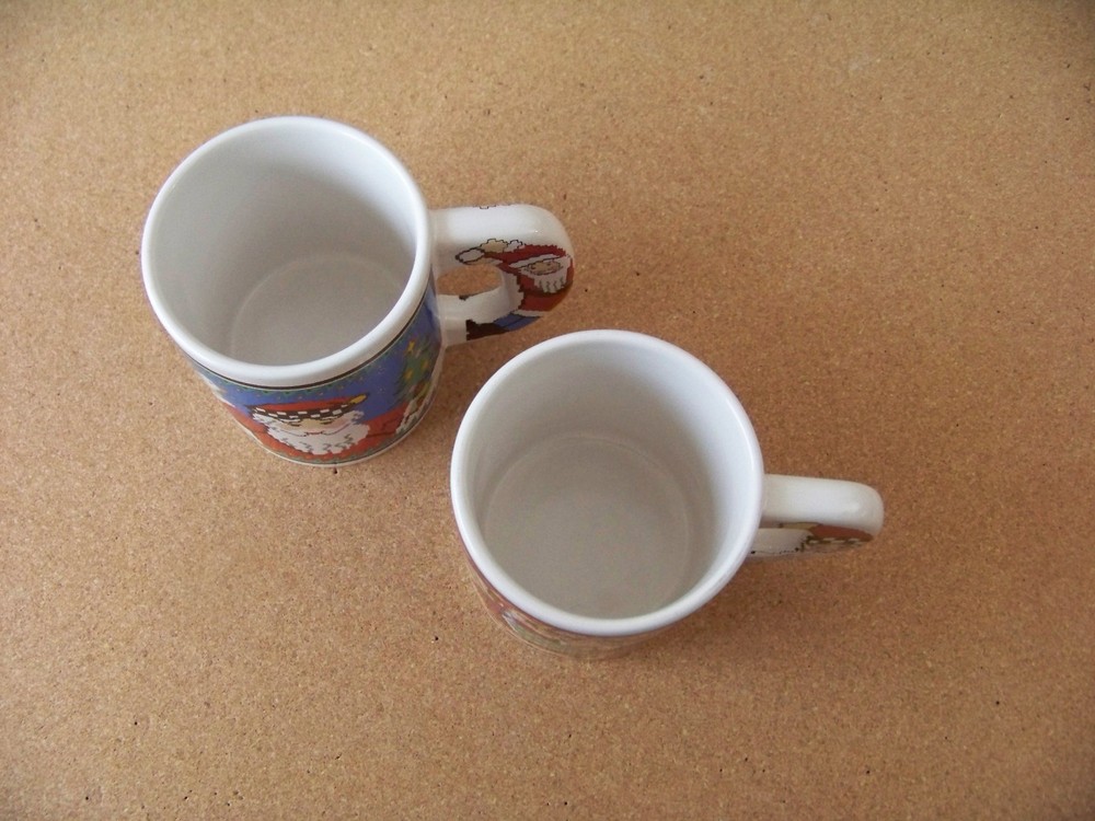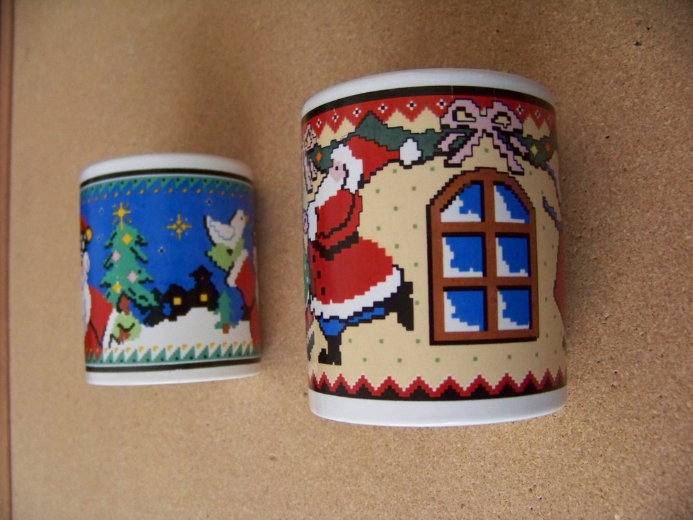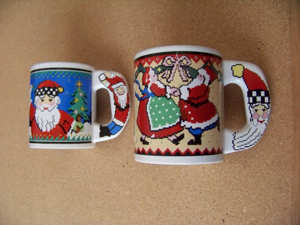 TWO Santa Claus cross-stitch type design ceramic mugs coffee cups - decorated flat handles These mugs measure about 3.7" tall and the openings are about 3" in diameter. Excellent condition, no chips or cracks. Minor nicks and marks. Don’t forget to click on my "Stores" link, next to my eBay name, to see other items I currently have listed for sale, or you can copy and paste this address into your browser: stores.ebay.com/highcountrycollectibles SHIPPING INFORMATION Shipping to U.S. addresses is FREE! HIGH COUNTRY COLLECTIBLES Since 1989 – A LEADER IN THE DENVER SPORTS MEMORABILIA MARKET. Check out my other auctions and listings, and keep an eye out for the different, unusual, and EXCLUSIVE items available nowhere else but from High Country Collectibles.